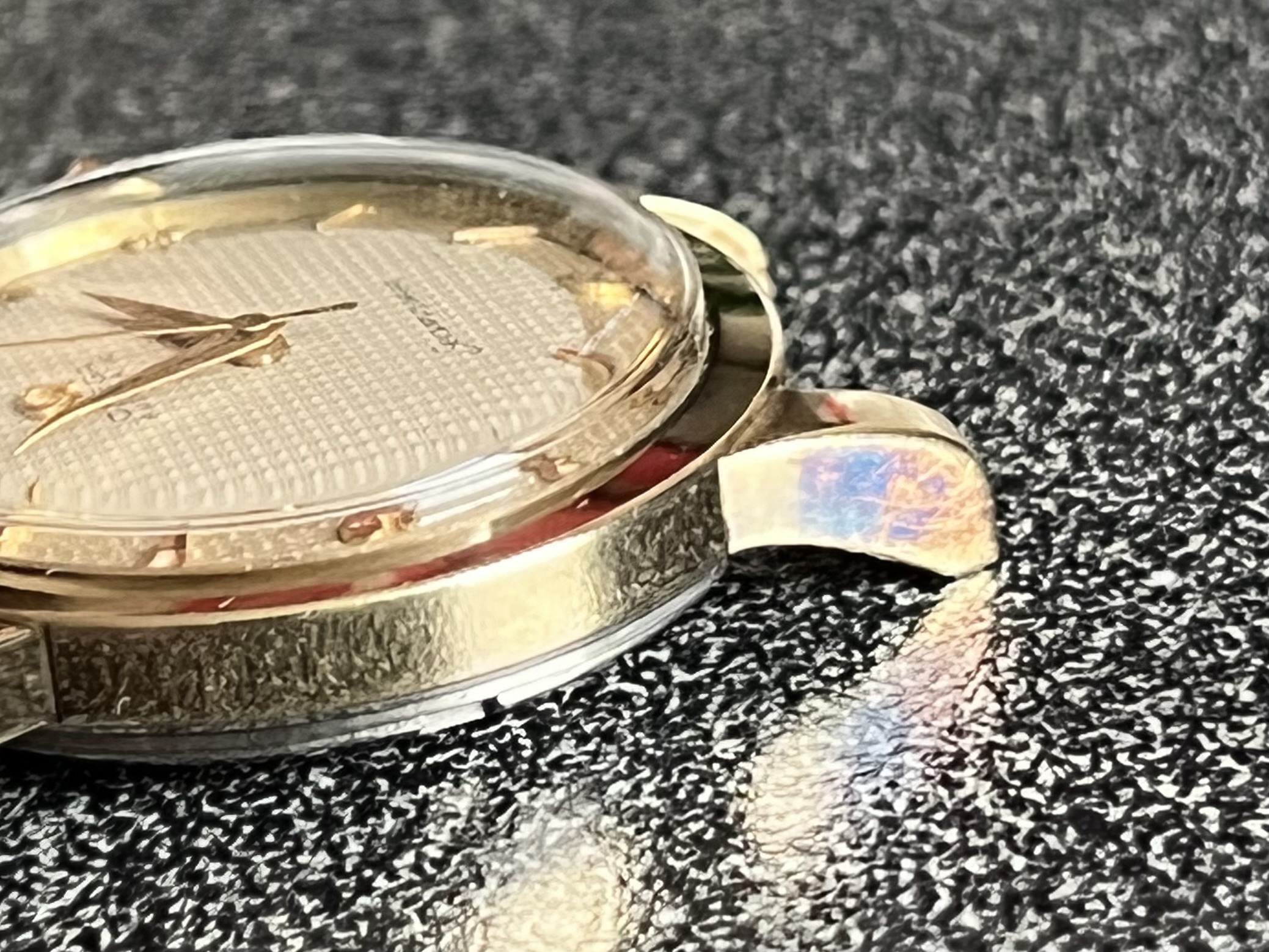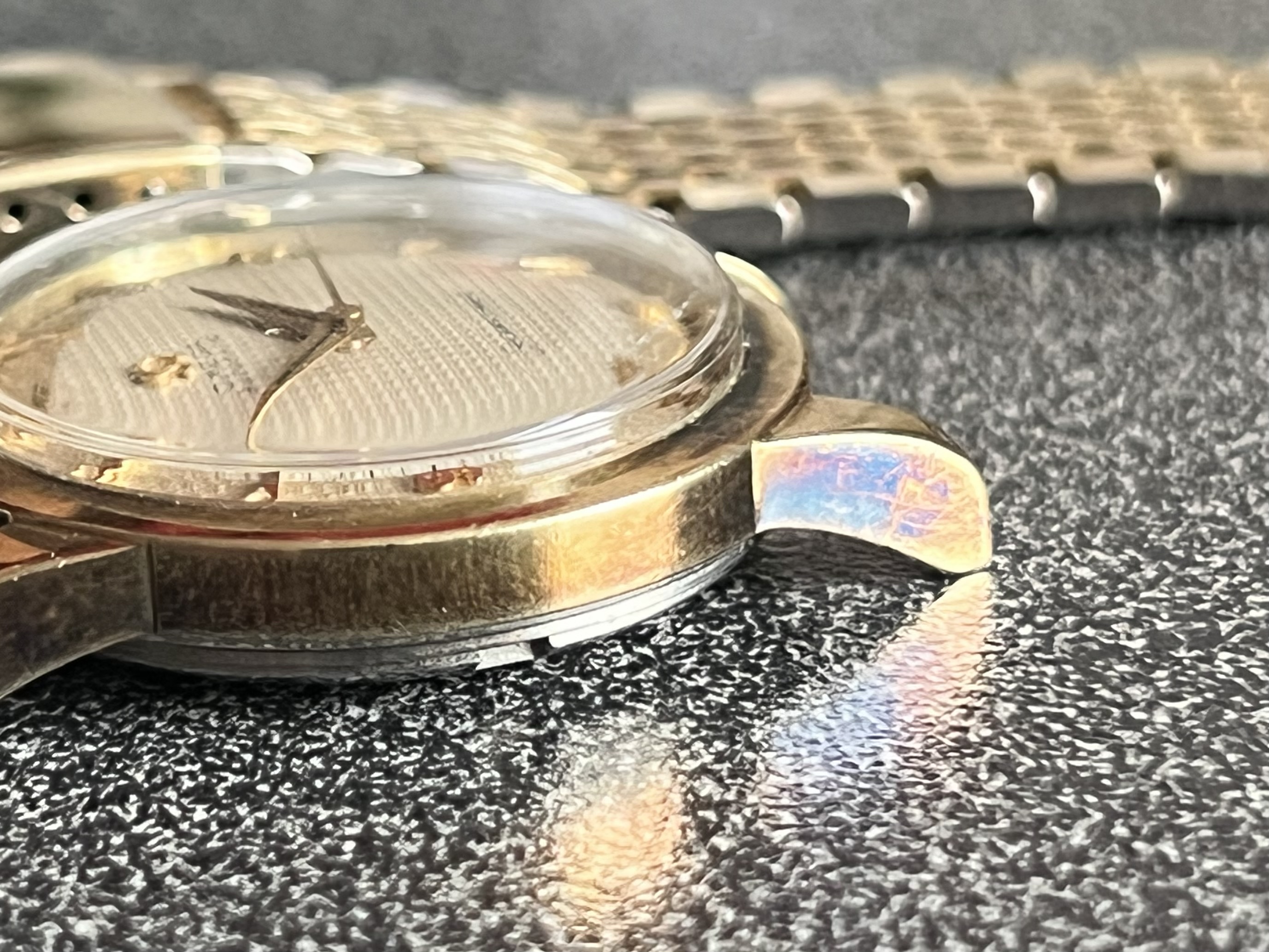 -The gold-capped case shows massive discoloration, which I take as an overall good point. A gold cloth removes these within seconds, but most of all it's the best sign the case hasn't been tampered with for a very, very long time. Lugs are thick and don't look like there's much (if any) meat missing. Note that there are different case styles for 2577s, and this one didn't have the beveled lugs we know from 2846s, for example.