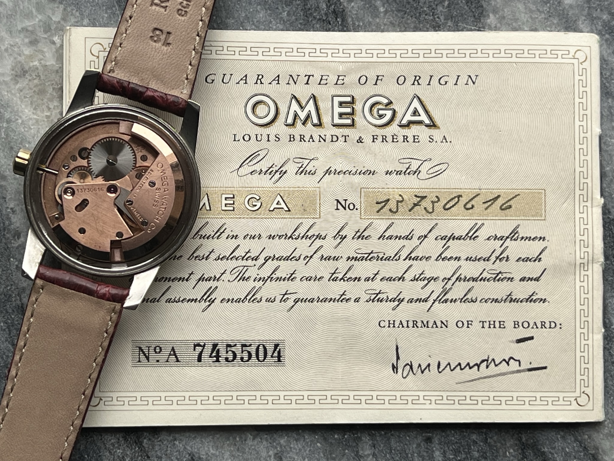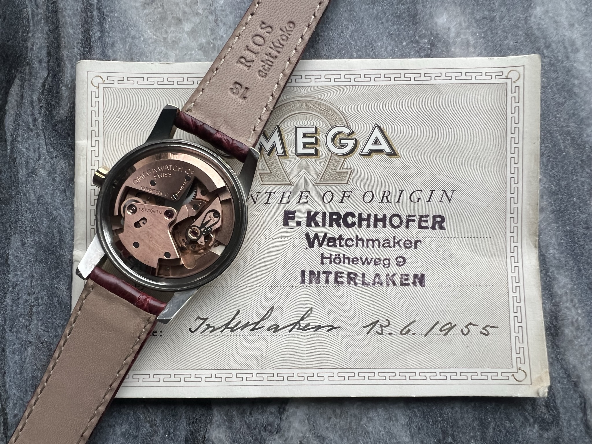 -The 137xx serial, as shown on the papers, means roughly 1953. The watch itself was sold in '55, also not unheard of. Case style, cal. 354 (instead of 351) and the Seamaster name on the bottom of the dial all correspond to a later example of this reference, so it all alligns. I know now that the "bubble-shape" caseback, as well as the sub-reference 2577-24, also add up nicely to this being a later example of the 2577s.
