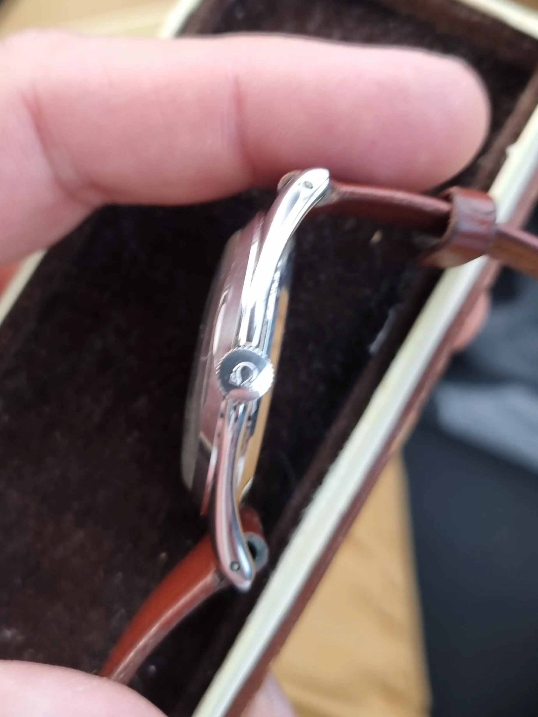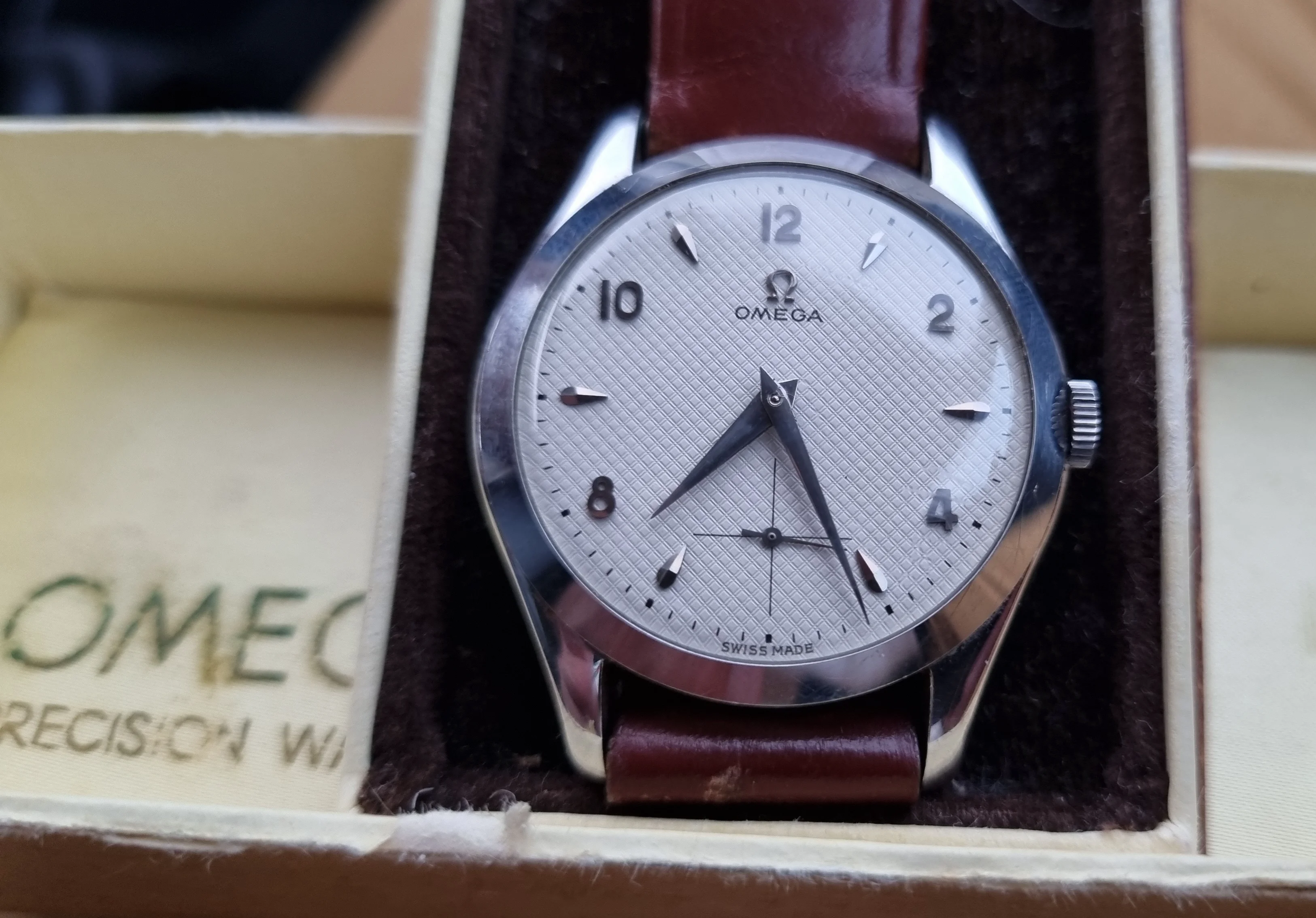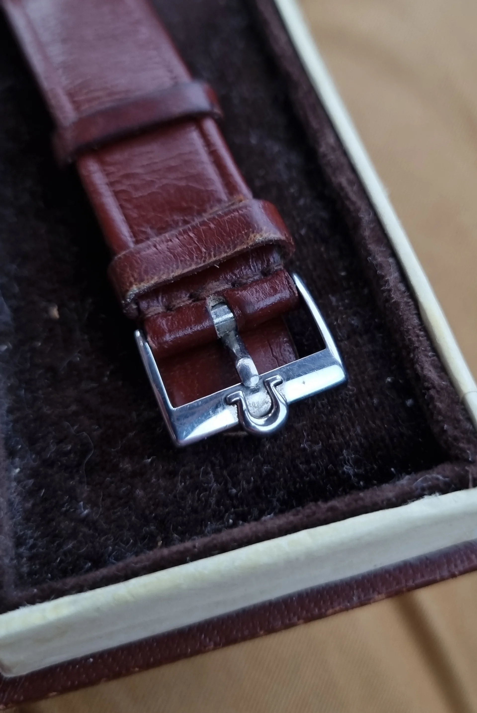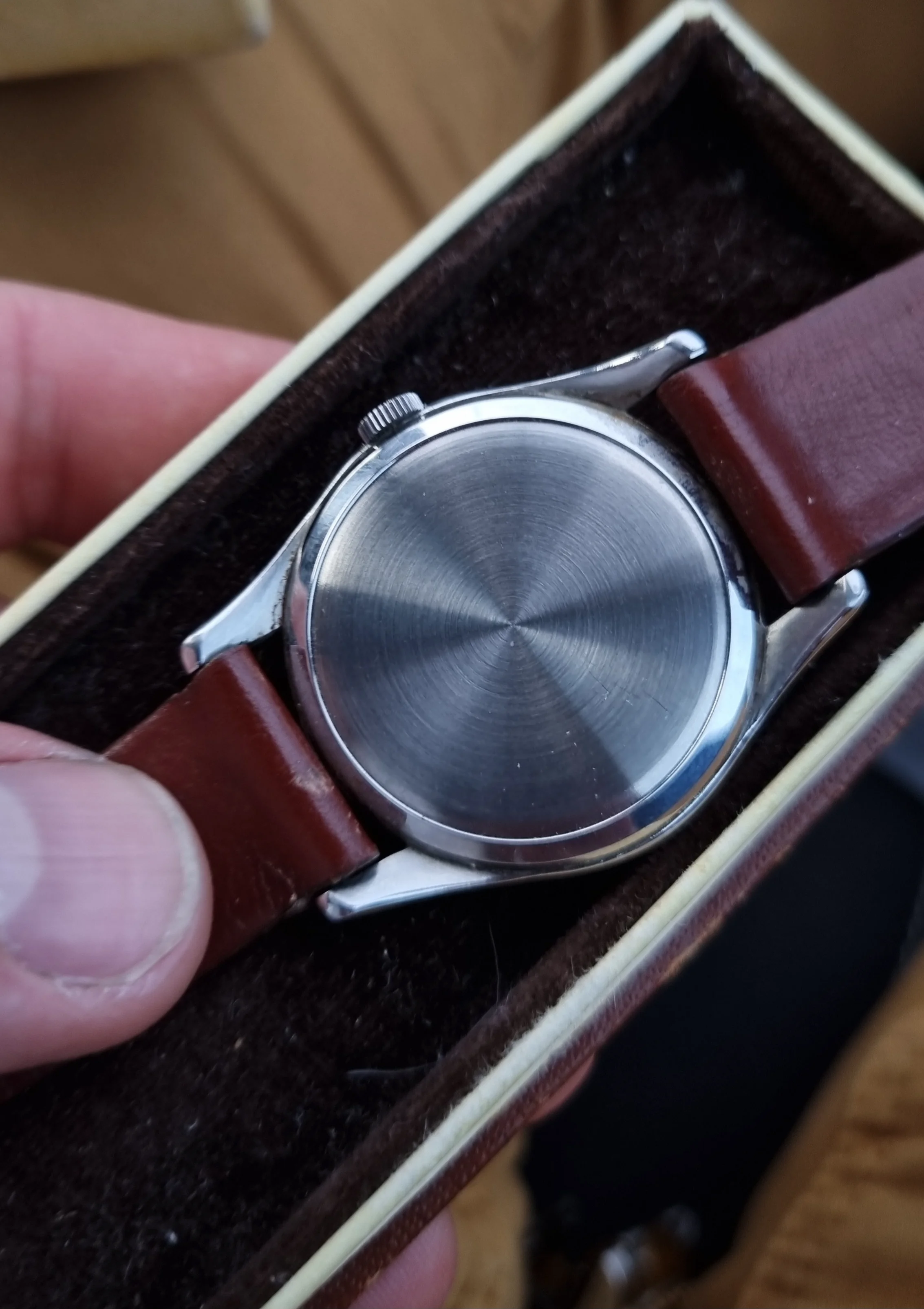 I find it at one watch fair , it came on old brown leather strap , with original buckle and box.