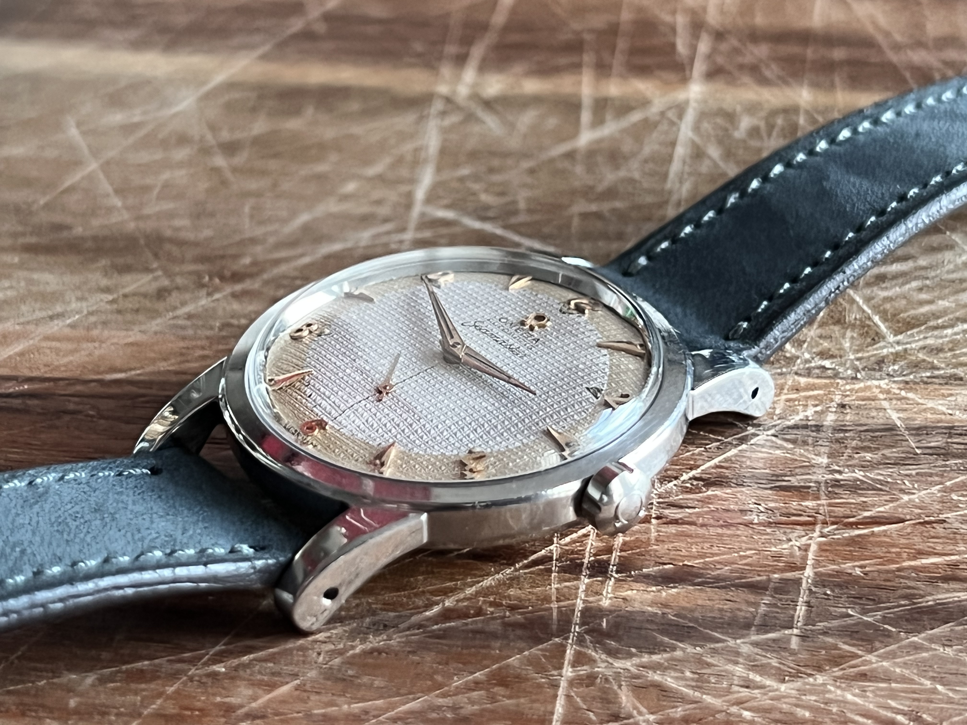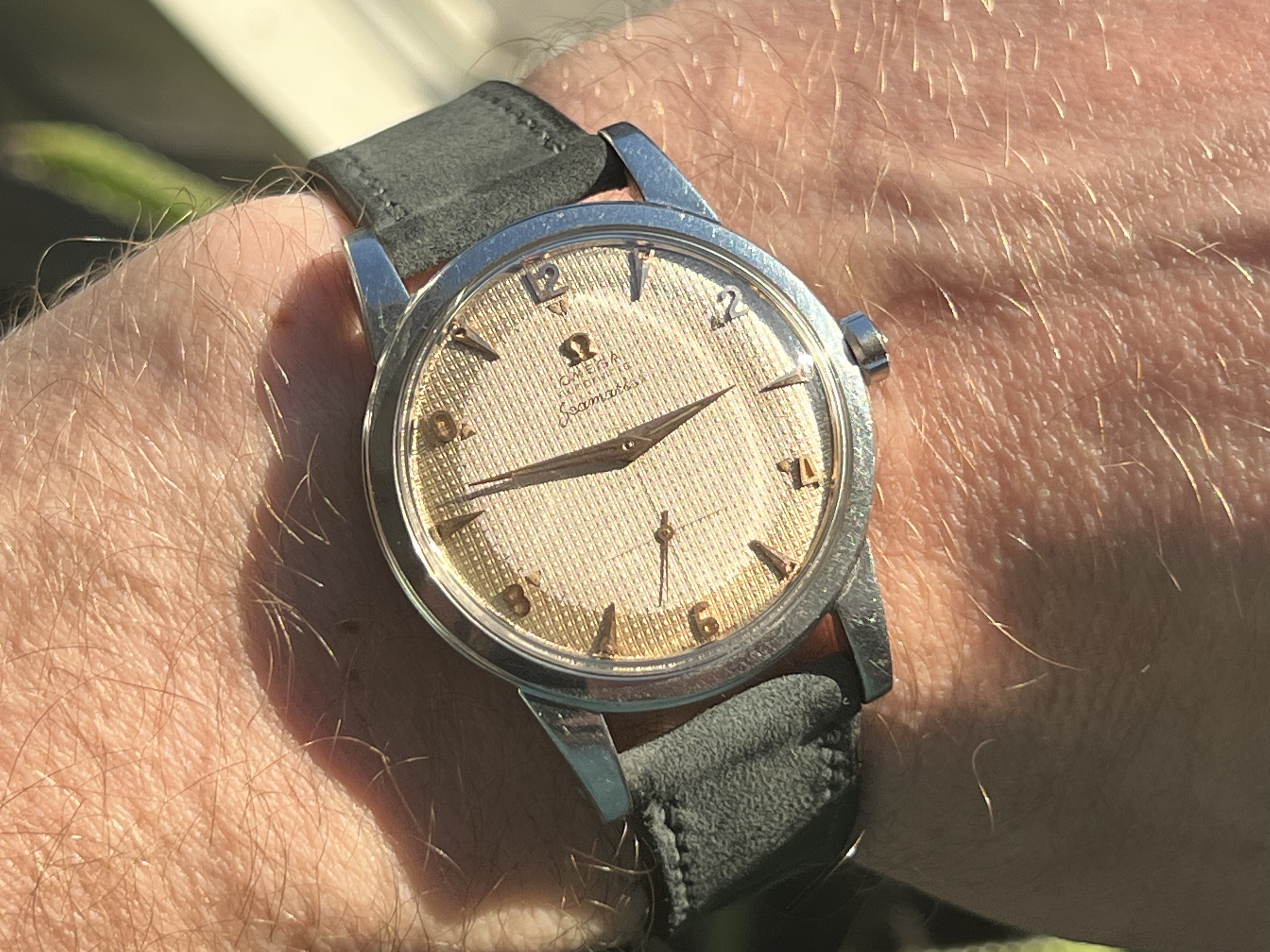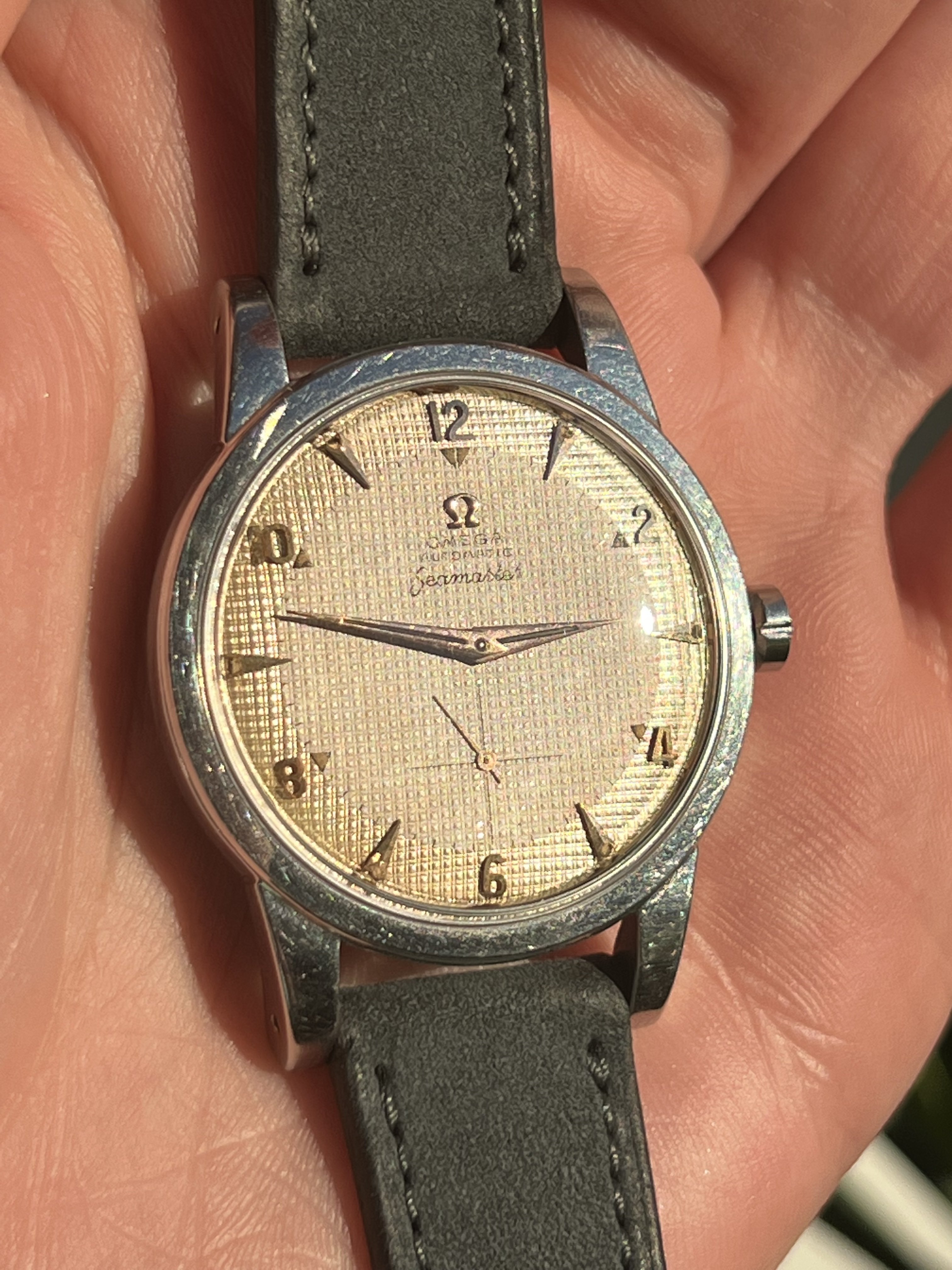 This one is a ca. 1953 Omega Seamaster 2657 - a 36mm “jumbo” reference. Stainless steel case, rose gold furniture, and most importantly a two-tone dial with, once again, a hobnail structure. And boy, do I like them.