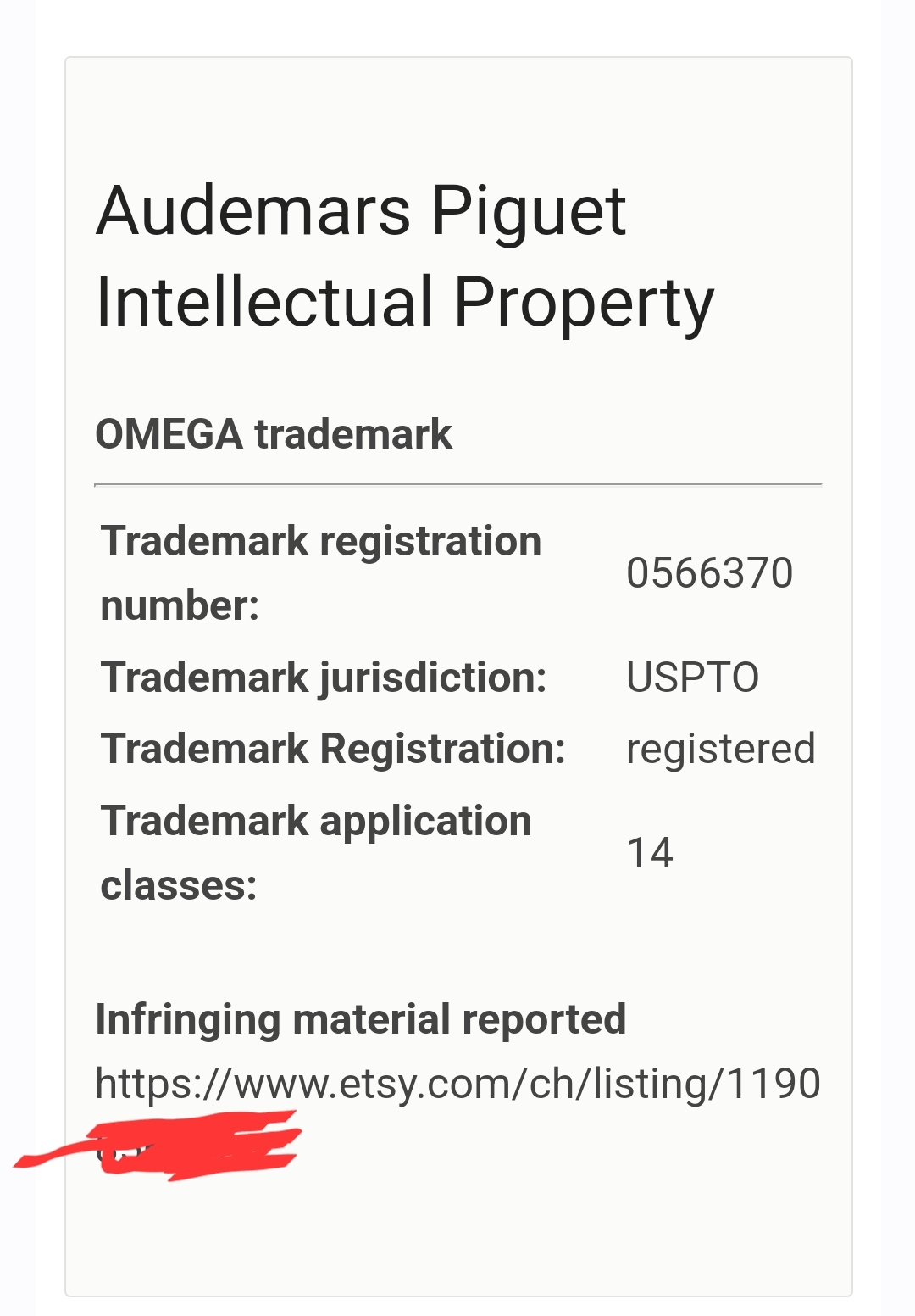 I have an Etsy store which sells a mix of antique jewellery, art and watches. Today I received a takedown notice for alleged patent infringement from Audemars Piguet. I have already contacted a solcitor (though I have a legal background) and will be issuing a DMCA Counterclaim in due course.