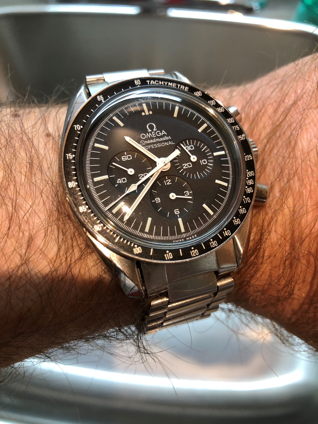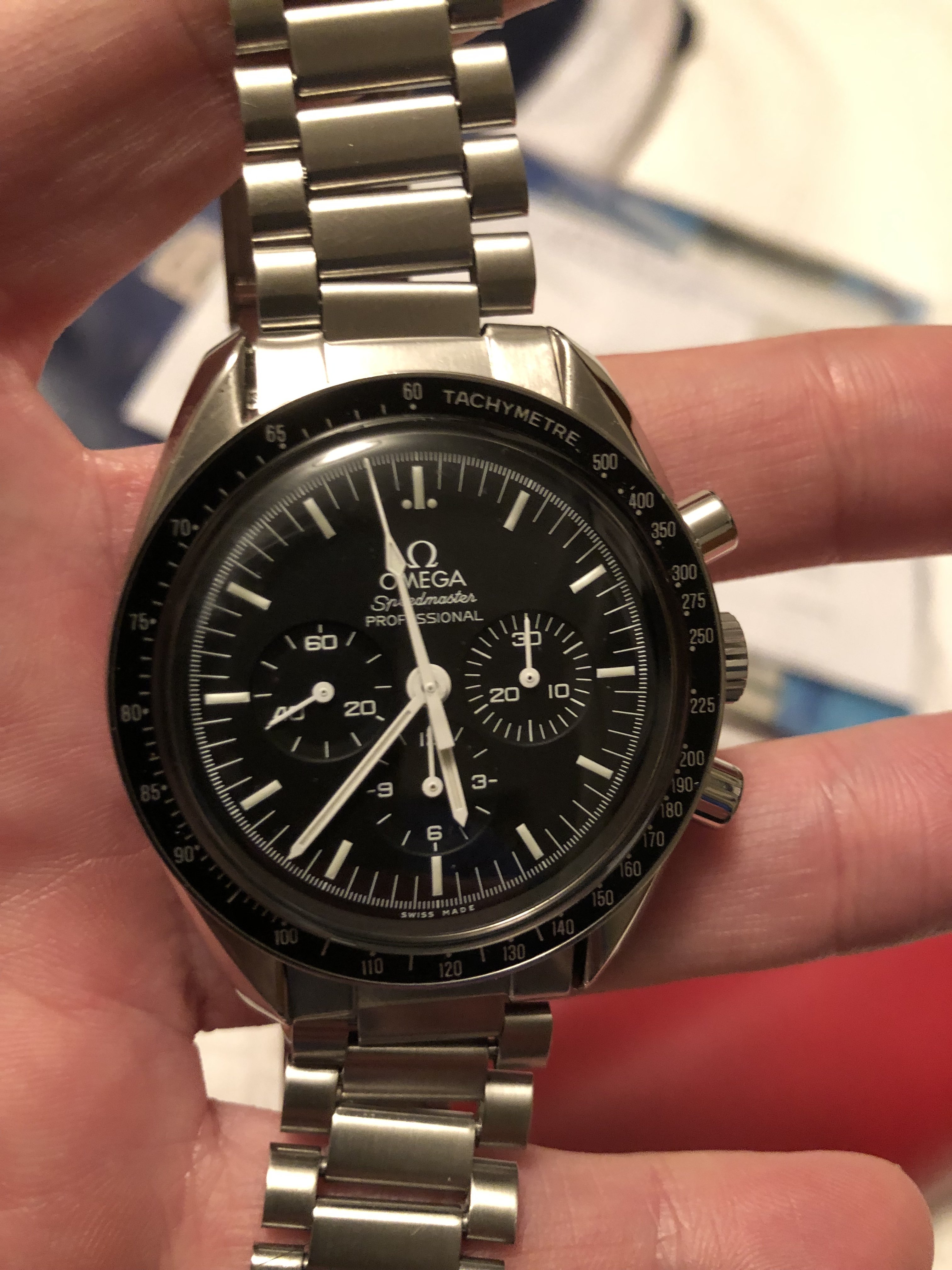 So here’s something that can’t be good - Shaking the watch starts it up again. The shipping box it came in took a good hit - could that have damaged it? It was packed half decently - and the watch inside an Omega SA servicing box.