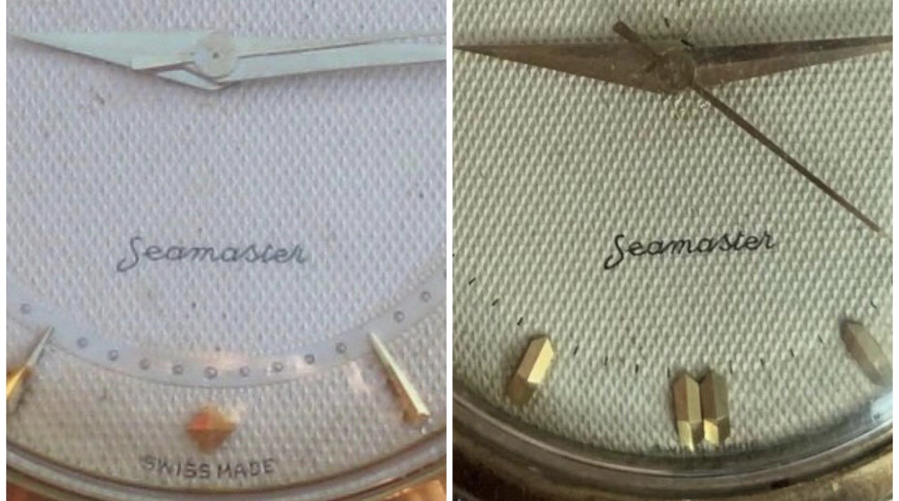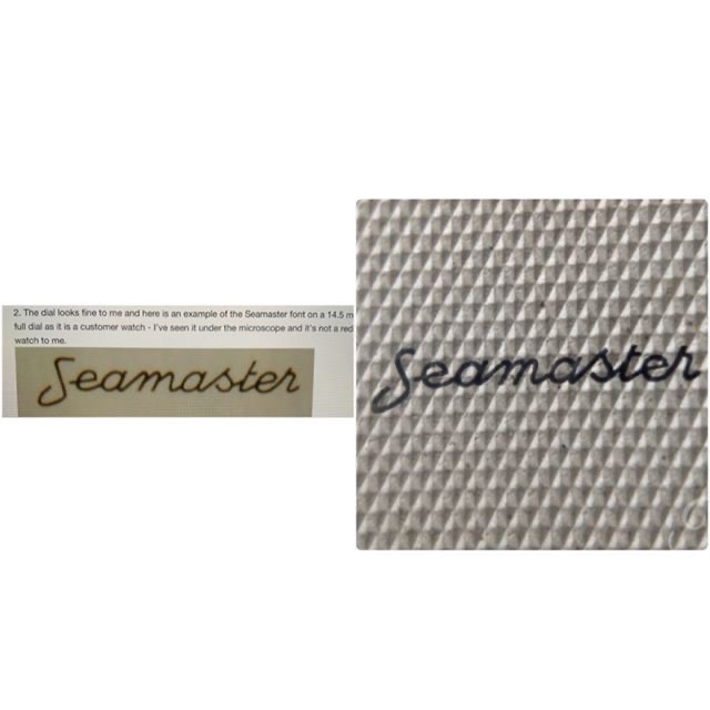 (it's hard to interpret due to textured dial style; different style of “S”in the “Seamaster” word)