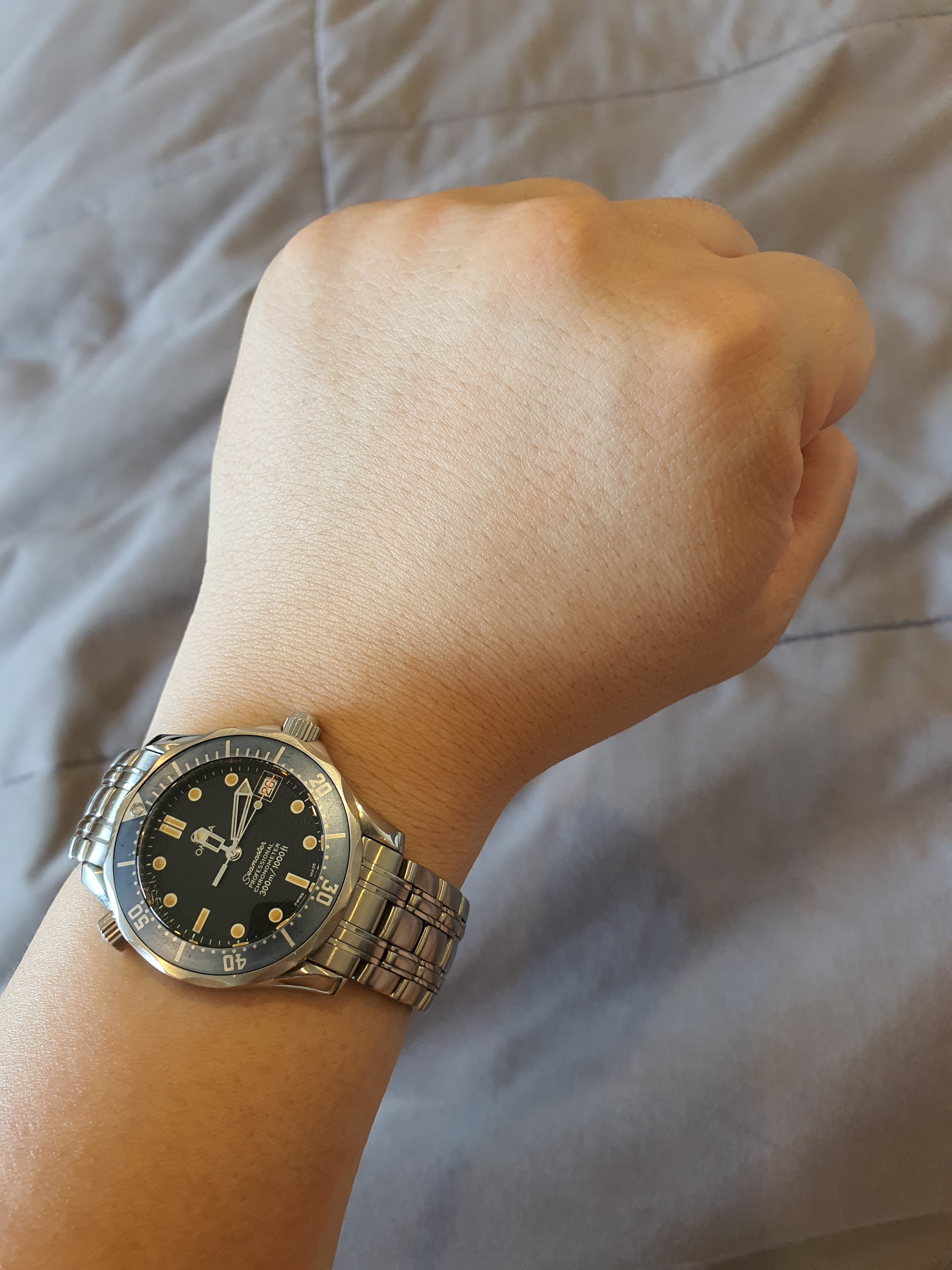 ·I have worn a mid size Seamaster pretty much daily for about 15 years. I did consider a full size one, and tried both, but the mid size just felt ‘right’. I wasn’t aware that the size of the watch was a ‘thing’ back then, so I never gave it a second thought! I still love wearing it. (I have 7 inch wrists).