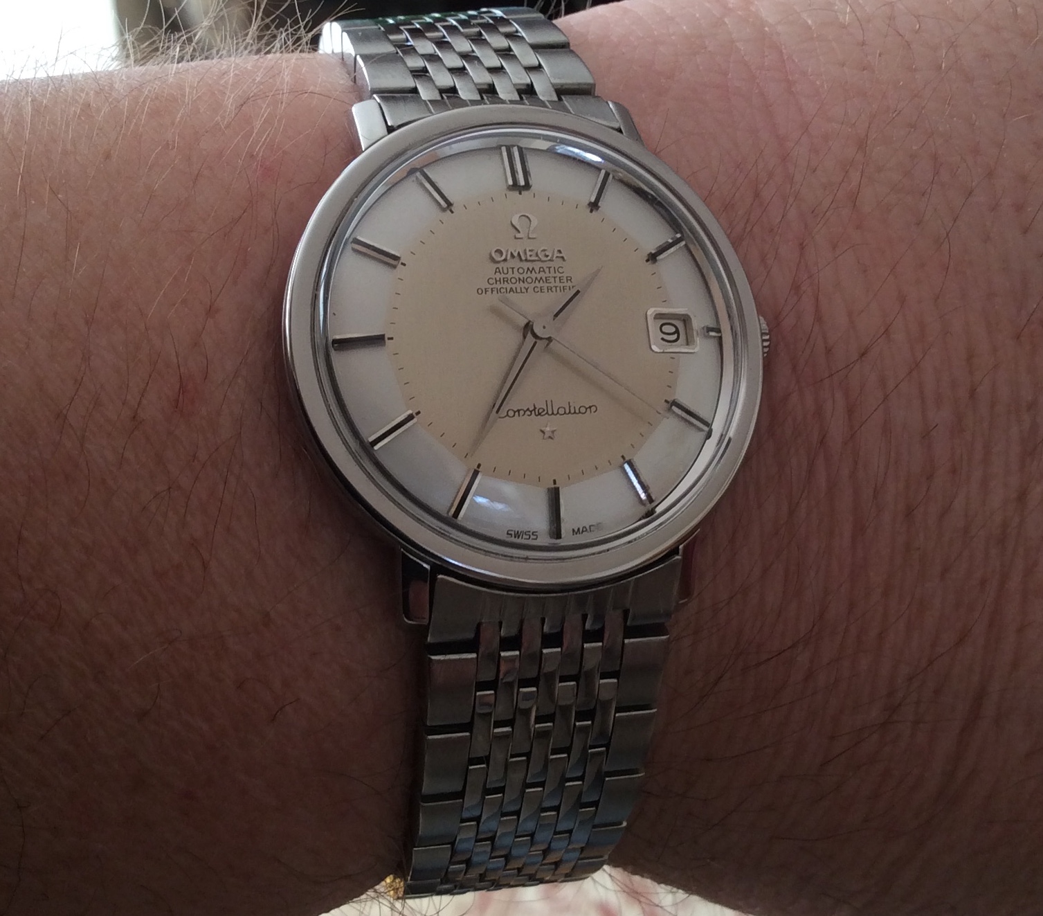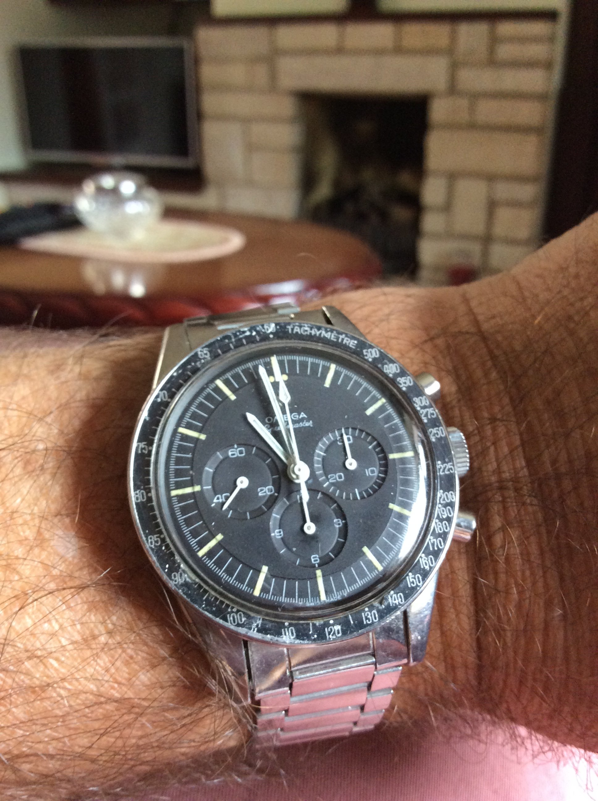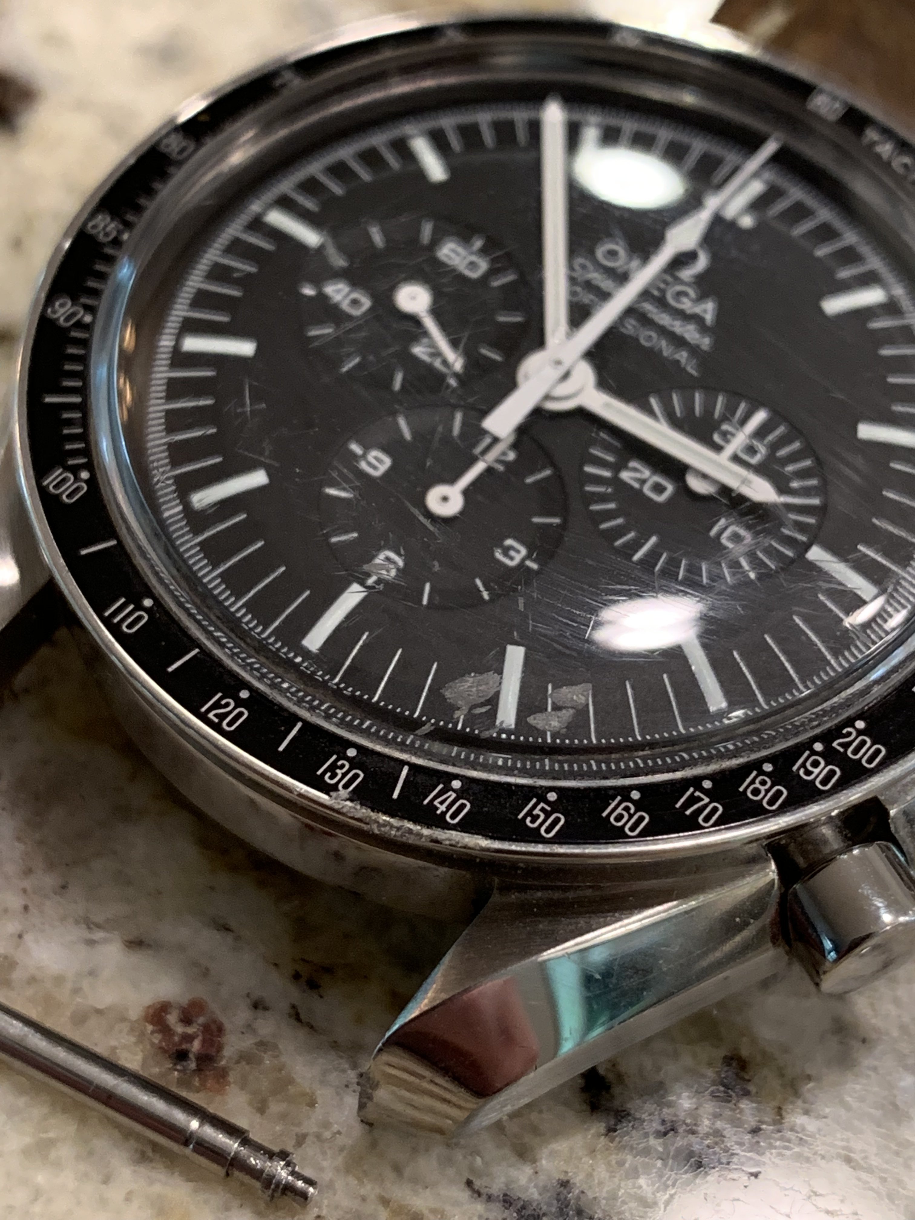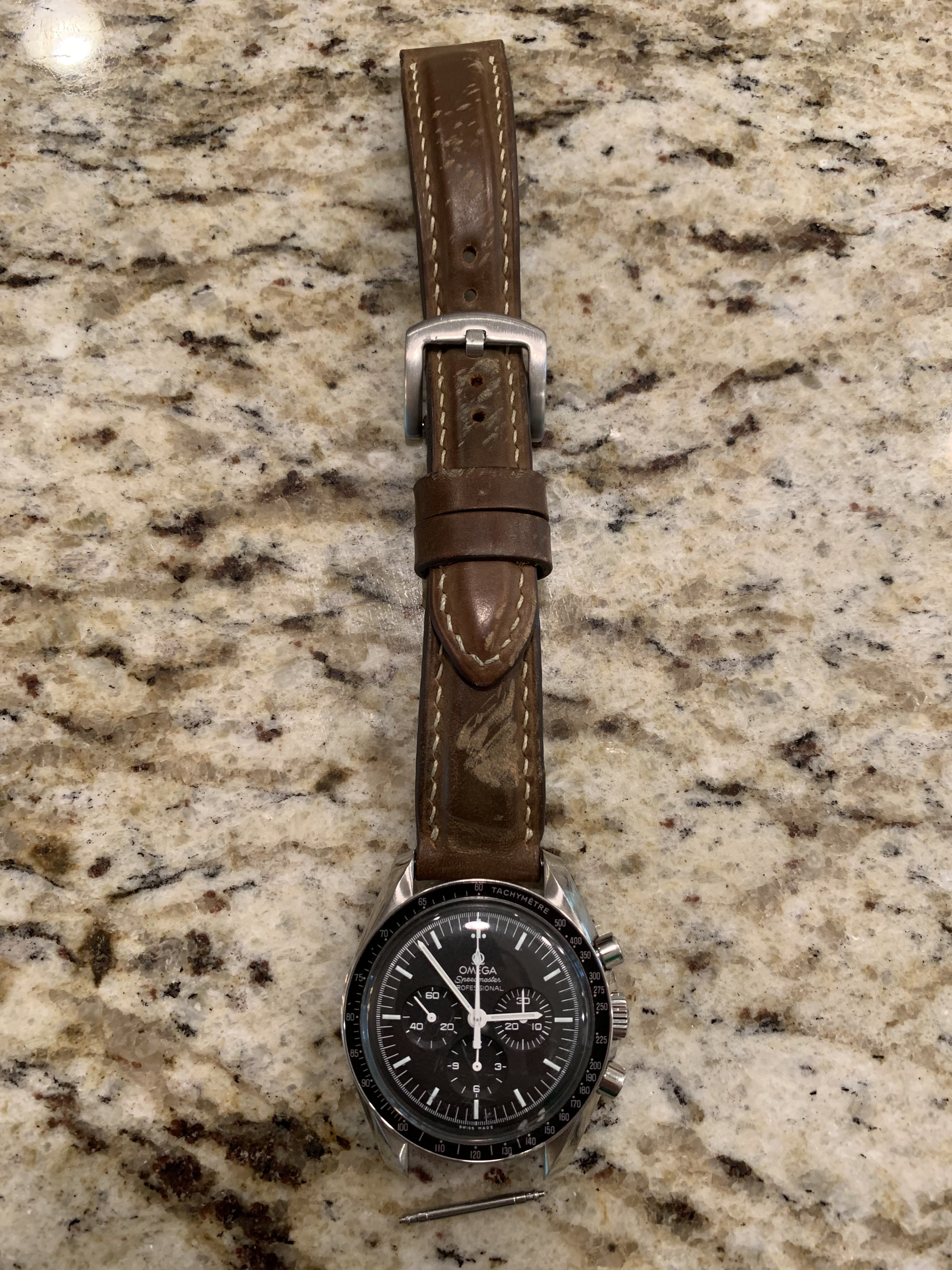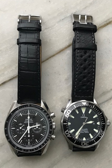 I’m thrilled with the durability of my Omega though. Haven’t posted it here yet, about two months ago I was wearing it on my right wrist and threw a frisbee for my dog. I had it on an aftermarket leather strap that was a bit loose between the lugs. My guess is that the force of throwing the frisbee compressed a spring bar and I THREW my watch down off of the driveway. Bounce twice and slide across my garage floor on the hesalite. My heart stopped for a second and I said some words I regret in front of my children (luckily they weren’t paying any attention).