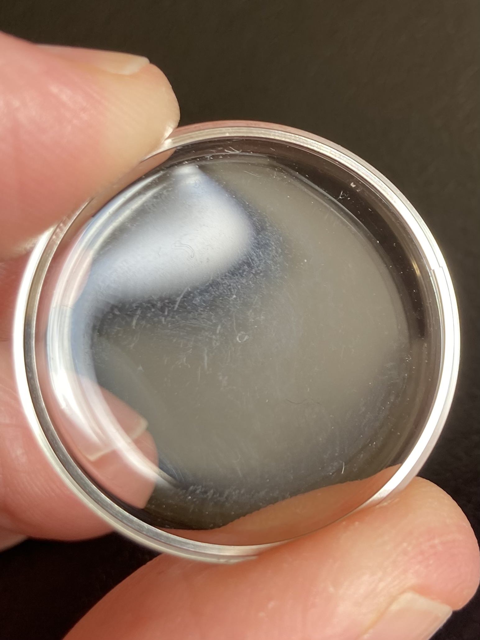 The second problem is the signature, or lack thereof. There is some mark in the center of the crystal, and I guess it's possible that it once was an Omega that has been polished. It seems more likely that it's just a coincidental mark or maybe even a poorly attempted forged signature.