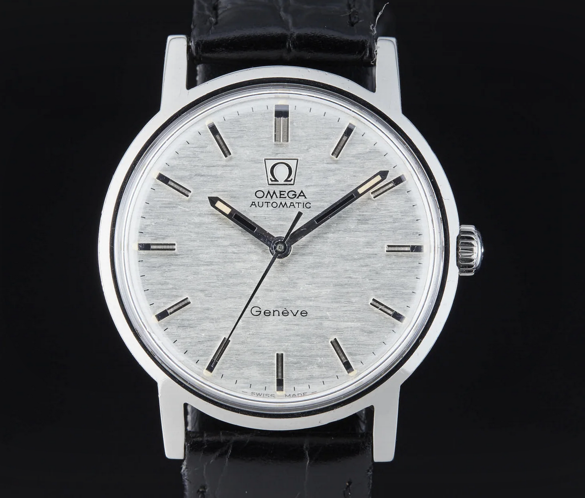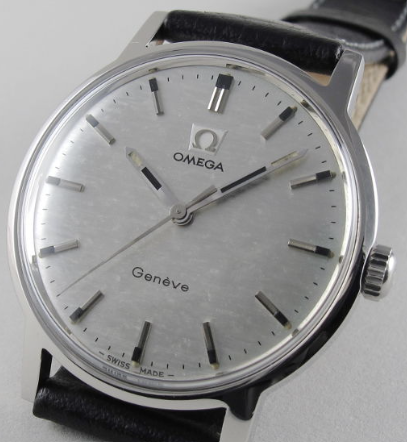 My guess is, that it is the Omega Genève Ref. 135.070 Stainless steel Watch with a linen dial, but automatic?