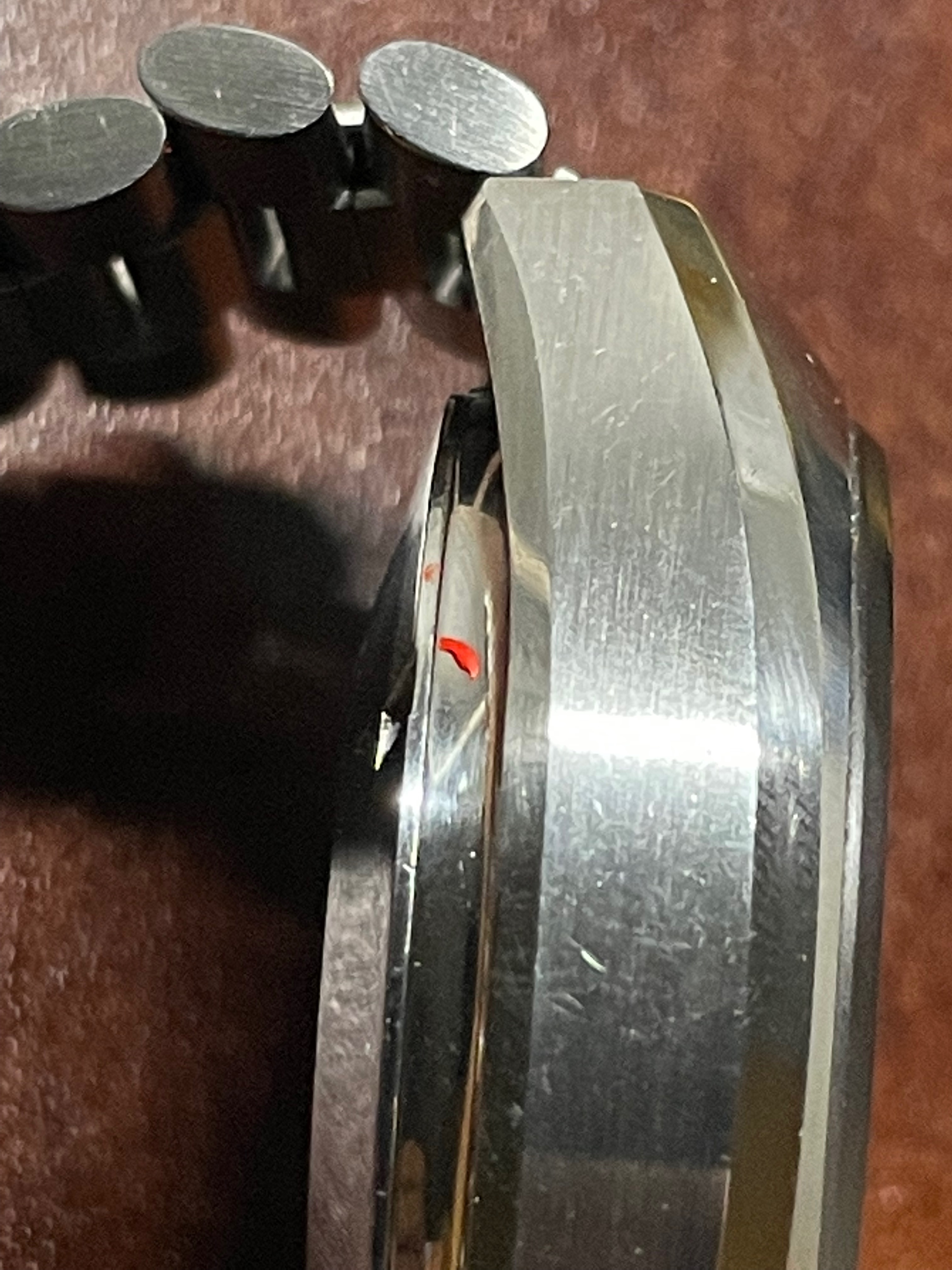 (4) I found an orange paint (or look alike) on the case back: Of course, it might not be related to the orange paint on the dial. I heard that some sellers will mark their watch so that when the watch is returned, they can make sure that the watch is still the original one.