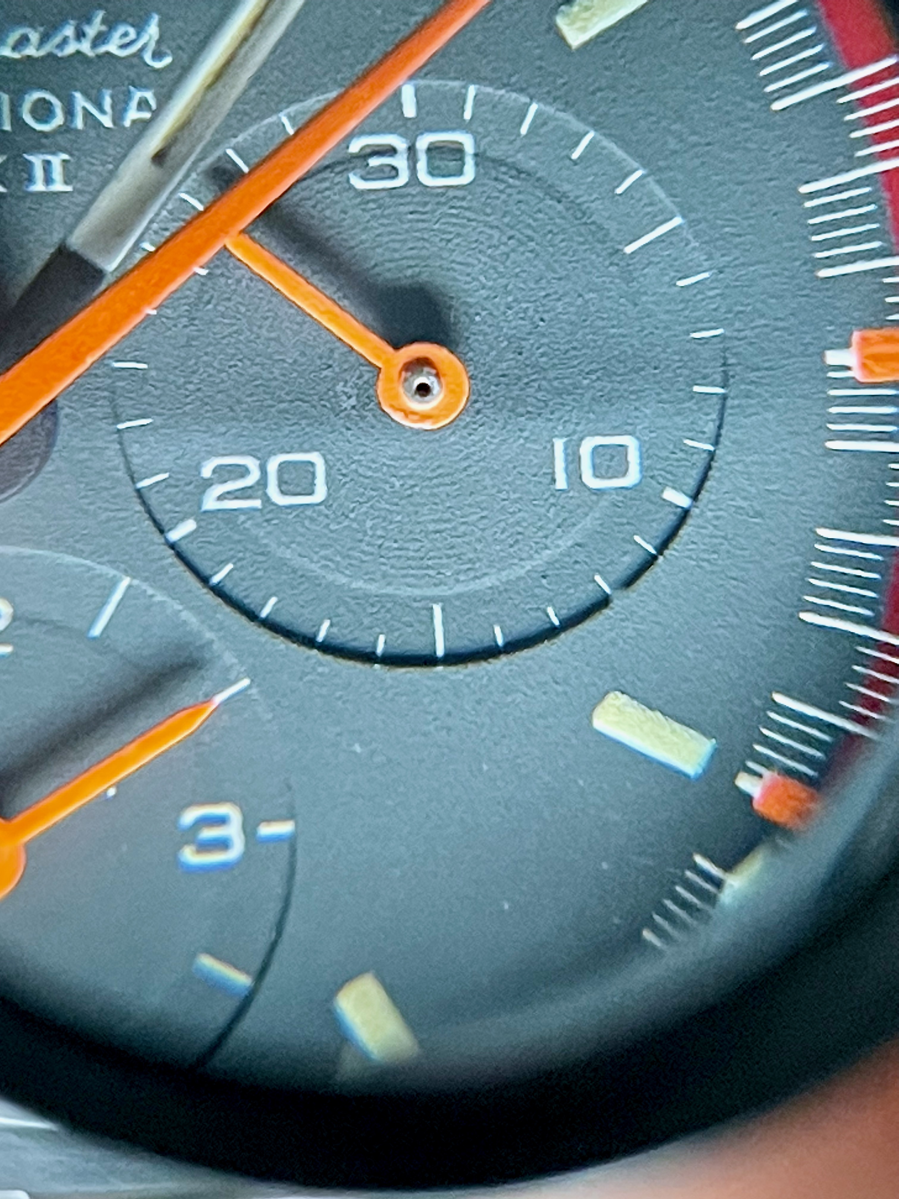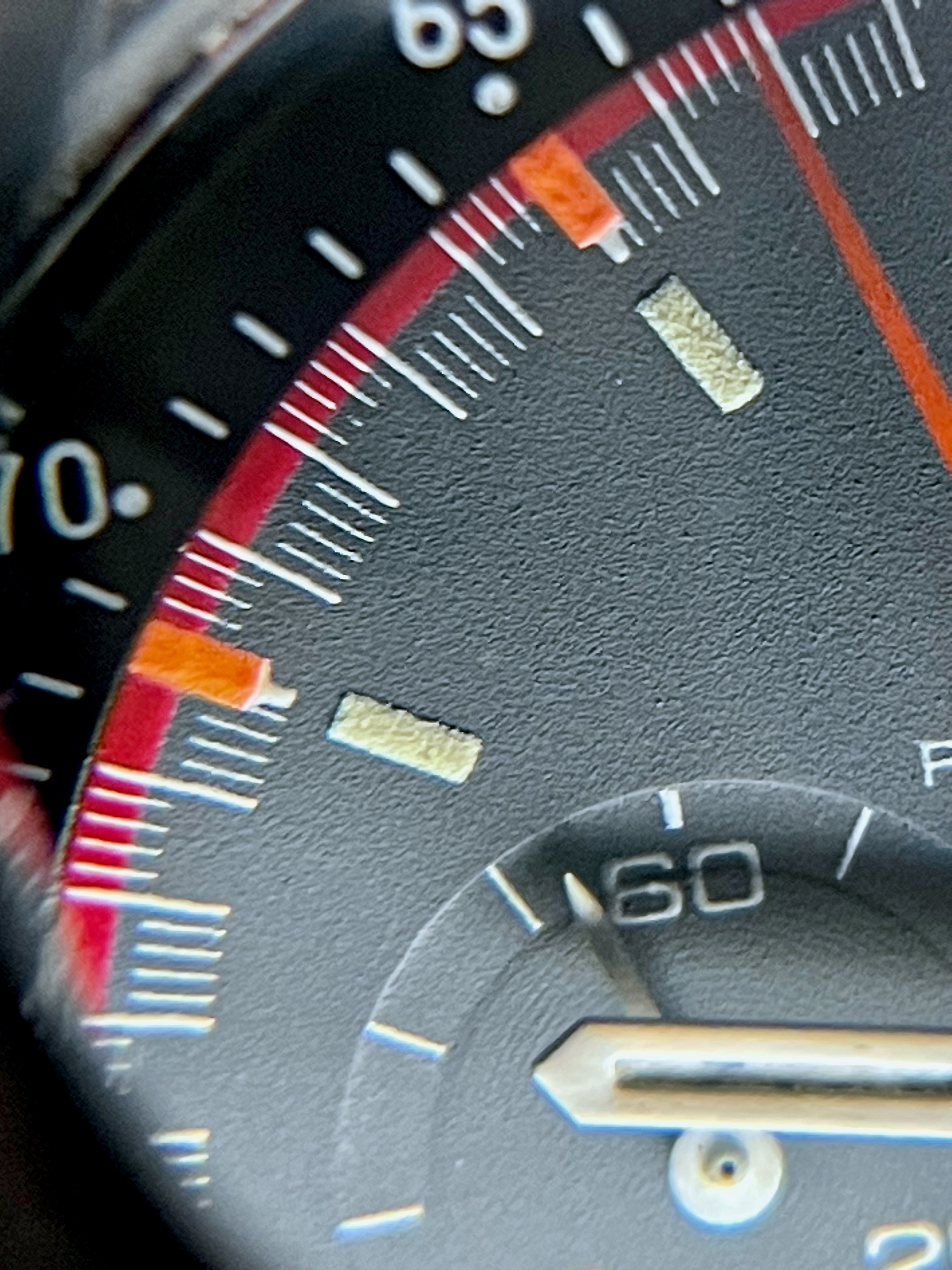 (1). The ring/circle patterns under three chronograph hands are vague and seem to be covered by the paint. Also the paint surface seem to be coarse (not very smooth) under magnifier.