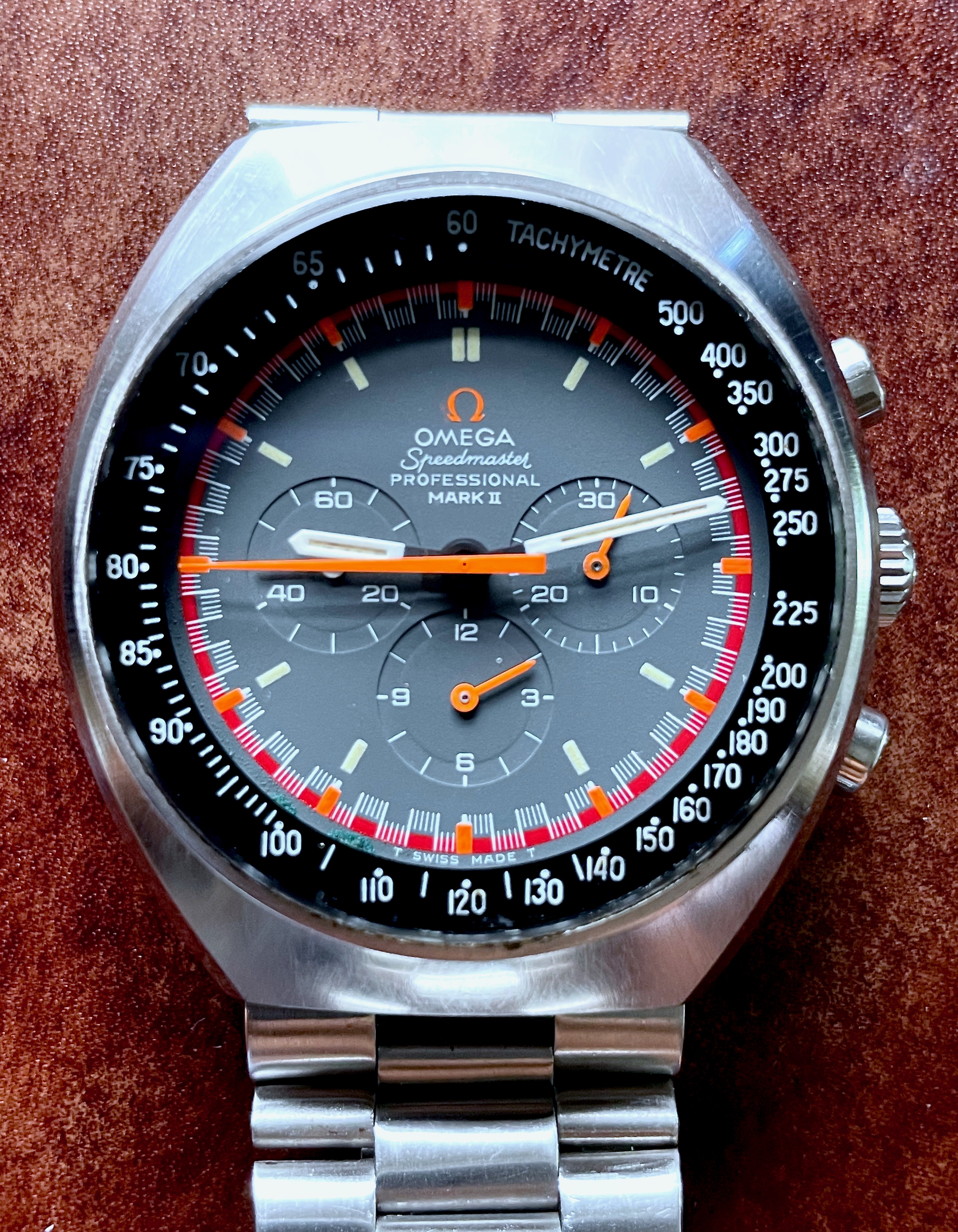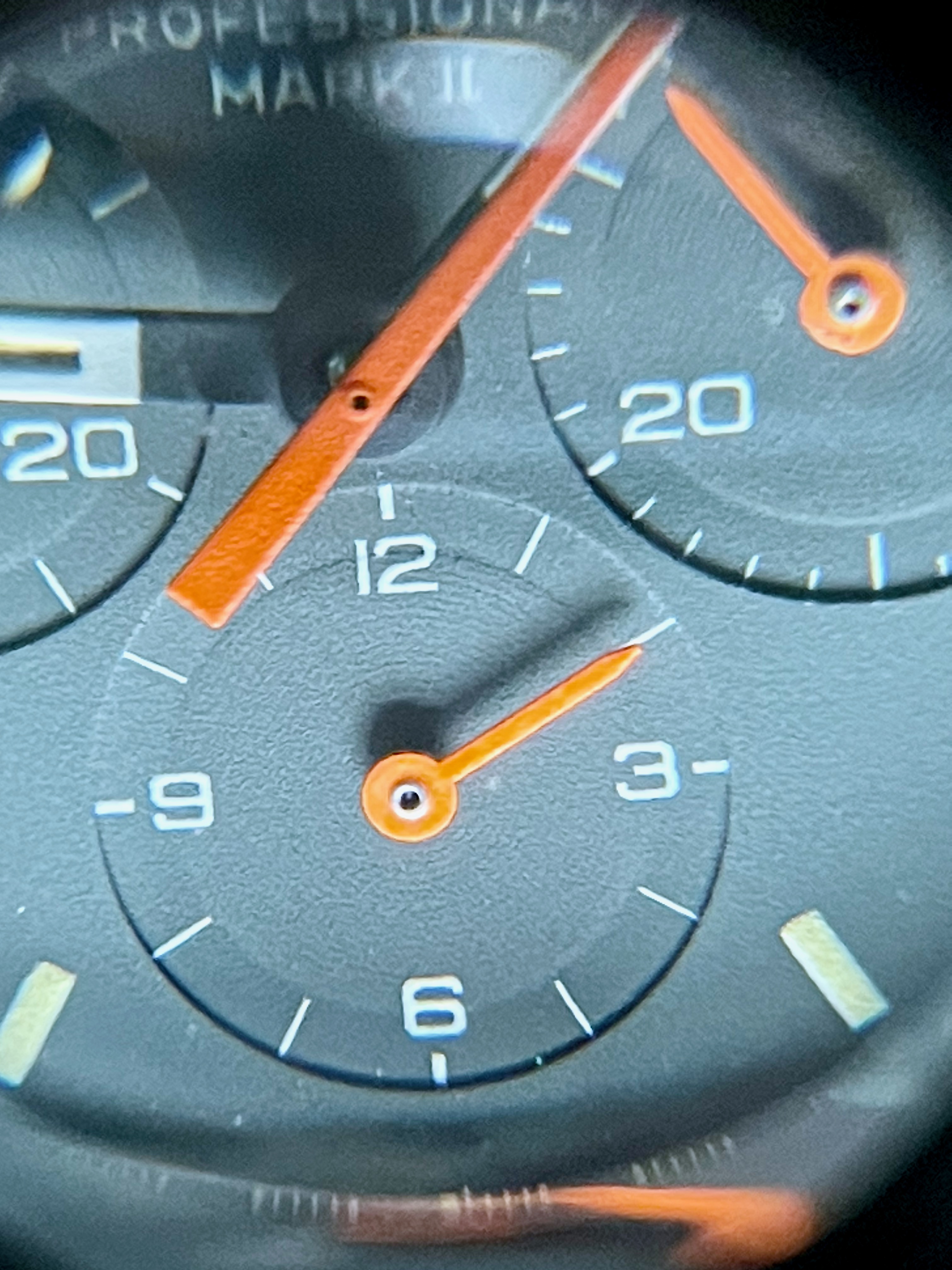 I went through many previous posts about 145.014 with a racing dail and found that some of them have very similar ring patterns and paint job like mine (for example, this one-owner racing dial with original paper: https://omegaforums.net/threads/ome...al-first-owners-with-original-warranty.27850/ and this racing dial: https://omegaforums.net/threads/unique-speedmaster-mark-ii-145-014-dial.108429/ and this one: https://omegaforums.net/threads/speedmaster-mark-ii-racing-145-014-with-crater-box.87998/). But I also found some of them have very visible and sharp ring patterns (for example: https://omegaforums.net/attachments/speedymkii-fs3-5-copy-jpg.511139/ and this one: https://omegaforums.net/threads/stunning-omega-speedmaster-markii-145-014-with-racing-dial.61218/ and this one: https://omegaforums.net/threads/one-owner-omega-speedmaster-145-014-mark-ii-racing.75083/ and https://omegaforums.net/threads/1972-omega-speedmaster-mkii-racing-dial-145-014-serviced.27701/).