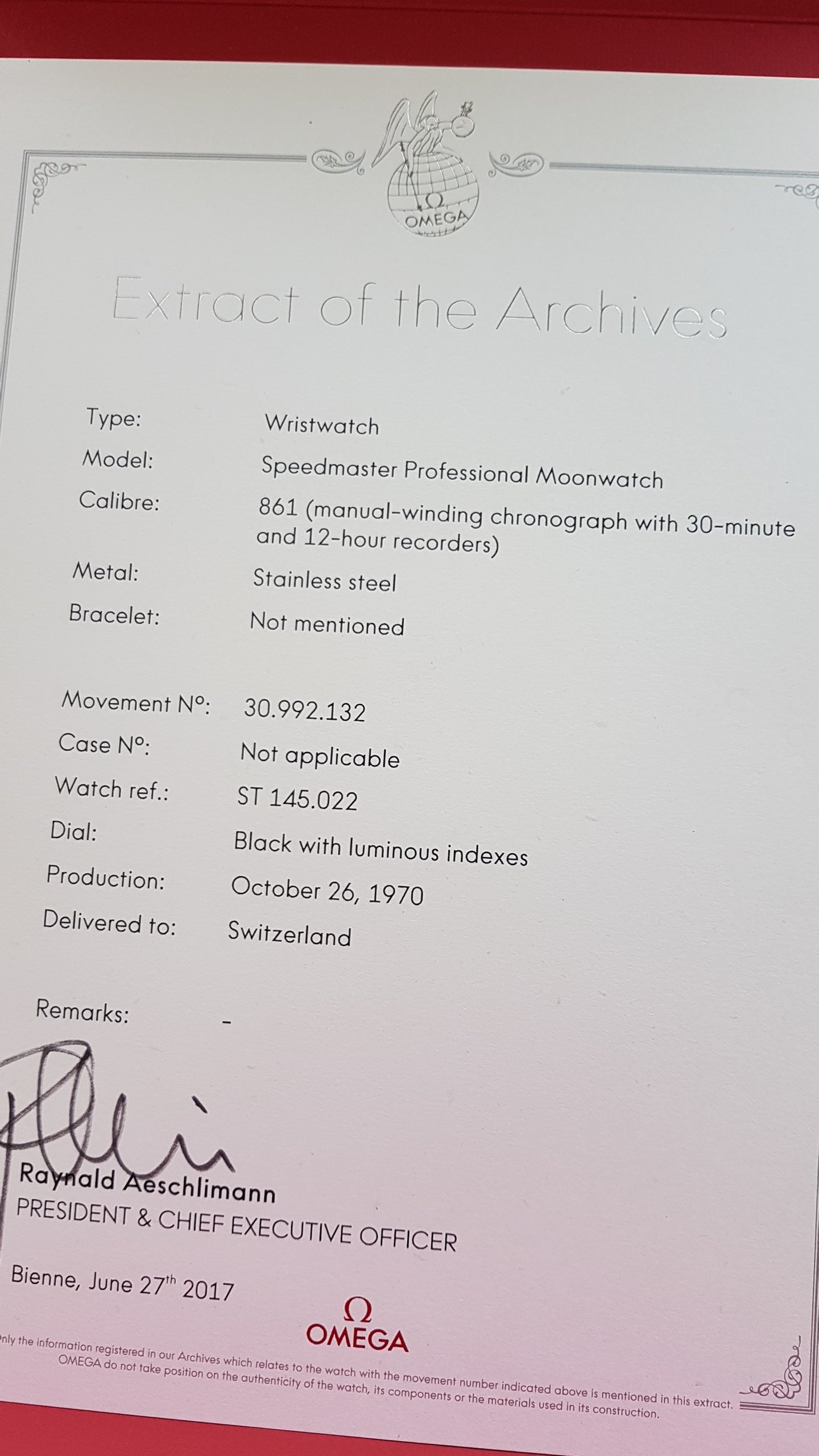 I own an Omega Speedmaster for 10 years now. It was my 30th birthday present from friends and family. And I've constantly looking through the internet to find out a little bit more about my watch. I have recently let it inspected at Omega in Switzerland. And also just have received my "Extract of the Archives" from Omega. Here are some informations from the document: