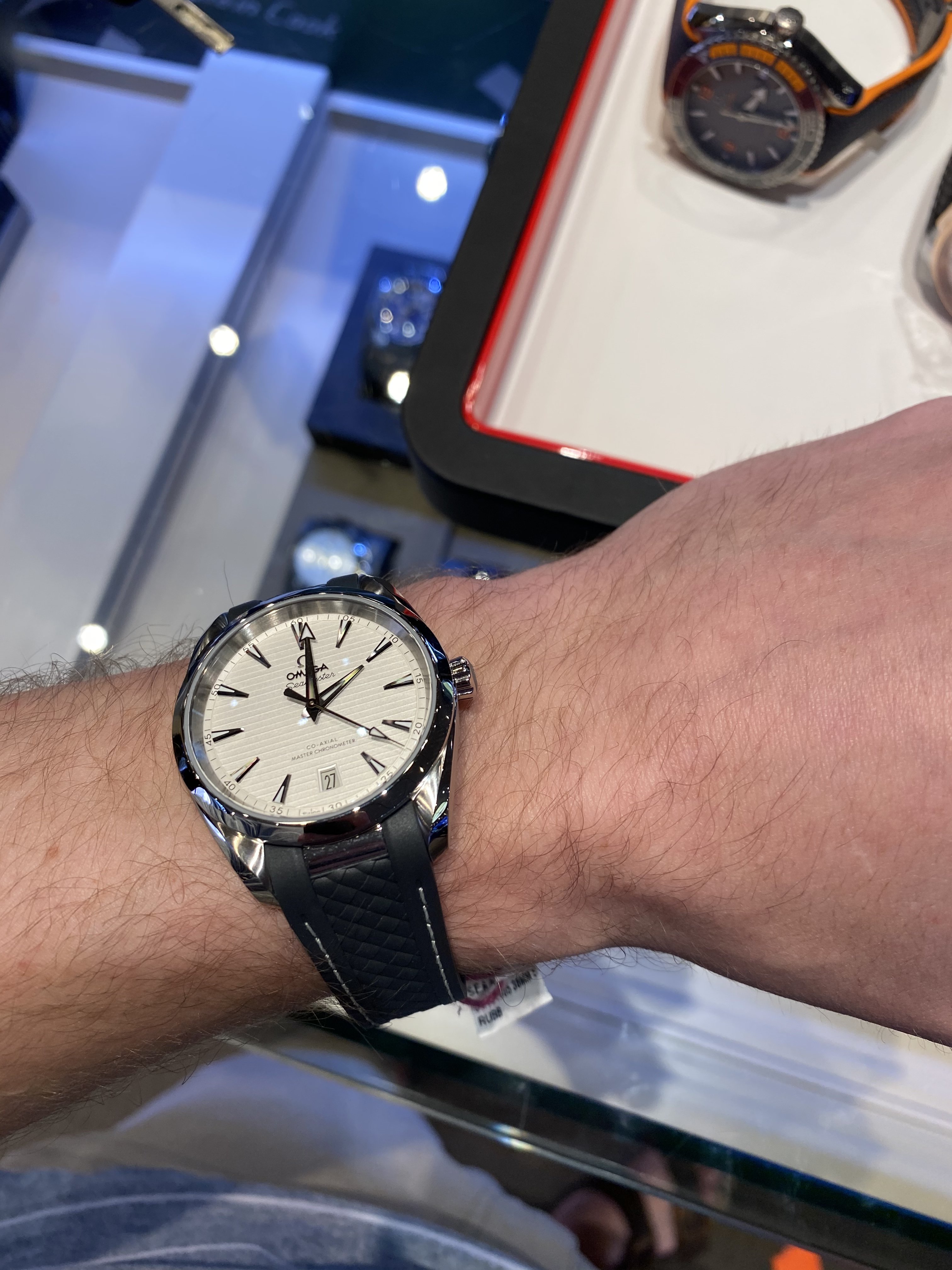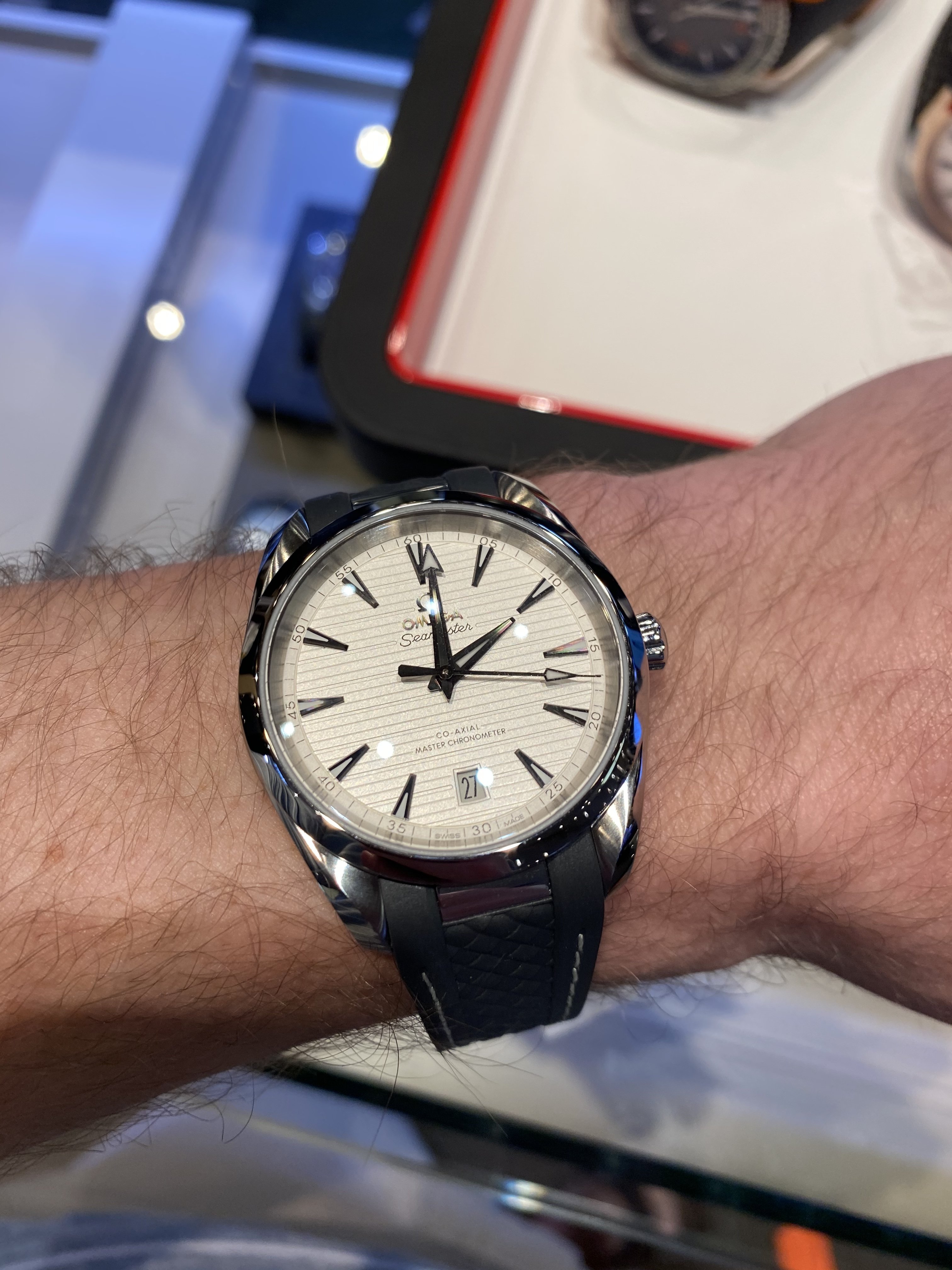I was originally interested in the silver dial AT 41mm with orange second hand + rubber band stitching. Thoughts being, it’s sporty with the orange hand and rubber band stitching but is still classy enough for work and could also class it up further with a nice leather strap. However, when I tried on an actual 41 AT I thought it looked and felt too big, which surprised me (I have an average 6.75” wrist and own some larger dial watches). This is a “big” 41!