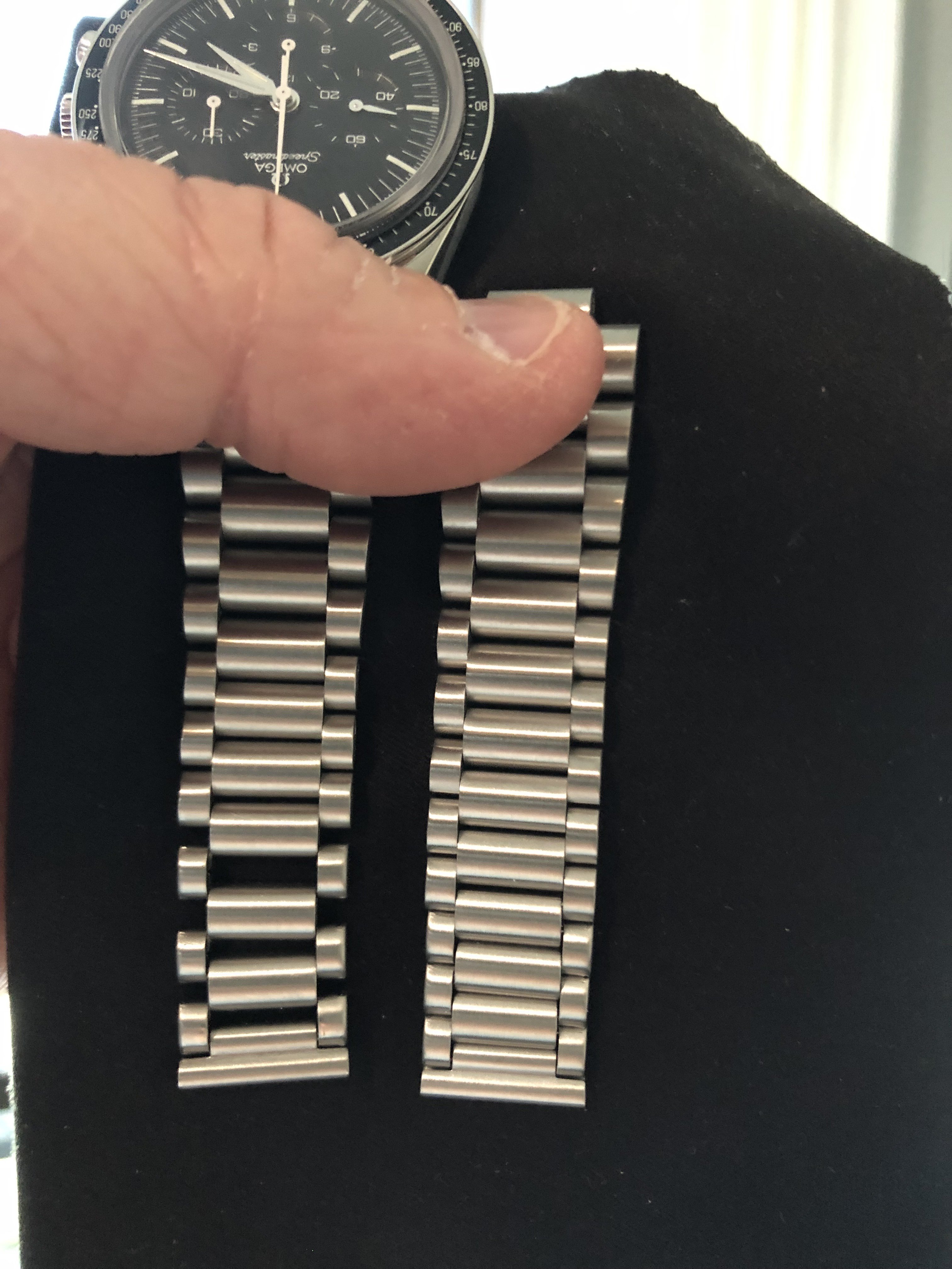 Fast forward to last week and now the springy link has totally failed between 2nd & 3rd link as shown in pictures 4 & 5. The separation between the links are very noticeable whether you're wearing the watch or just laying it on the desk. In all these pictures, I was merely holding the watch head and the bracelet hangs with noticeable gaps between each of the failed links. I reached out to Forstner last week and a replacement bracelet was quickly dispatched and arrived today. Pictures 4-5 shows what a new Forstner 1450 bracelet looks like next to the installed bracelet with the failed springy links. My only concern is that the new bracelet will suffer the same demise in 2-3 months of wear.