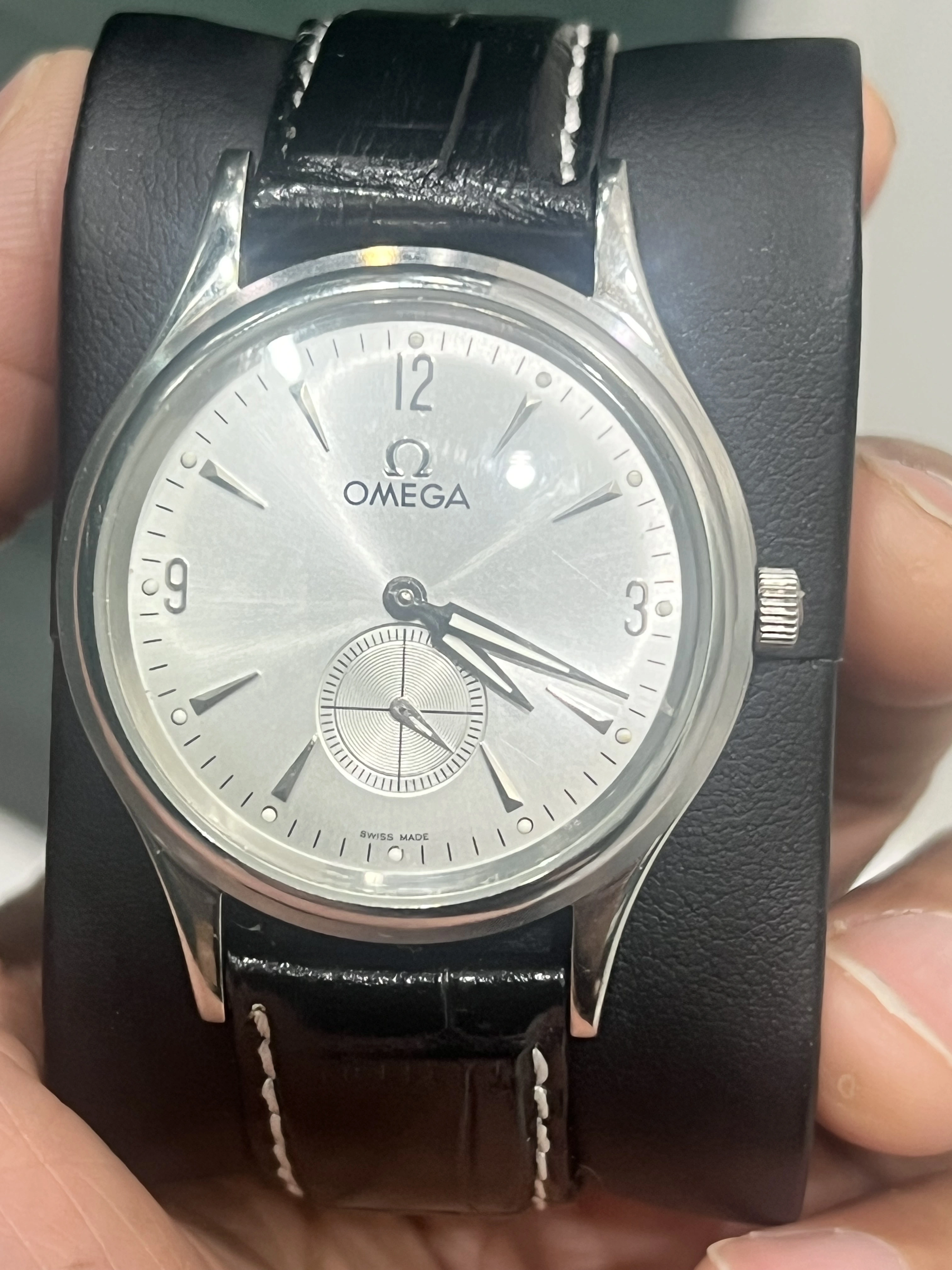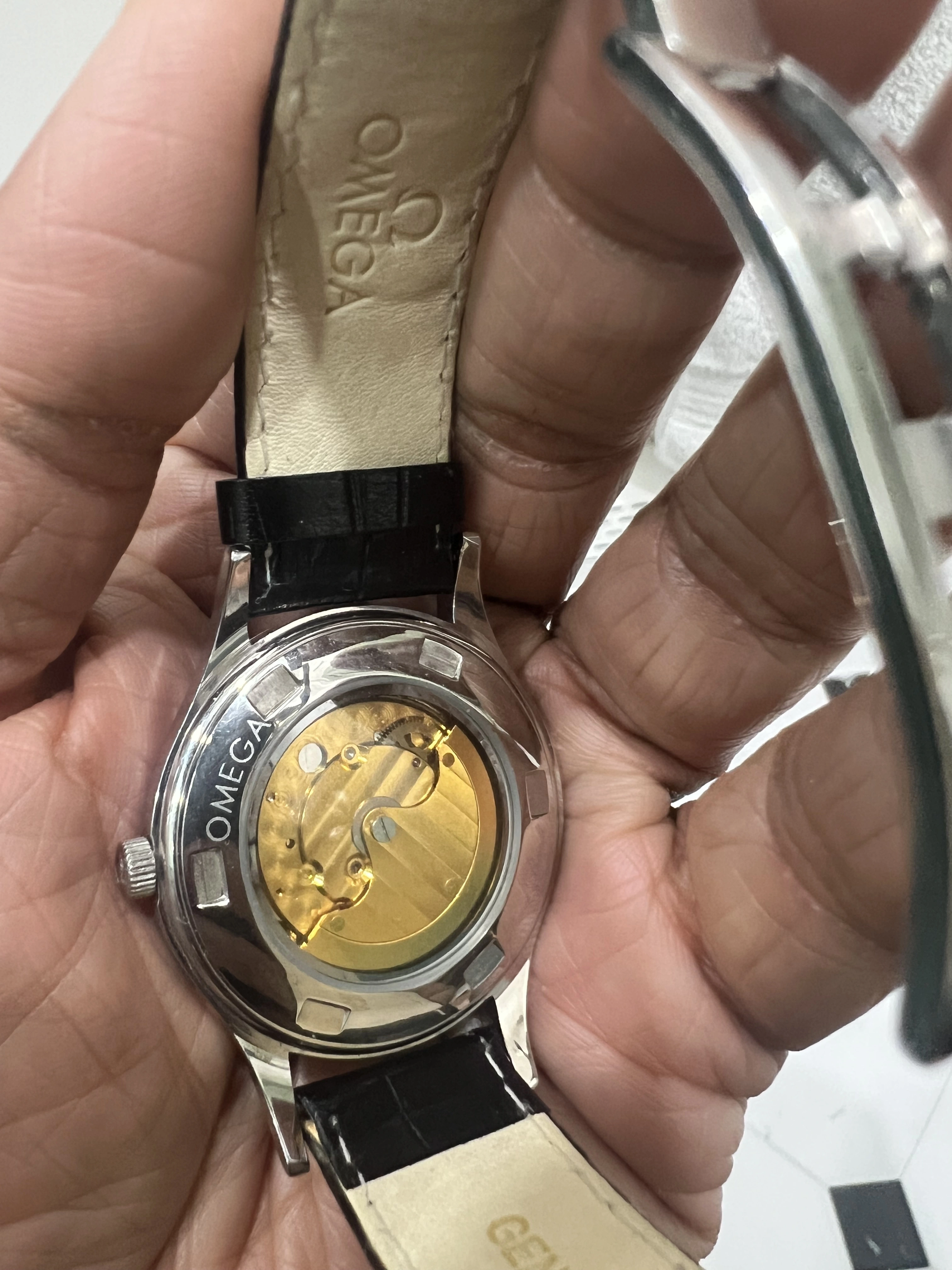 I know fakes are going around like crazy. This looks like a vintage 50’s-60’s seamaster dial (which looks in pretty great shape if it is indeed that old) with a subsecond dial and decent lume to me, but clearly has a newer crocodile omega-branded leather strap and open caseback engraved with ‘omega’ and ‘Louis Brandt’ on the back.