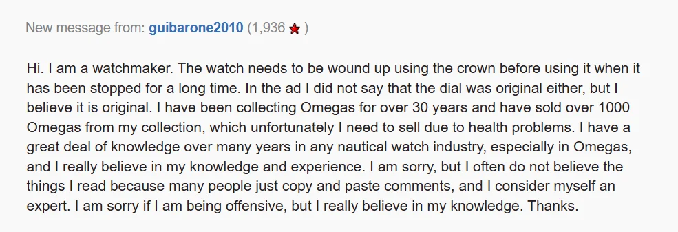 With all due respect, I do not care about money, and I do not know why saying I am searching for sympathy. According to the seller biography, the seller is an expert in vintage timepieces; he has completed thousands of transactions and even offers watch parts with full listings and prices, demonstrating his complete understanding of the business. I come here to learn from the expertise and respected members who have commented above and educated me, however you are aggressive for no reason. The seller must be regarded and moral, rather than simply deceiving. Even Omega Company purchased a fake watch from an auction, so how come fresh passionate people can spot every single flaw in a watch!!