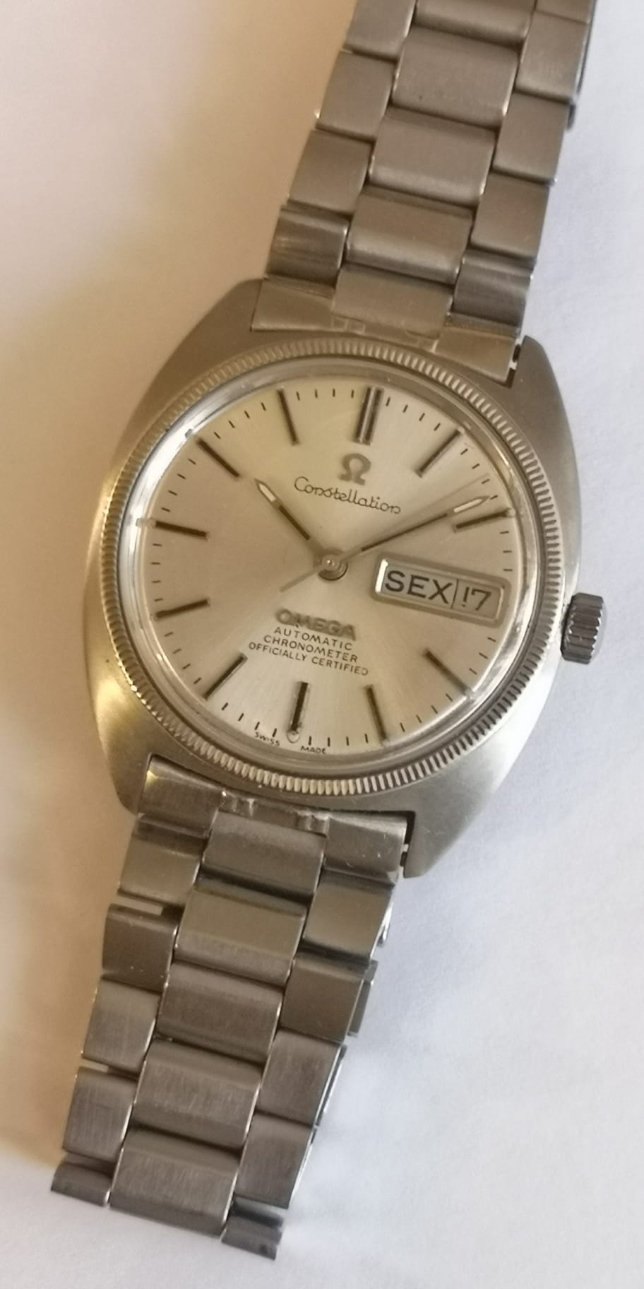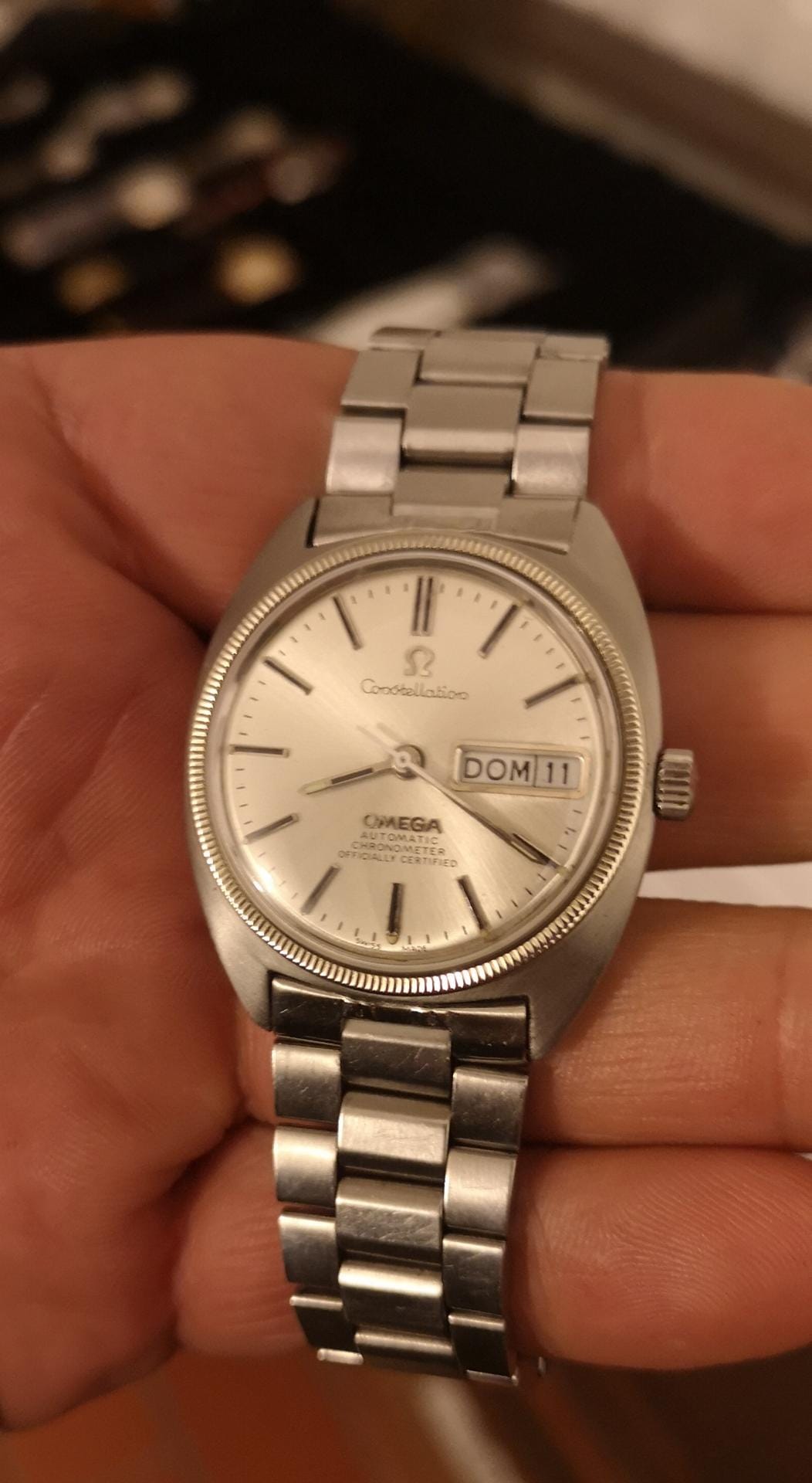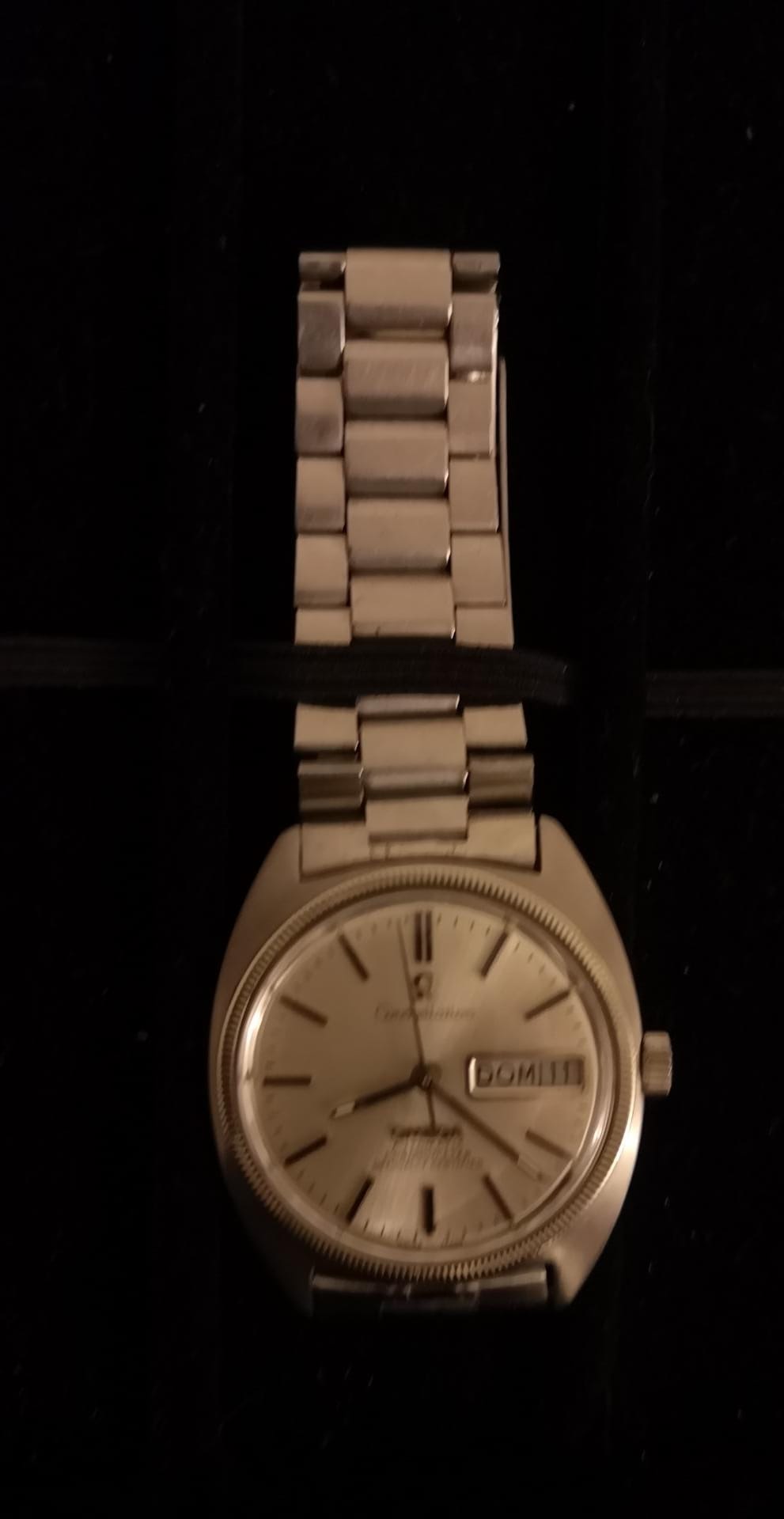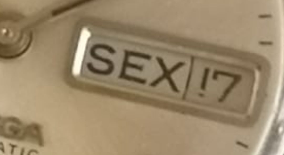This dial configuration is also found on late model 168.029, but as noted the placement of the text is only partially correct. It is a redial as can be most easily seen by the thickness of the minute hashes and the layout of those - they are placed in a straight line between the hour markers where they should be curved along the dial edge.