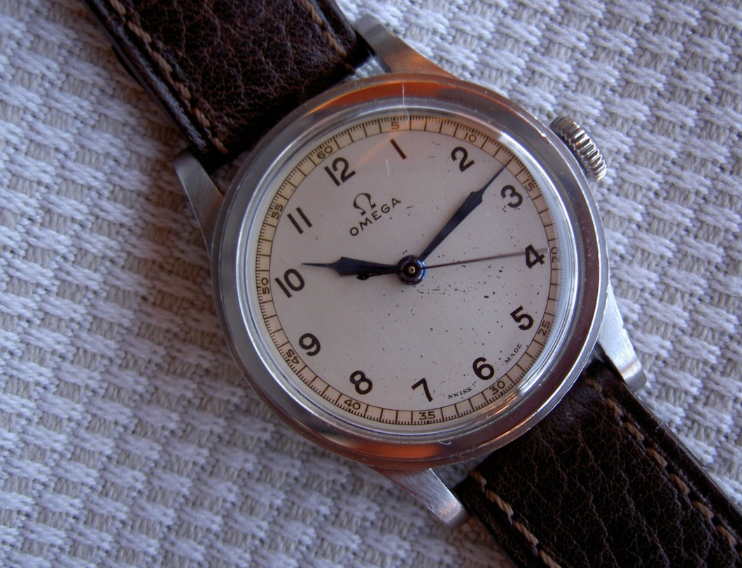 The dial has been rotated counter clockwise. I suspect the dial feet are broken off, I very much doubt if it is a product of Omega. More information needed in order to be certain.