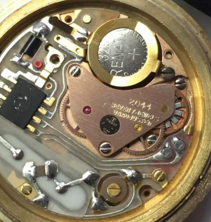 Tissot movement. Someone did a naughty deed and removed the logo. Same movement, however did not come in this watch.