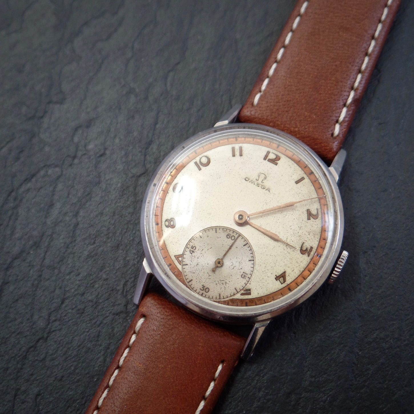 When I look at this I dont think this was made by Omega. I could be wrong becouse it watch from around 1940, but I think its redial with wrong hands.