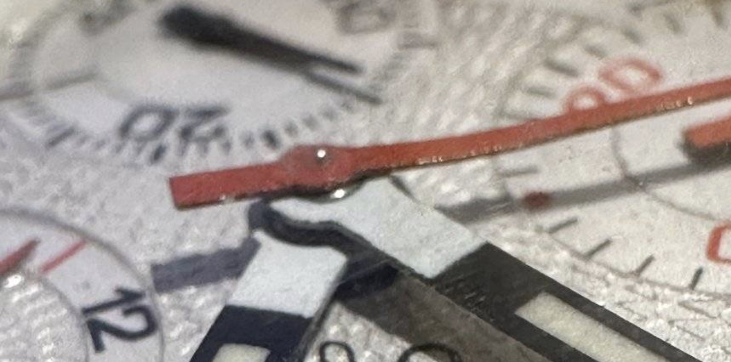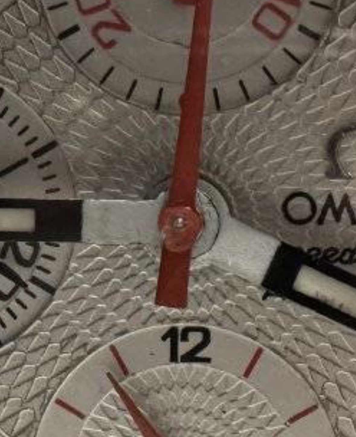 Your central Chronograph hand is broken. You can see the polished tip of the post that the hand is pressed to, sticking out past the hand. It should not be like that.