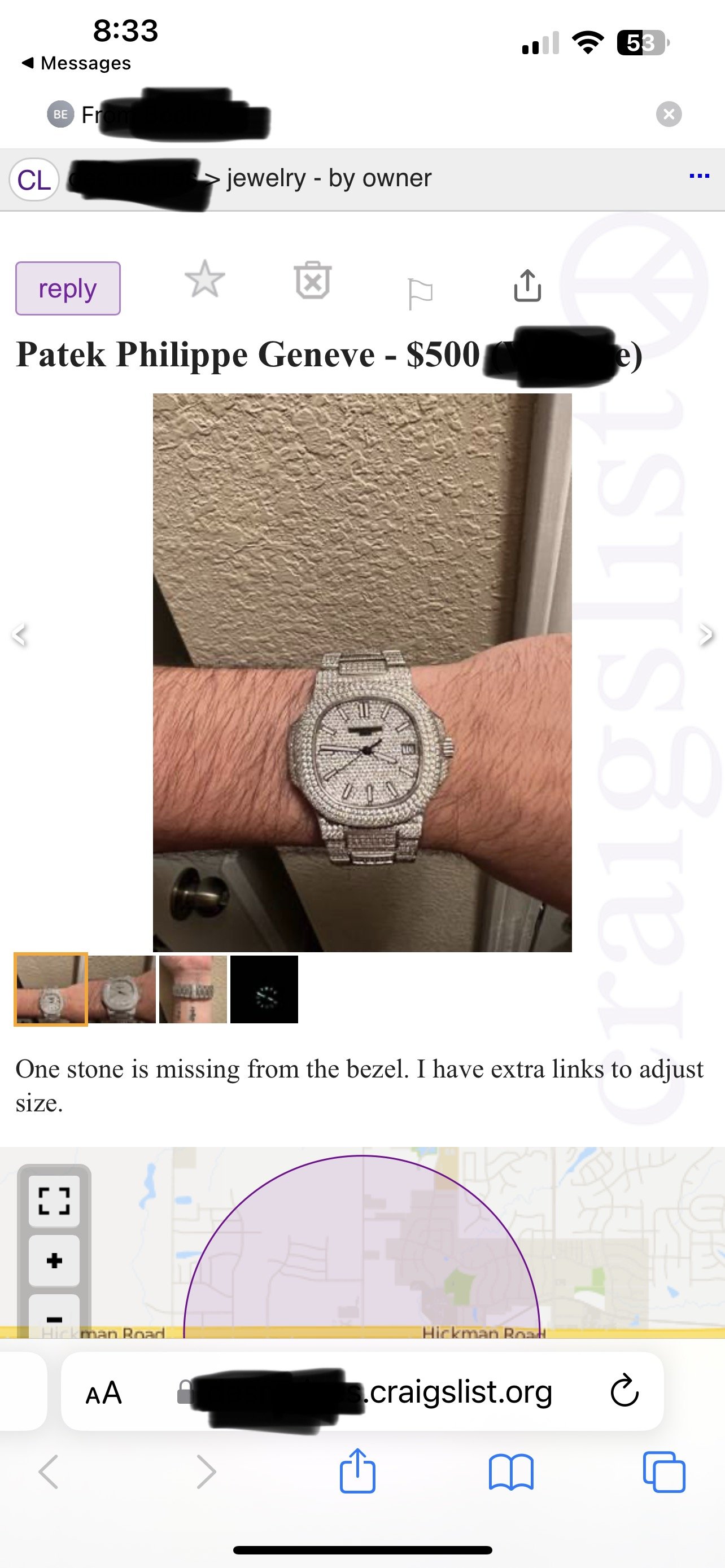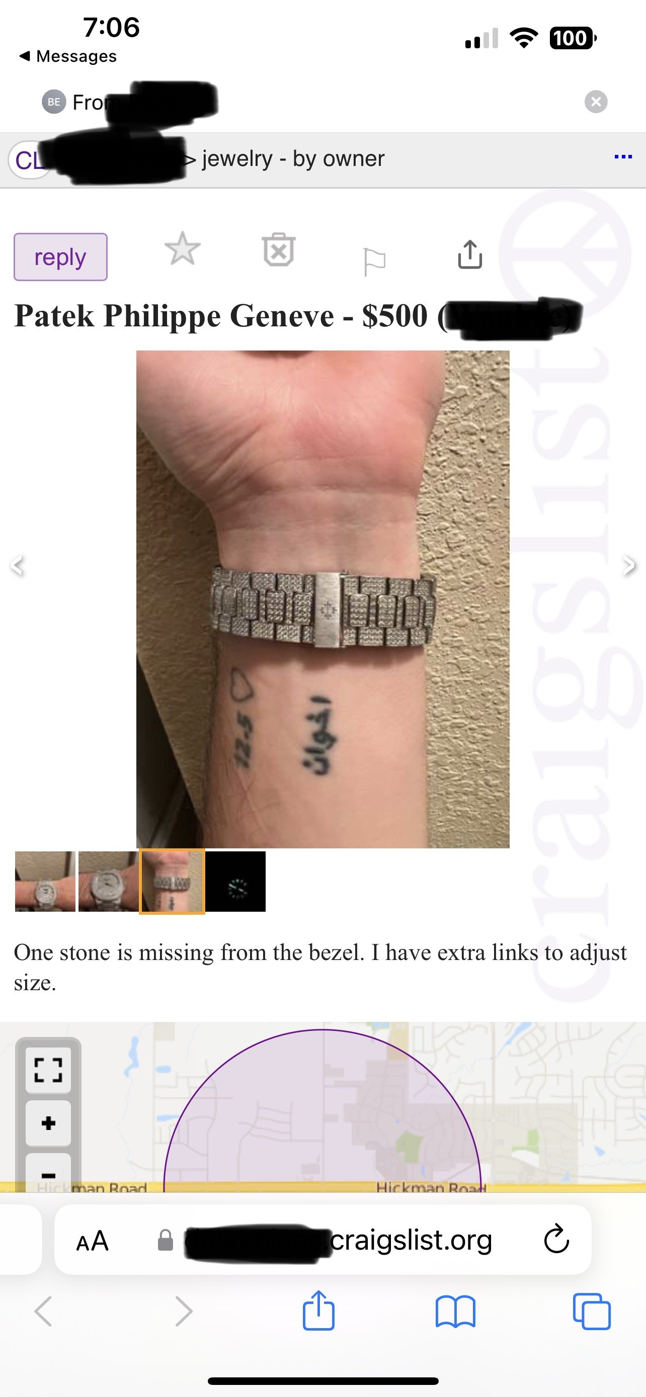 Fortunately only one stone missing from the bezel. I was only suspicious when I saw the wrist tattoos...the price clearly seems fair.