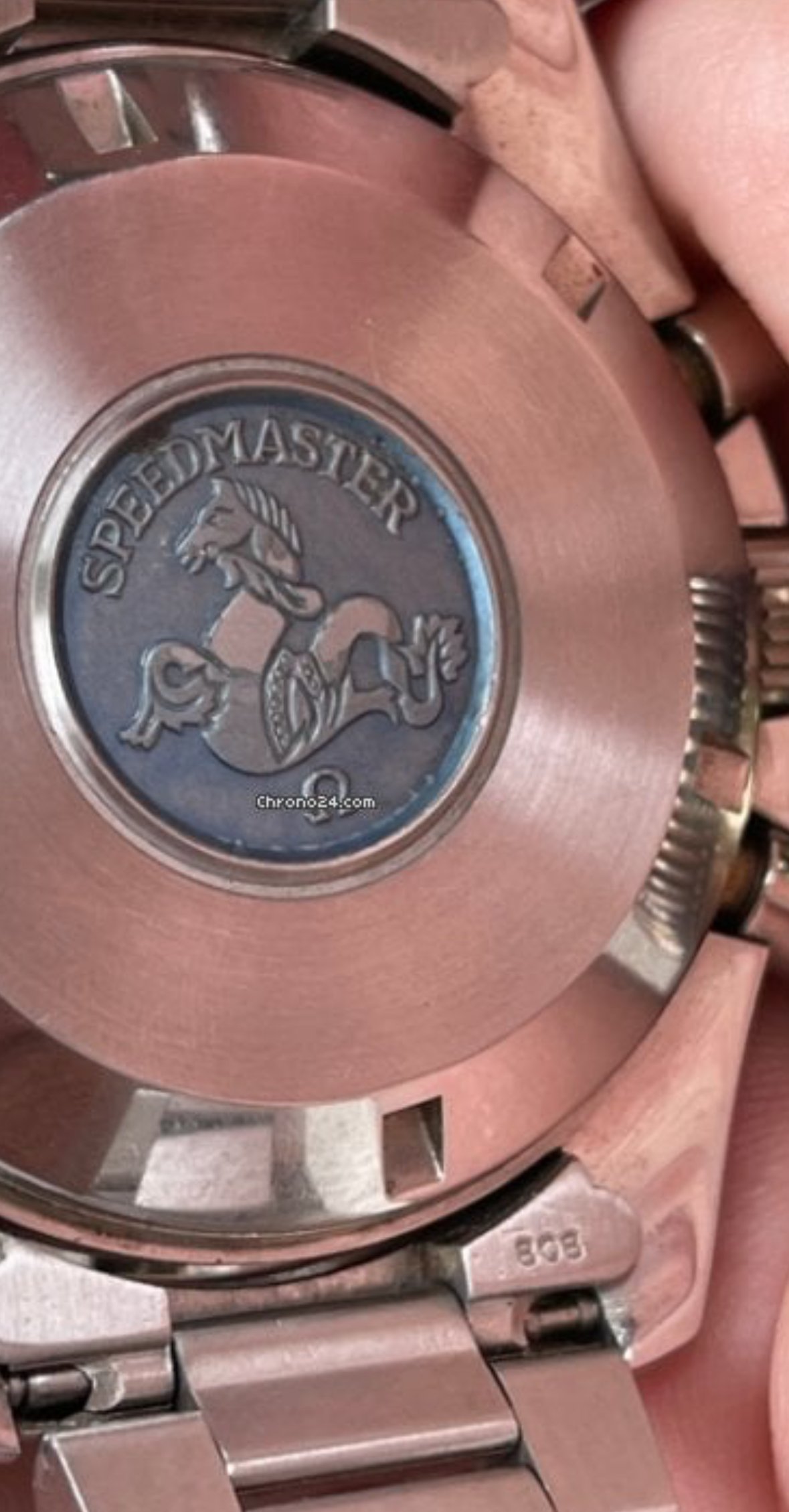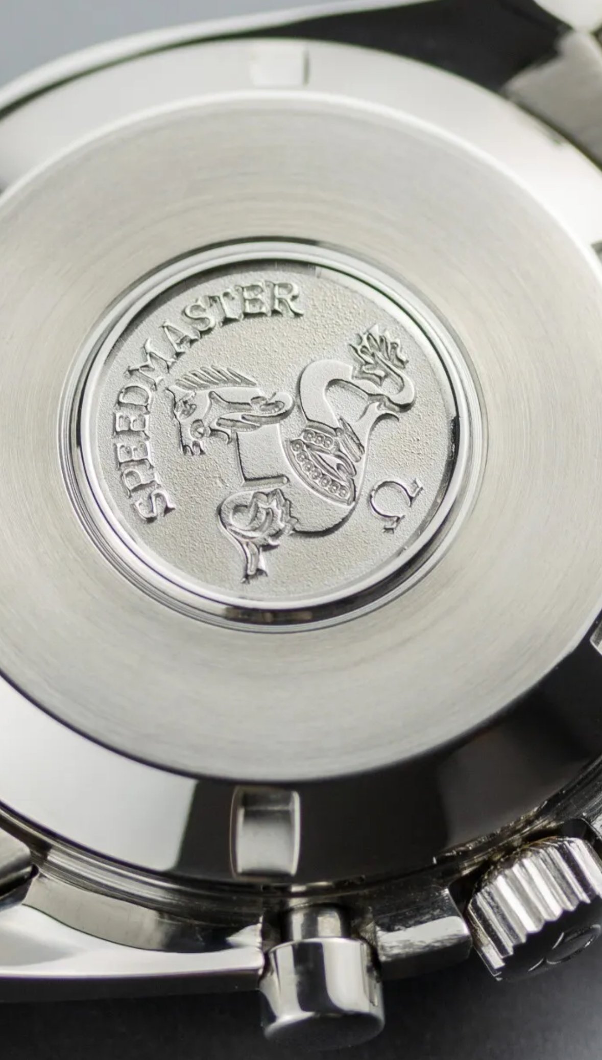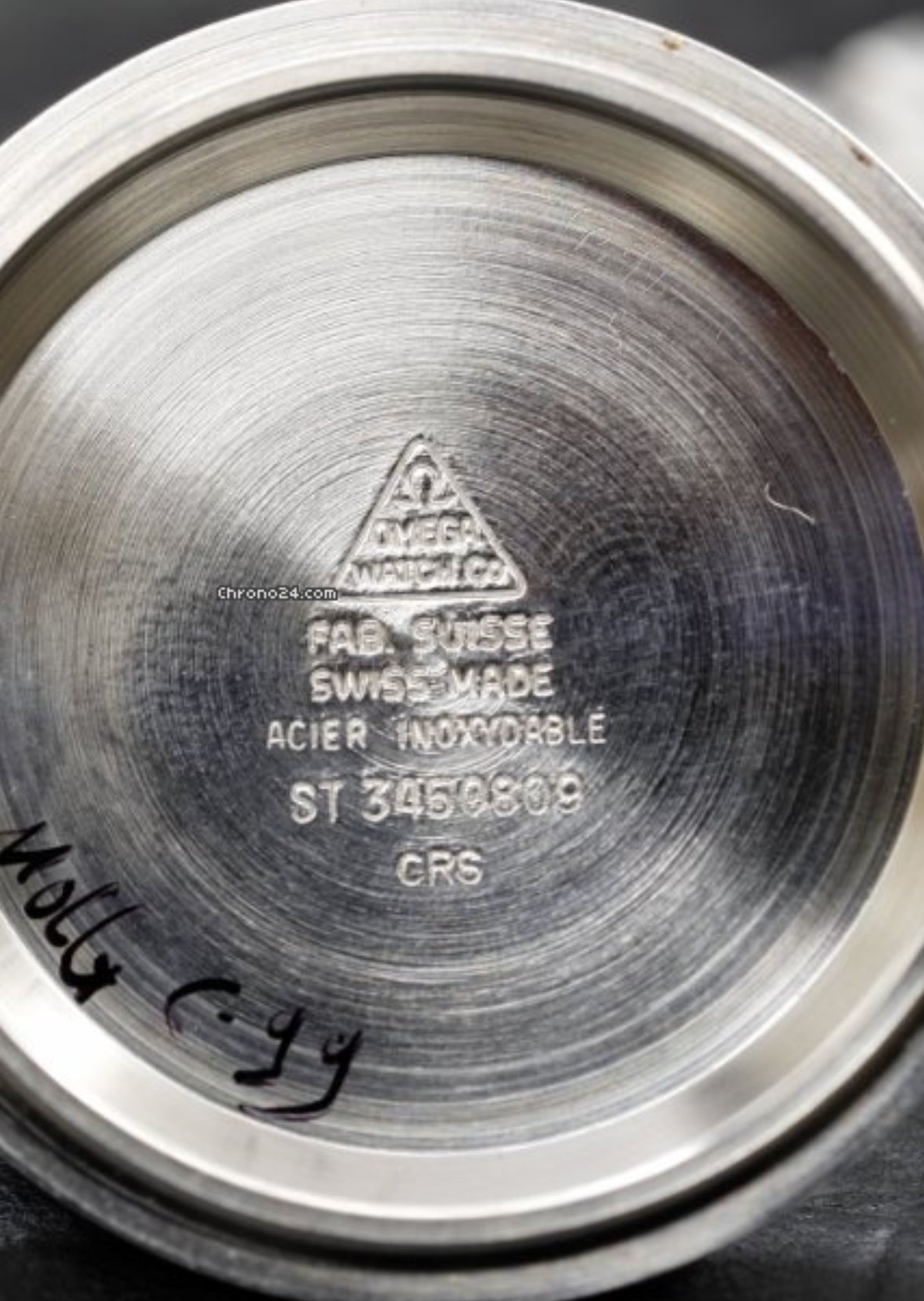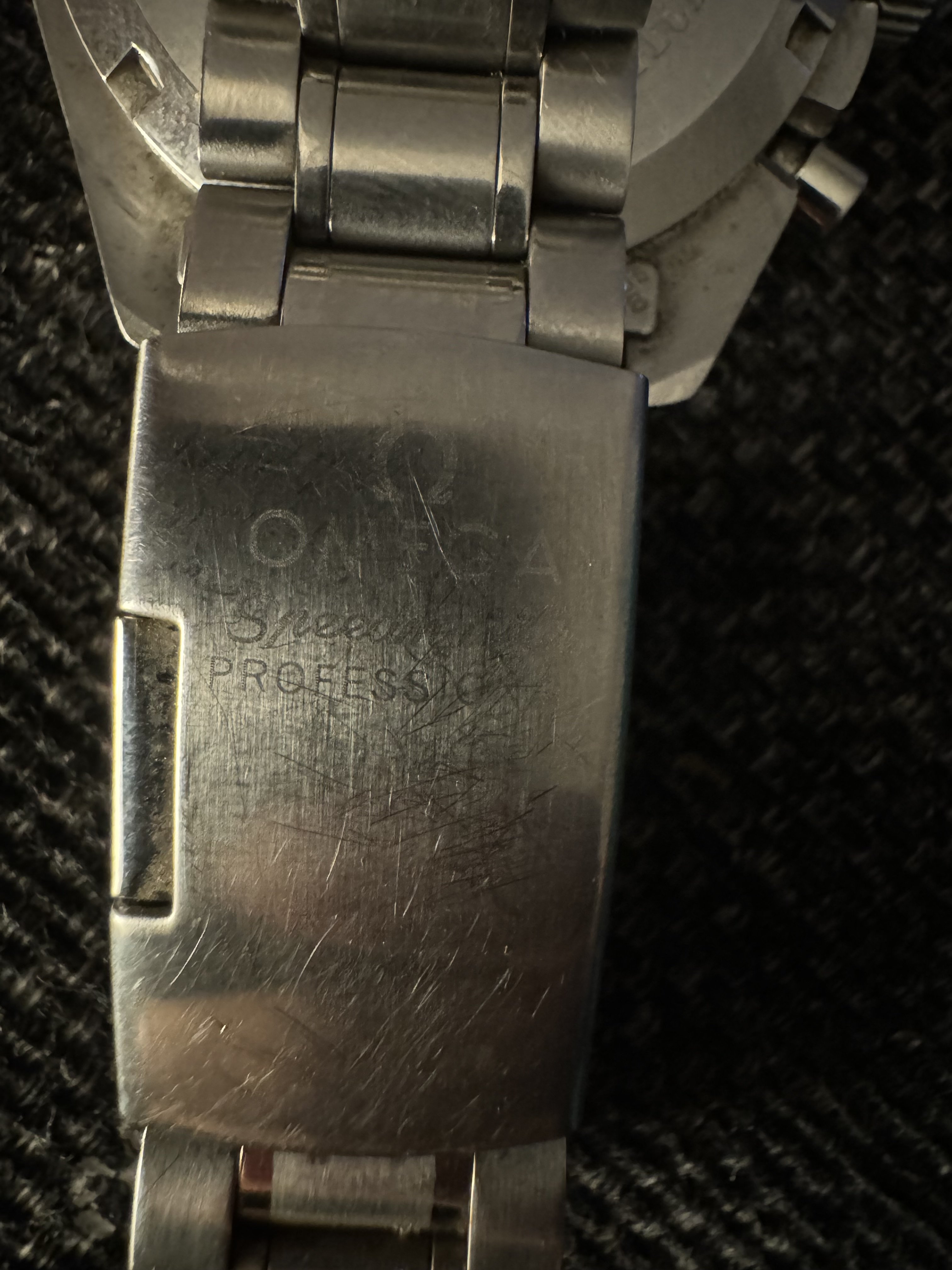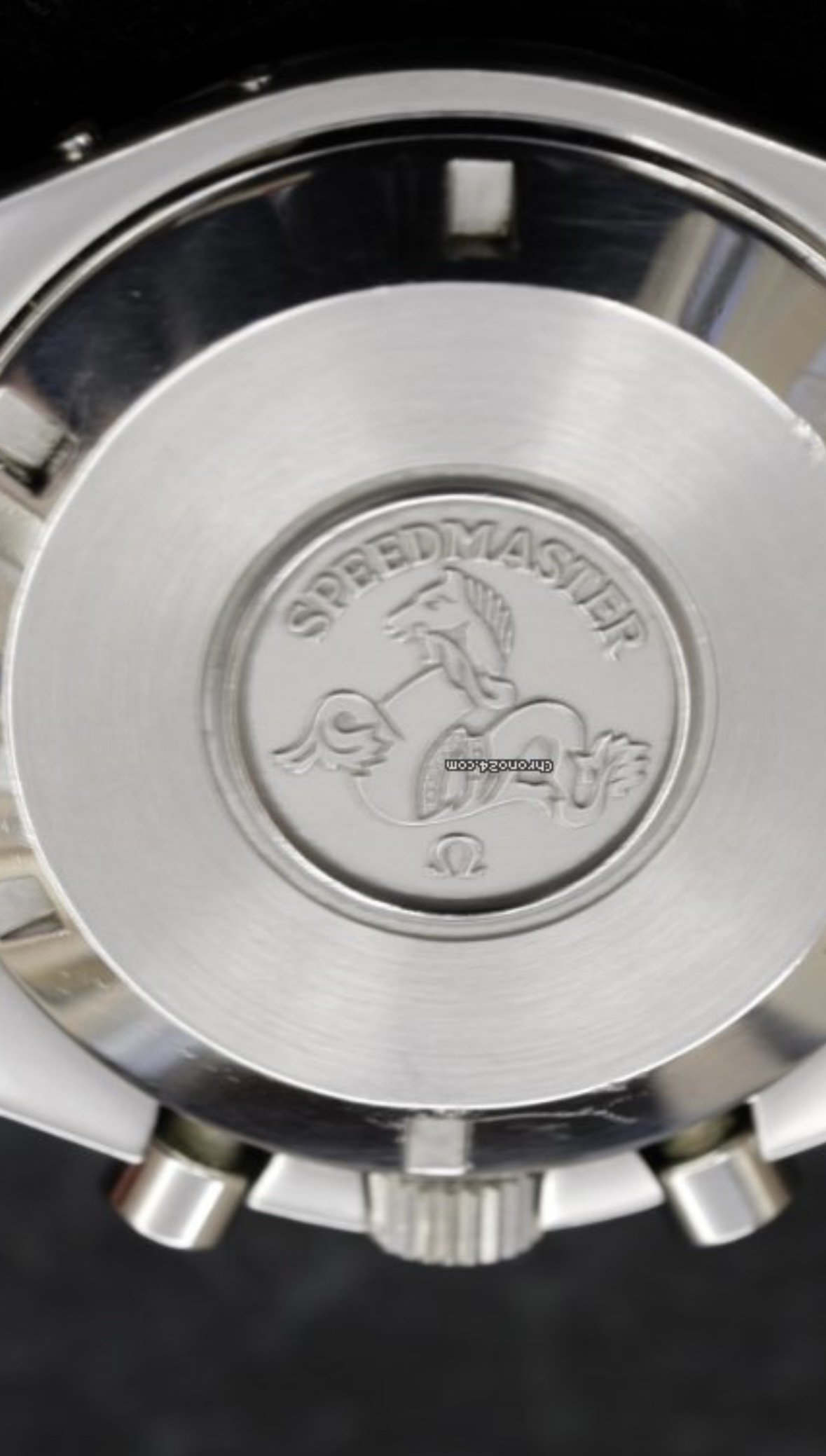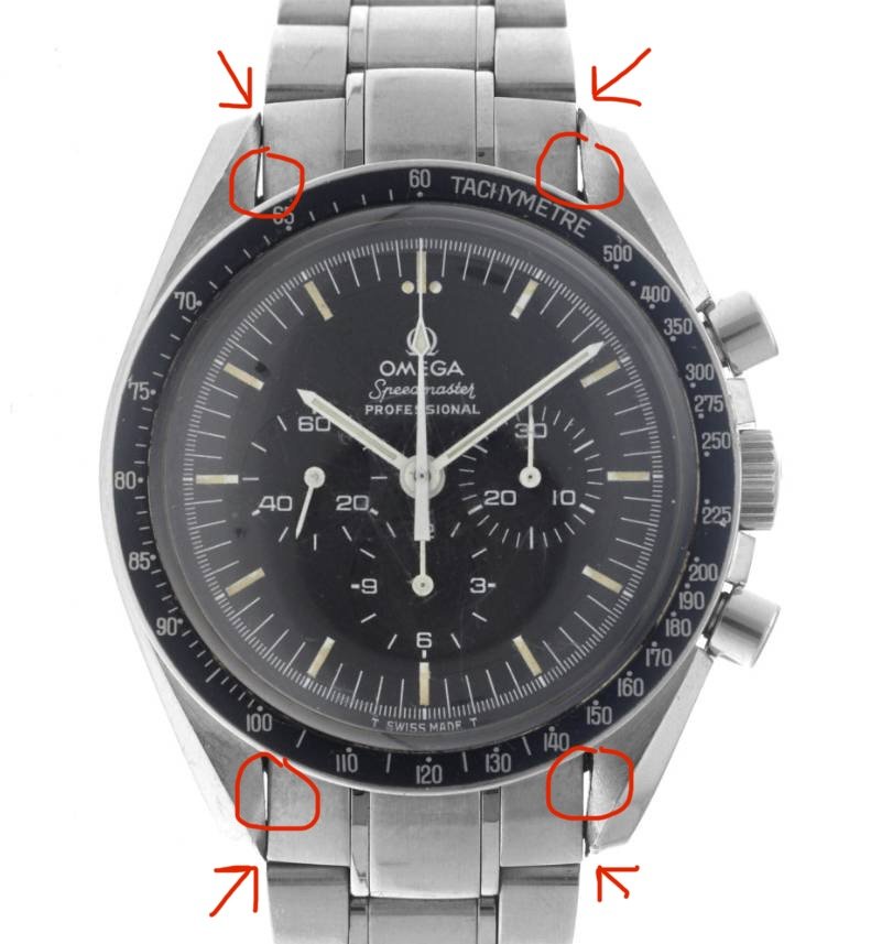 It for sure has a service dial and I’m almost completely confident a service/replacement moon disc. The hands look to be tritium but without lume decay shots, can’t say that with full confidence, though I do believe they are tritium. The case has been refinished. It has service pushers, so I would speculate a service crown as well. A replacement case back too, which is why it looks off to you- The Omega logo is wrong (see pics below for comparison) and the tool notches are slightly larger. But on top of all of this, it lacks the important and expensive 1447/805 original bracelet. It has an Uncle Seiko bracelet on it, which, on top of everything else I mentioned above, will of course greatly affect the price.