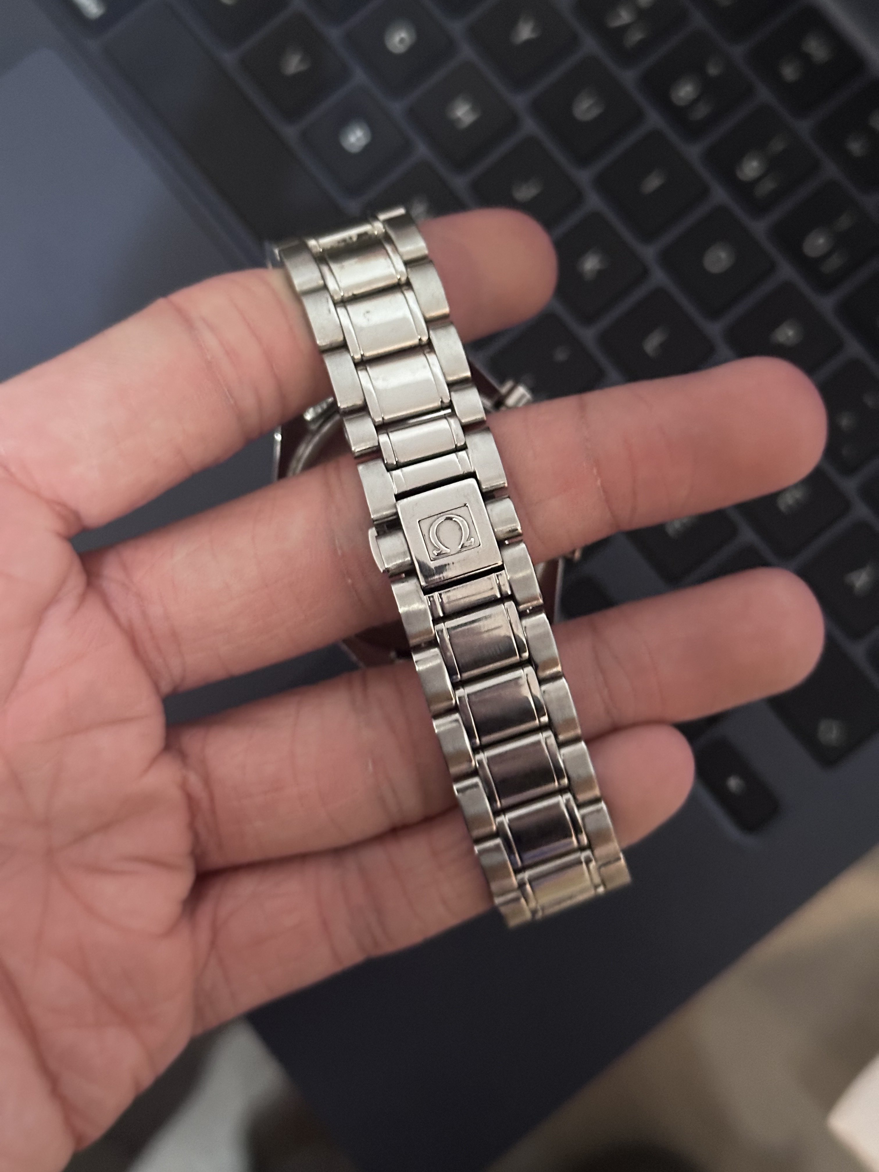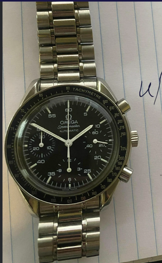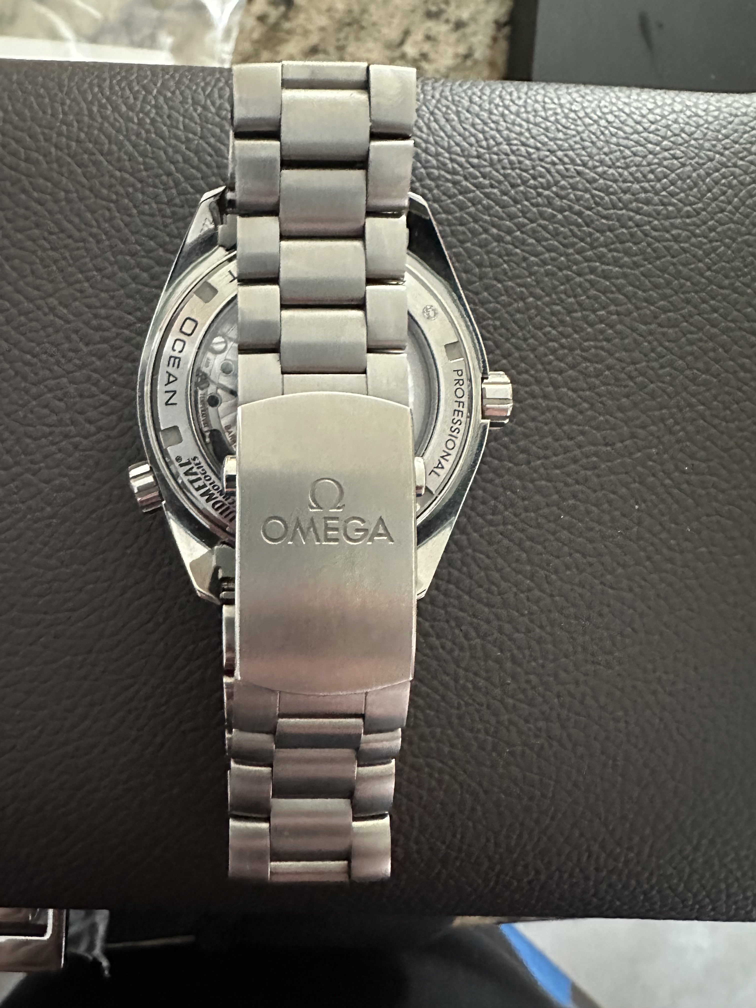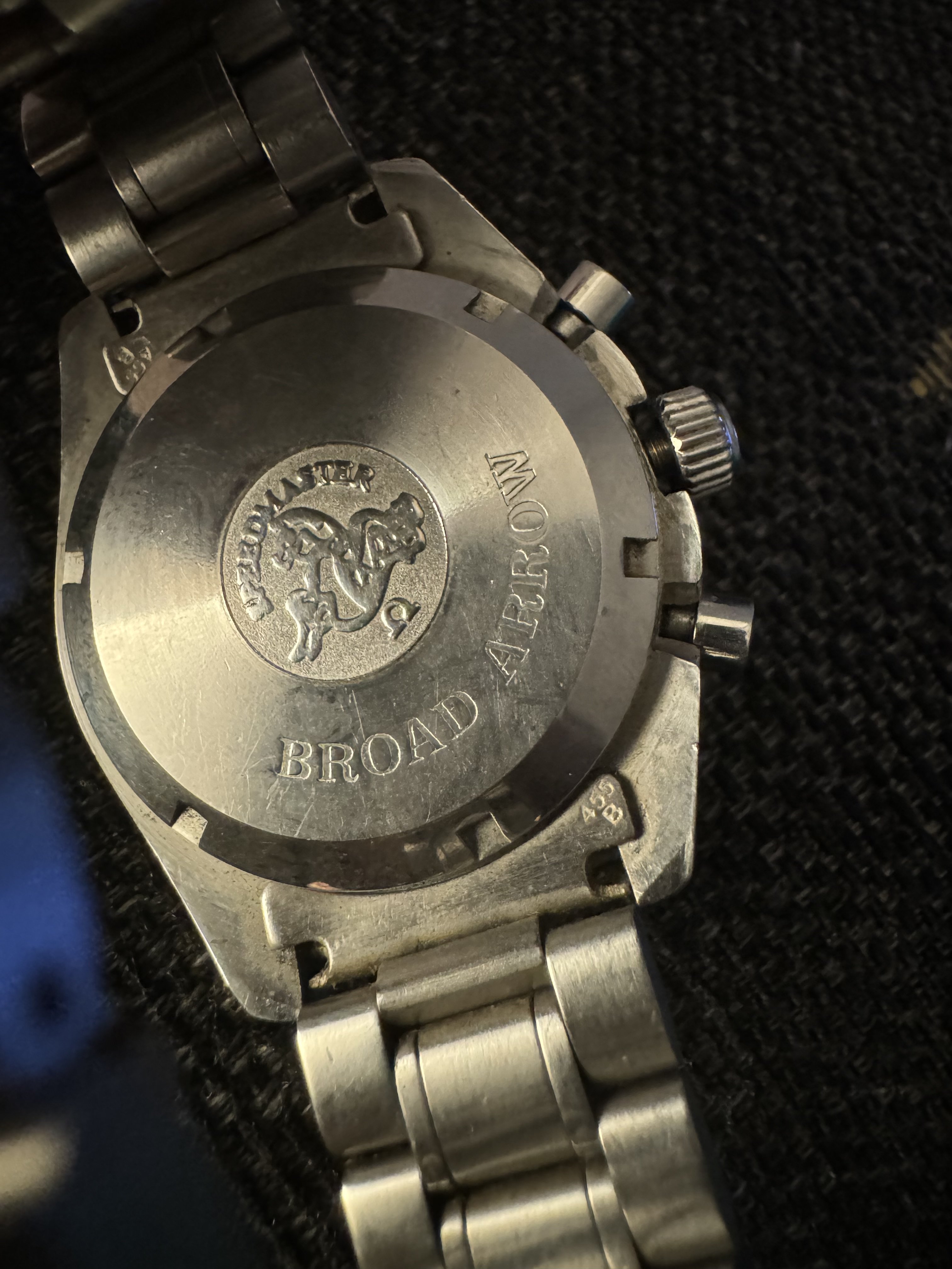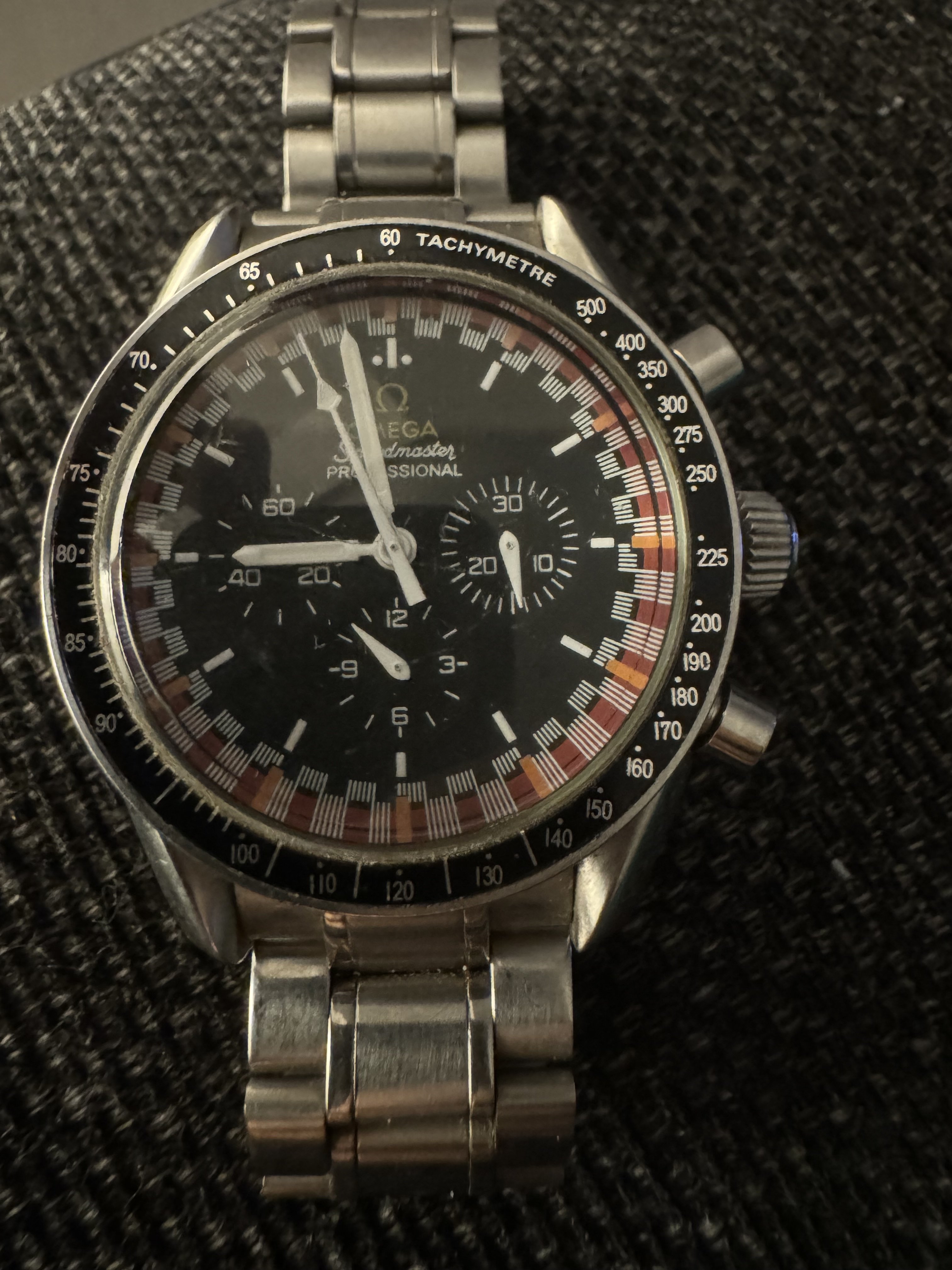 It for sure has a service dial and I’m almost completely confident a service/replacement moon disc. The hands look to be tritium but without lume decay shots, can’t say that with full confidence, though I do believe they are tritium. The case has been refinished. It has service pushers, so I would speculate a service crown as well. A replacement case back too, which is why it looks off to you- The Omega logo is wrong (see pics below for comparison) and the tool notches are slightly larger. But on top of all of this, it lacks the important and expensive 1447/805 original bracelet. It has an Uncle Seiko bracelet on it, which, on top of everything else I mentioned above, will of course greatly affect the price.