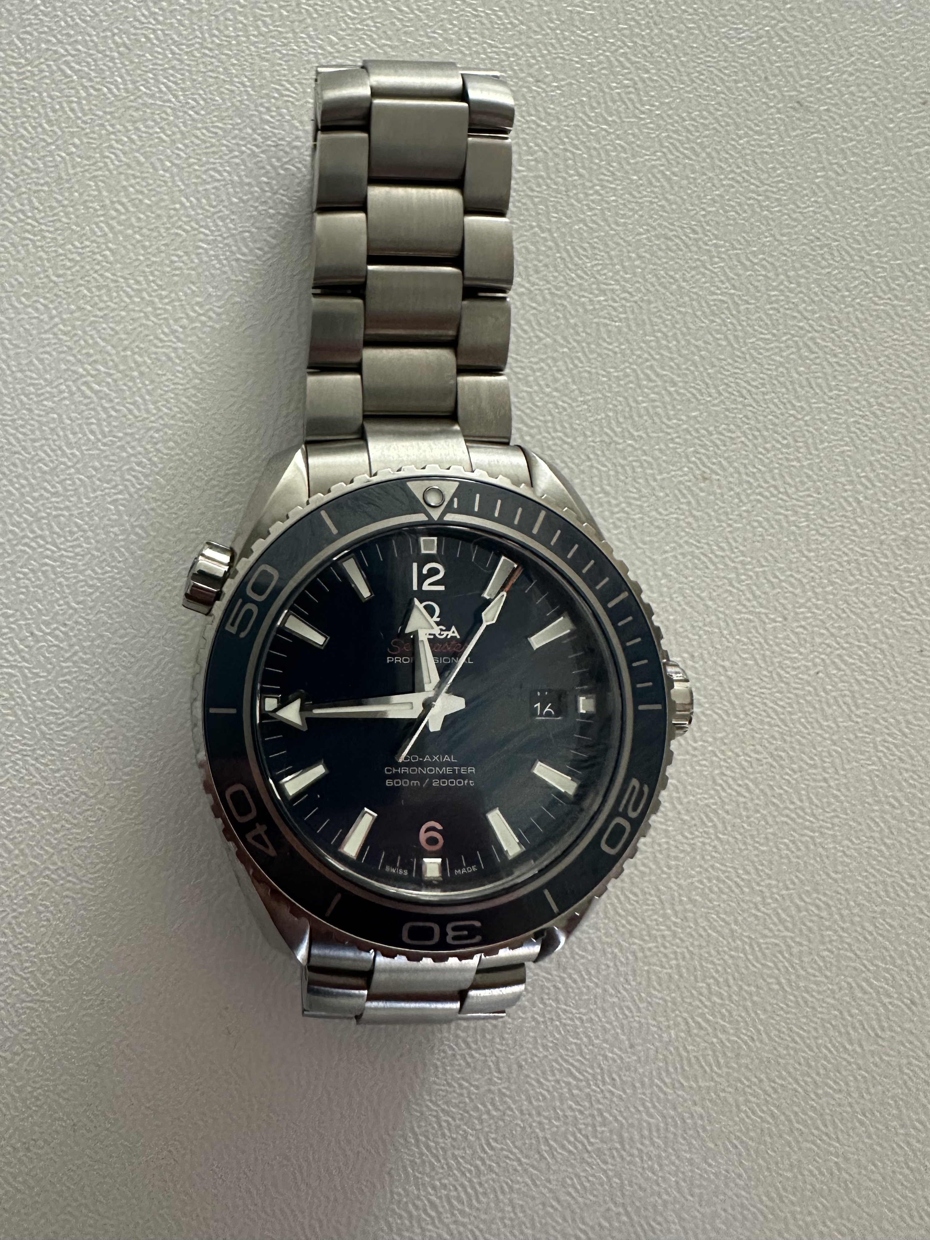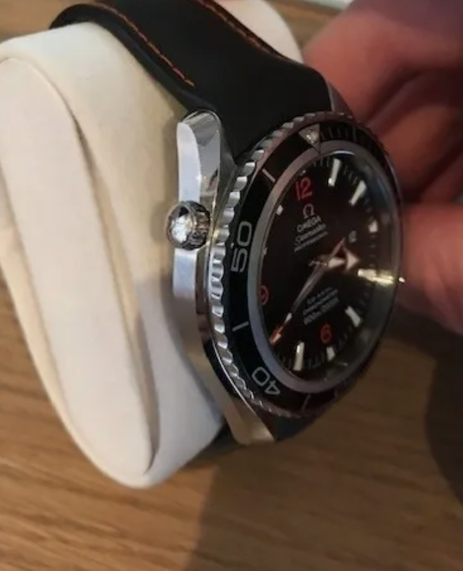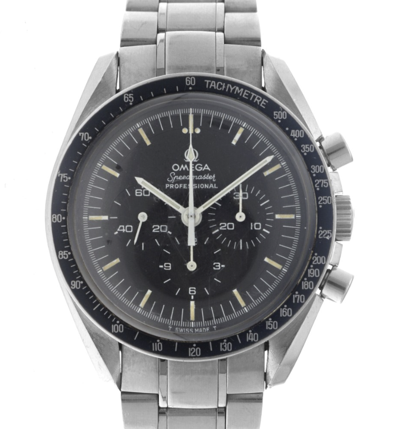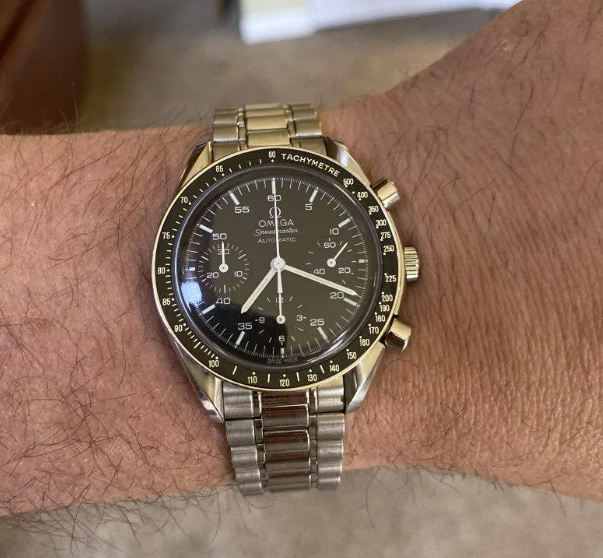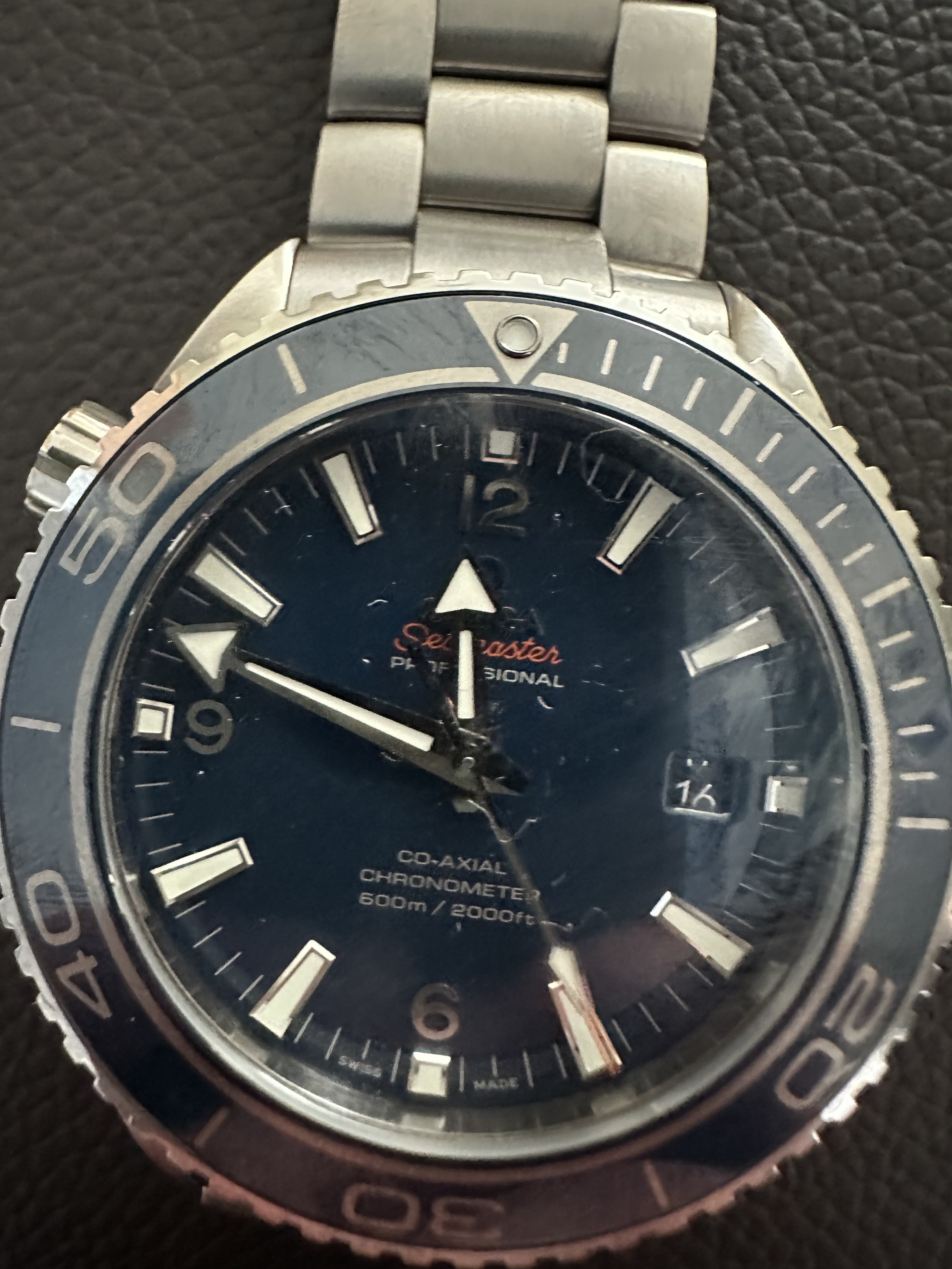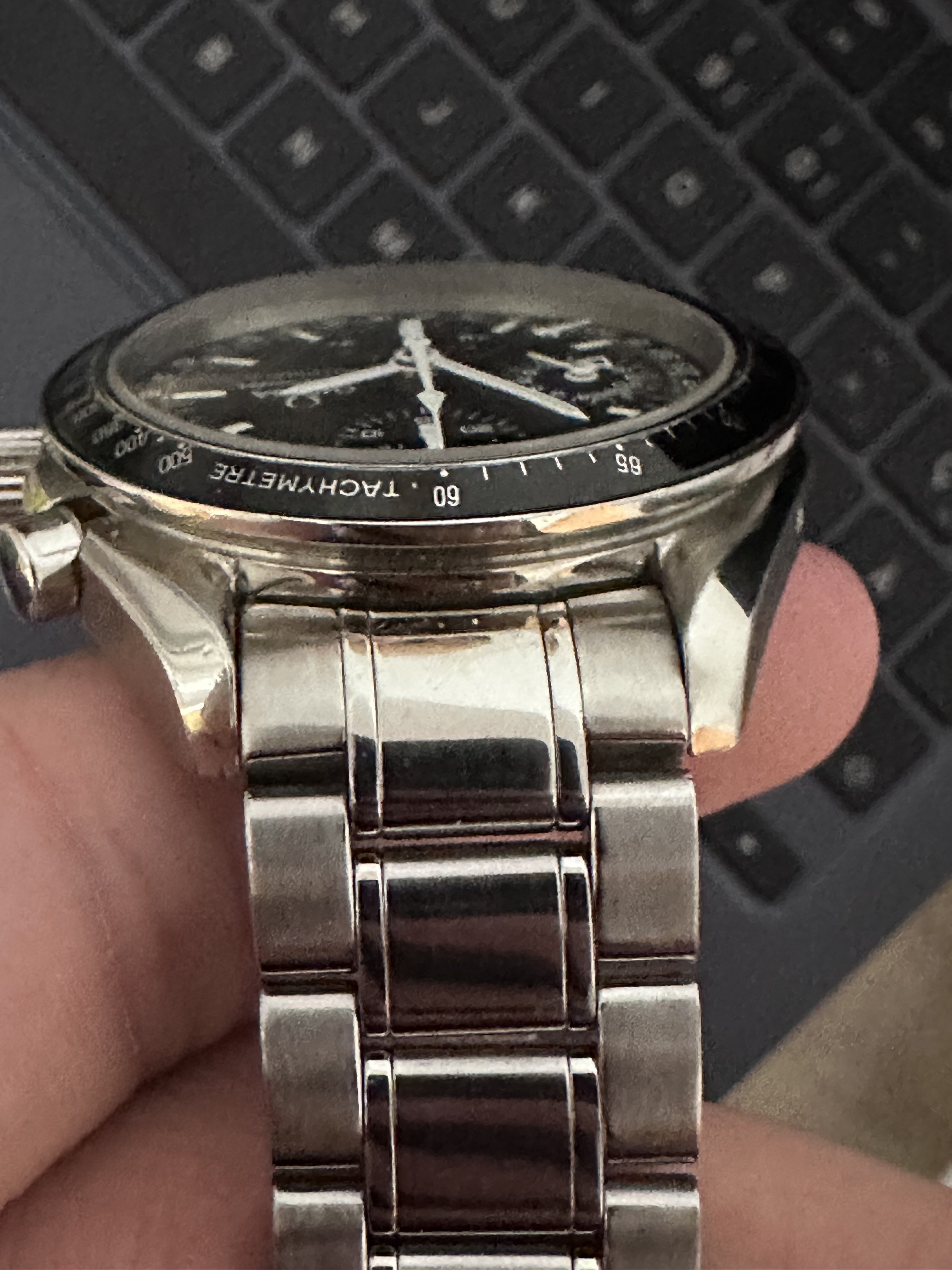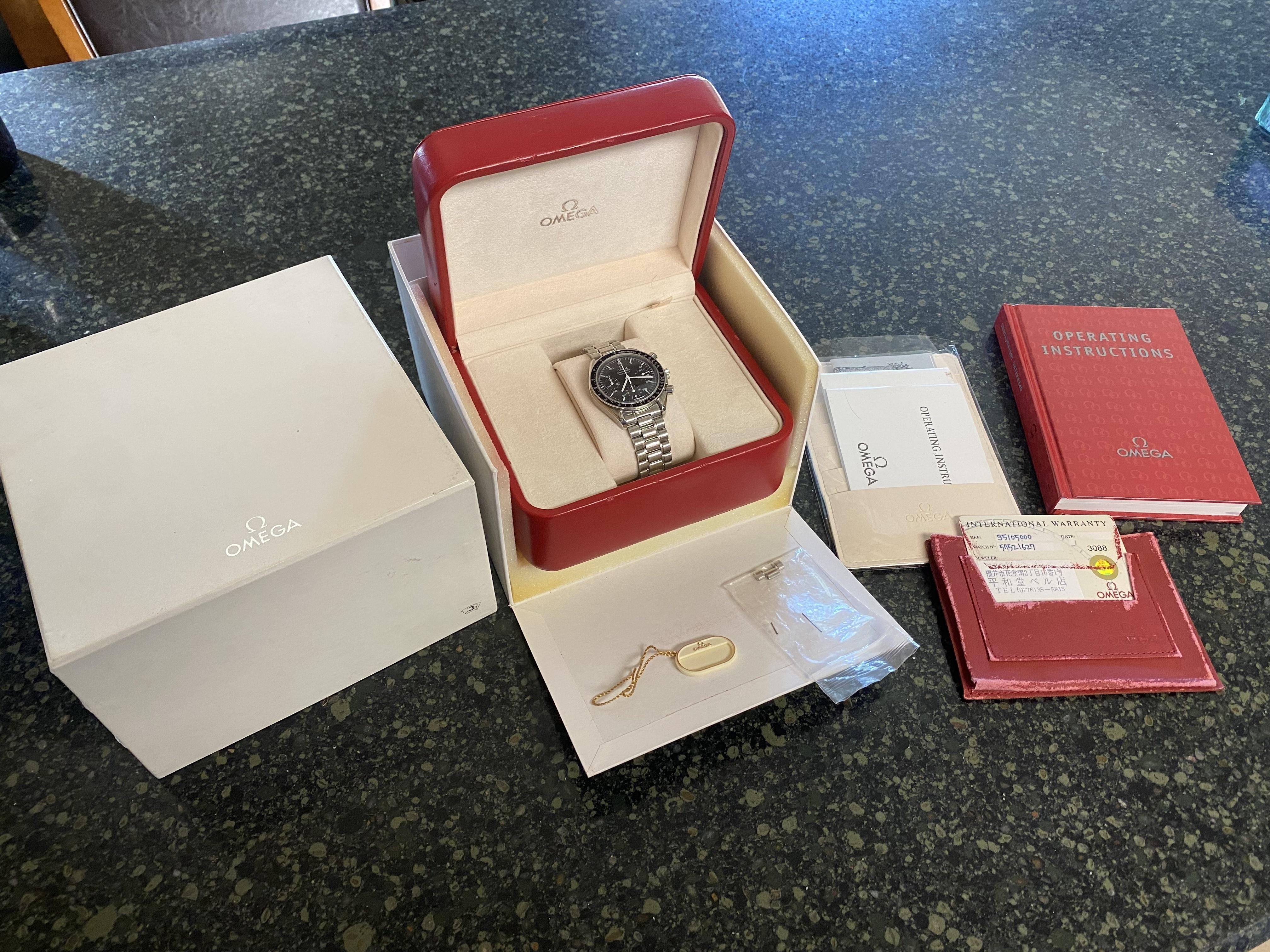 It for sure has a service dial and I’m almost completely confident a service/replacement moon disc. The hands look to be tritium but without lume decay shots, can’t say that with full confidence, though I do believe they are tritium. The case has been refinished. It has service pushers, so I would speculate a service crown as well. A replacement case back too, which is why it looks off to you- The Omega logo is wrong (see pics below for comparison) and the tool notches are slightly larger. But on top of all of this, it lacks the important and expensive 1447/805 original bracelet. It has an Uncle Seiko bracelet on it, which, on top of everything else I mentioned above, will of course greatly affect the price.