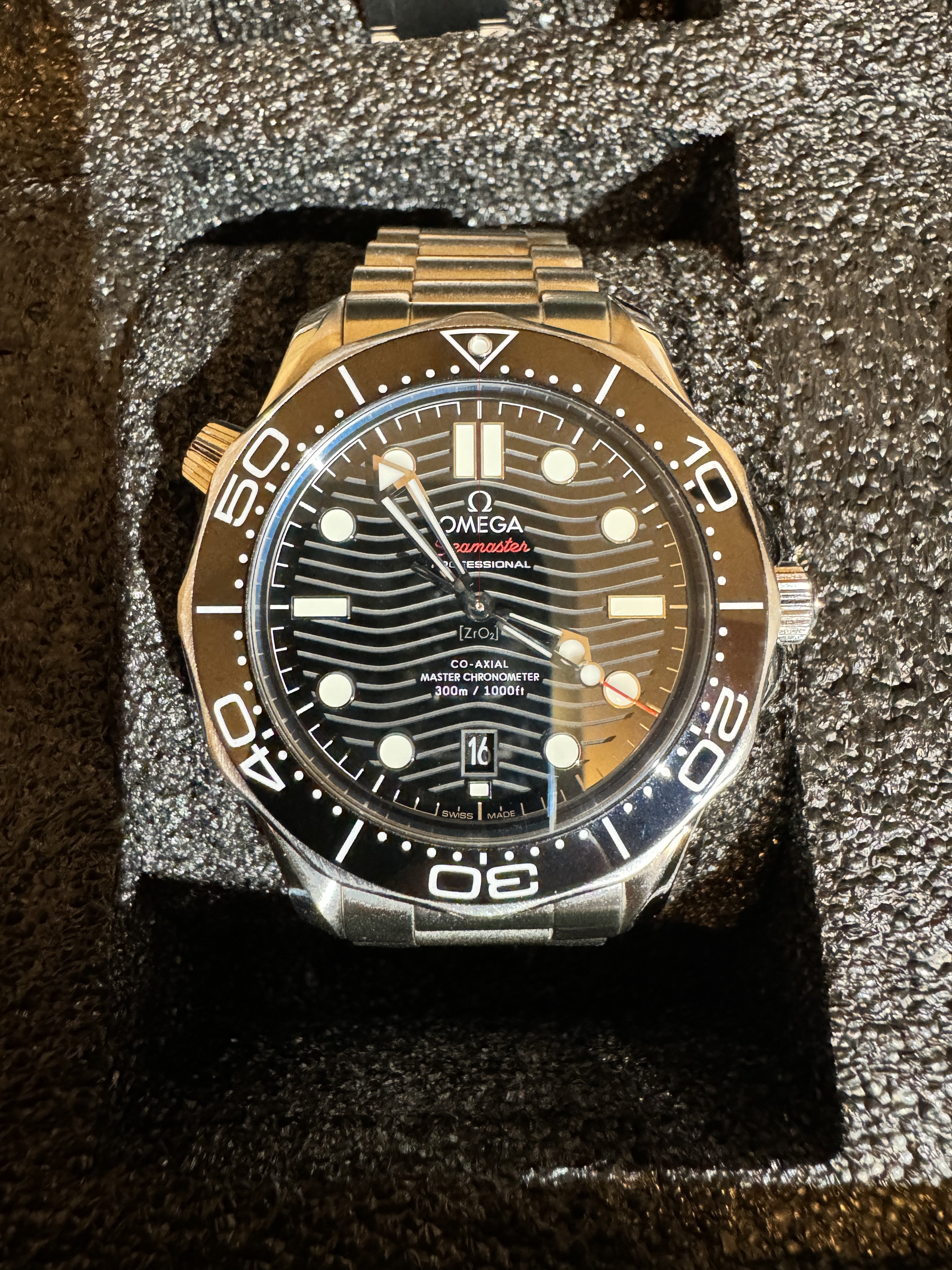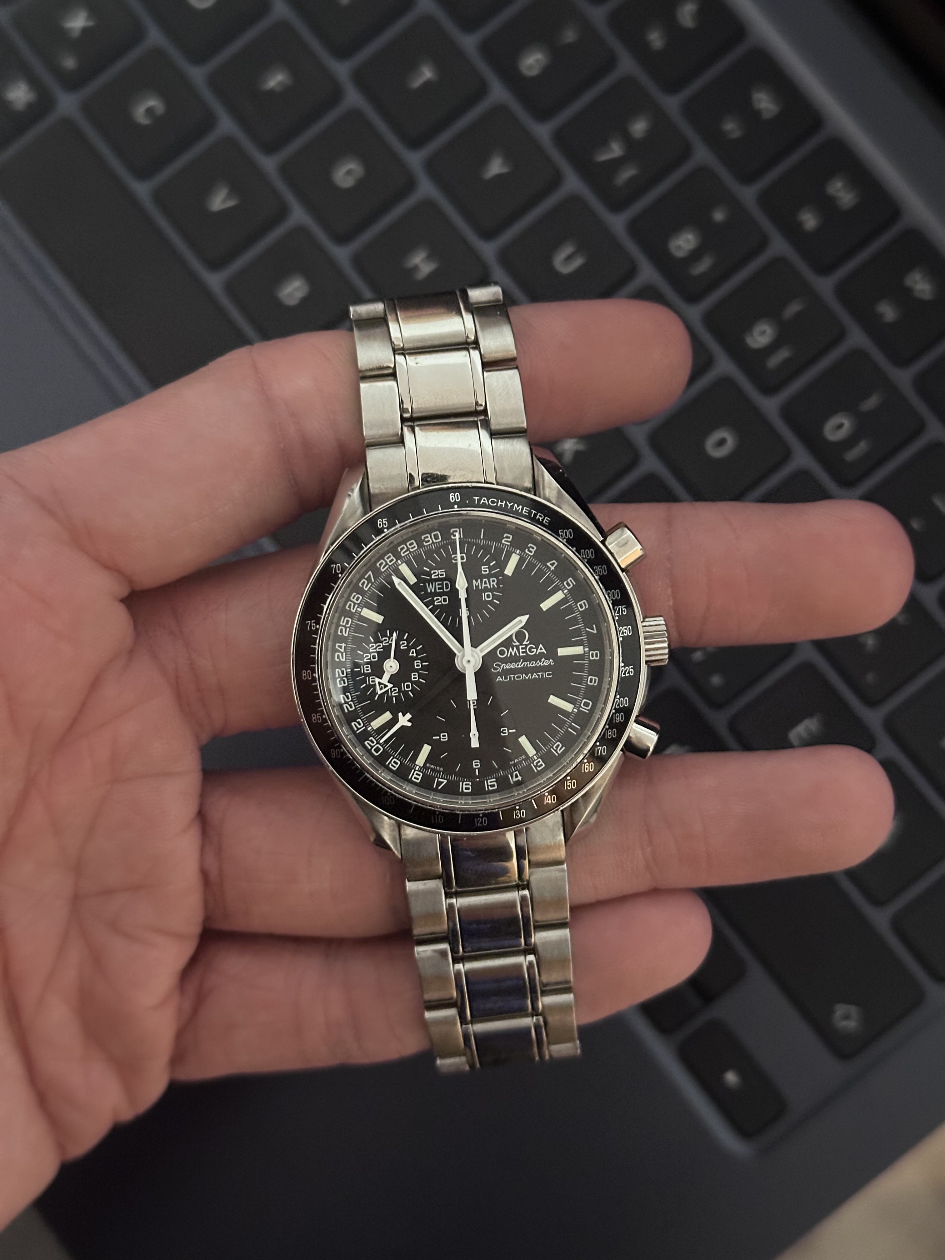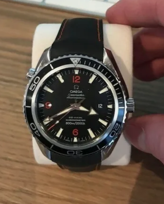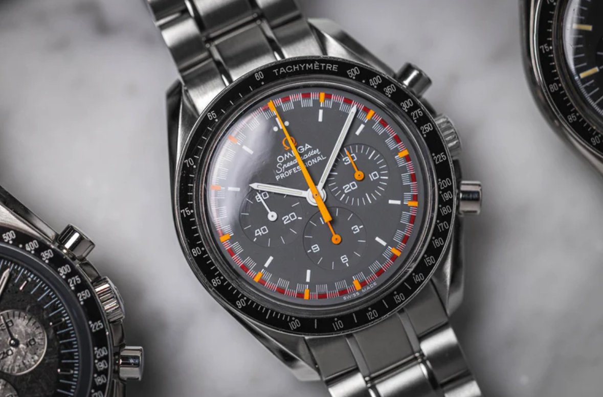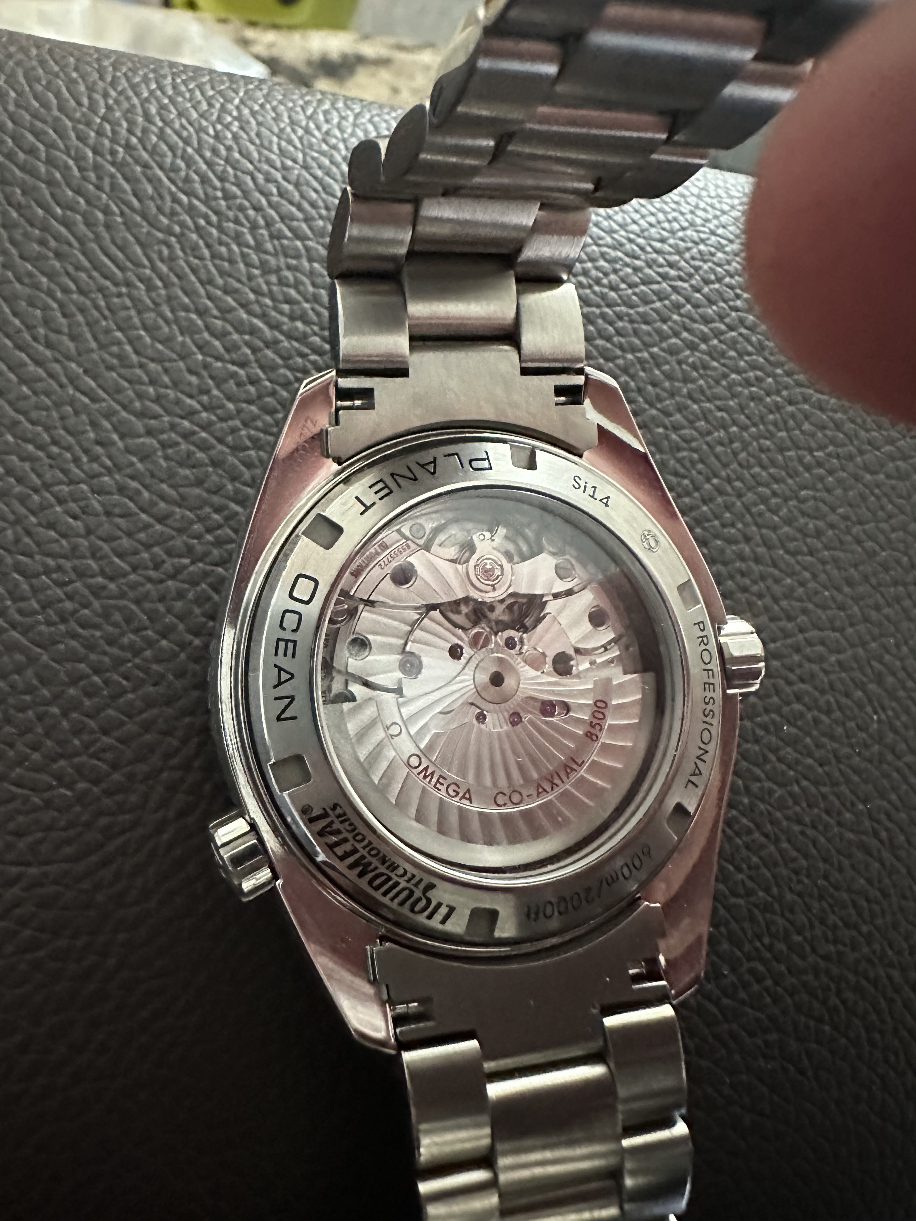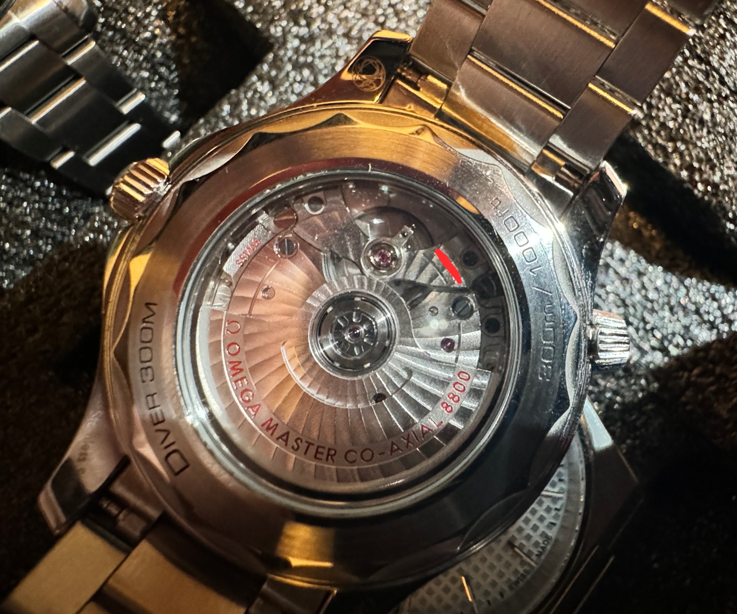 It for sure has a service dial and I’m almost completely confident a service/replacement moon disc. The hands look to be tritium but without lume decay shots, can’t say that with full confidence, though I do believe they are tritium. The case has been refinished. It has service pushers, so I would speculate a service crown as well. A replacement case back too, which is why it looks off to you- The Omega logo is wrong (see pics below for comparison) and the tool notches are slightly larger. But on top of all of this, it lacks the important and expensive 1447/805 original bracelet. It has an Uncle Seiko bracelet on it, which, on top of everything else I mentioned above, will of course greatly affect the price.