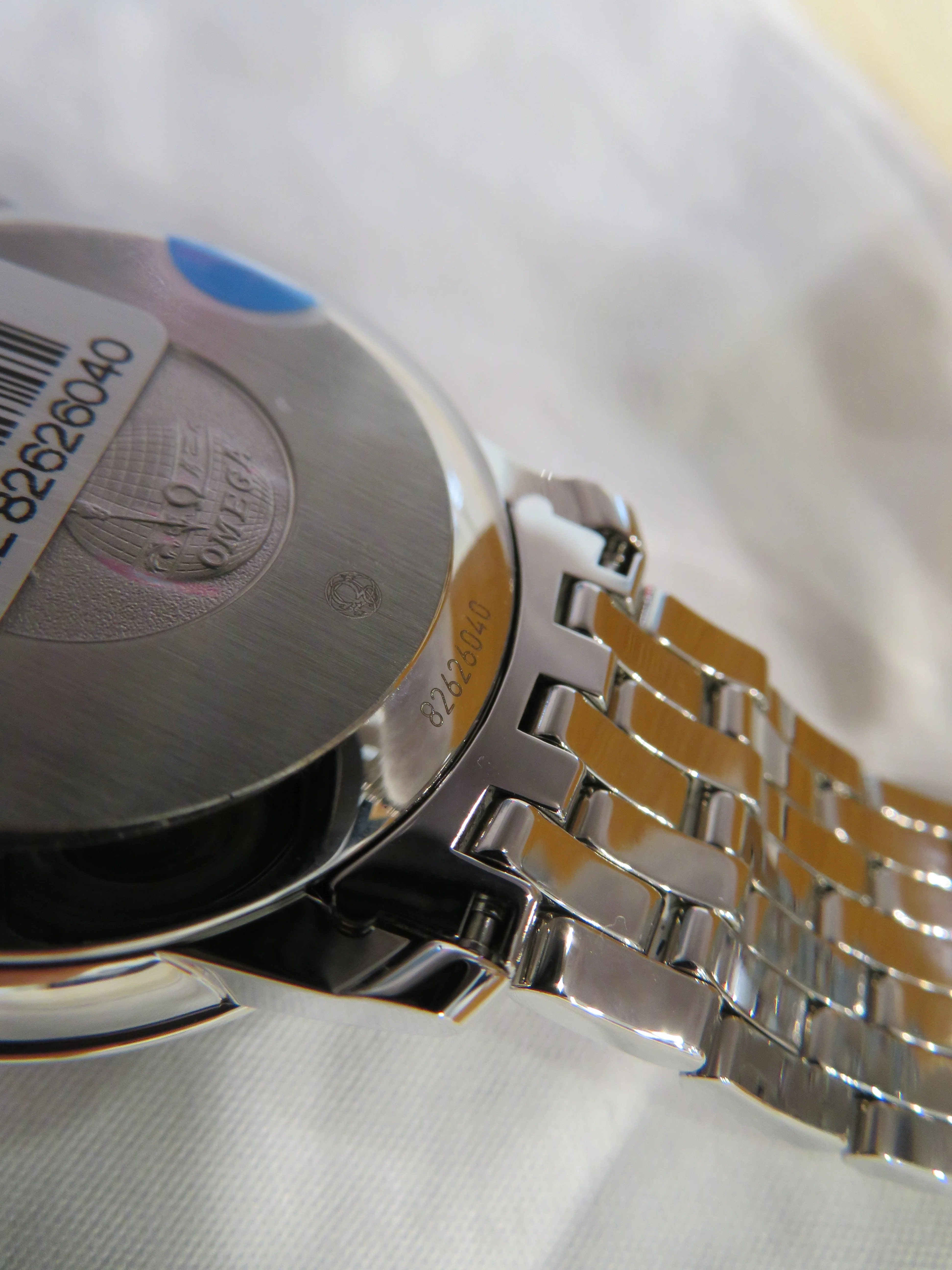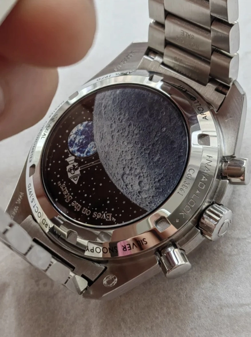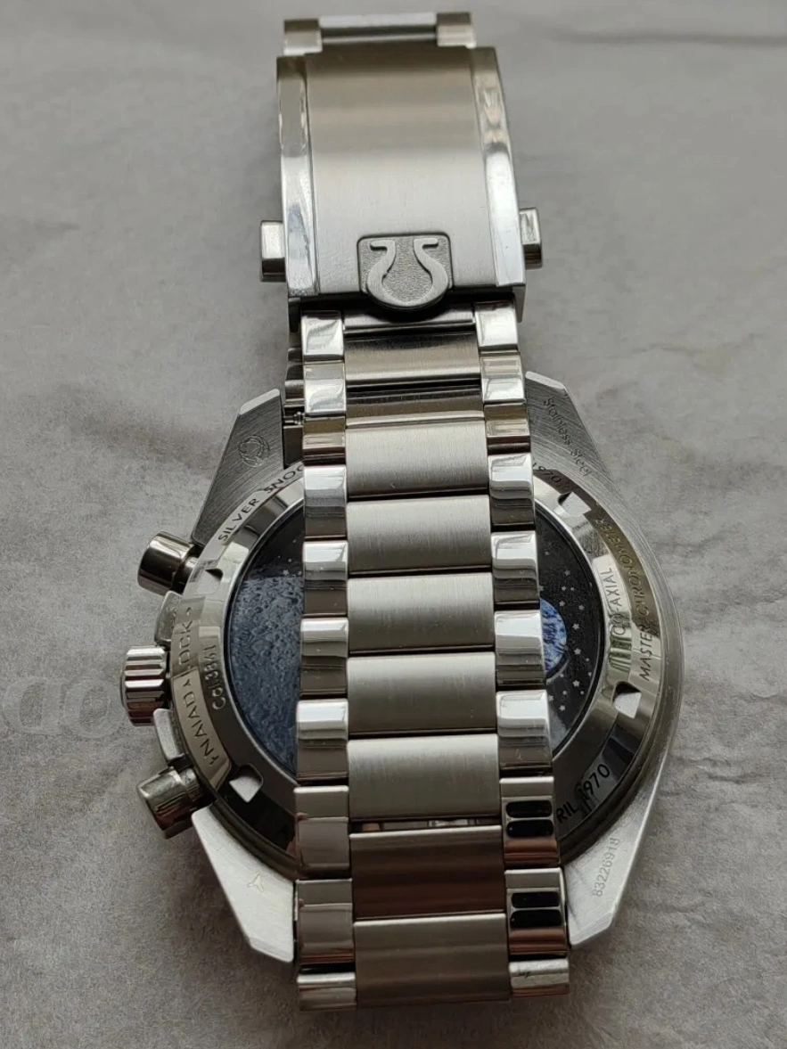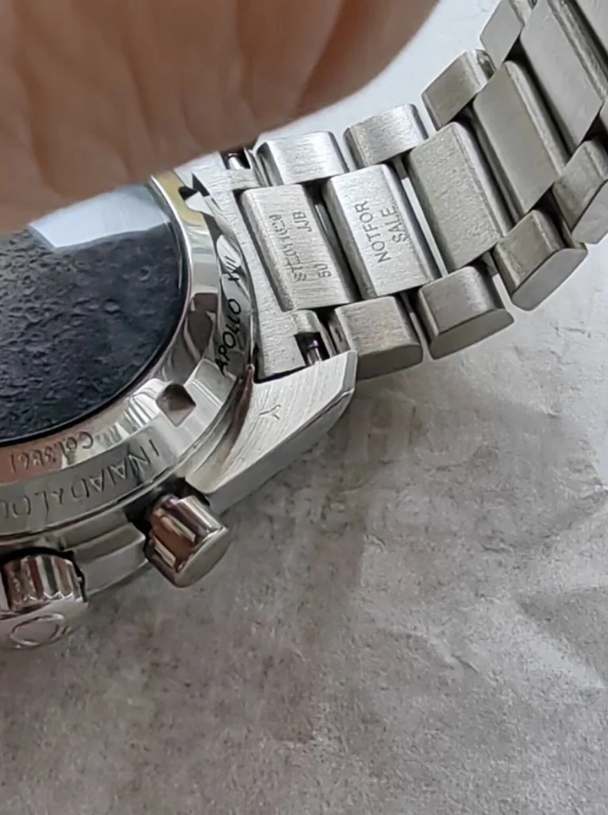 CDN chrono, seems more or less ok, but also raises one question. The bezel is aftermarket, but the seller is honest about it, and there are pictures to confirm it. The bracelet looks genuine for my eye and so do endlinks. It seems that tthere is serial number where it should be. BUT it seems quite strange to me that two of the pictures are from different watch, presumably Speedmaster, also with completely different clasp and bracelet. Why one should put pictures which very obviously does not belong here?