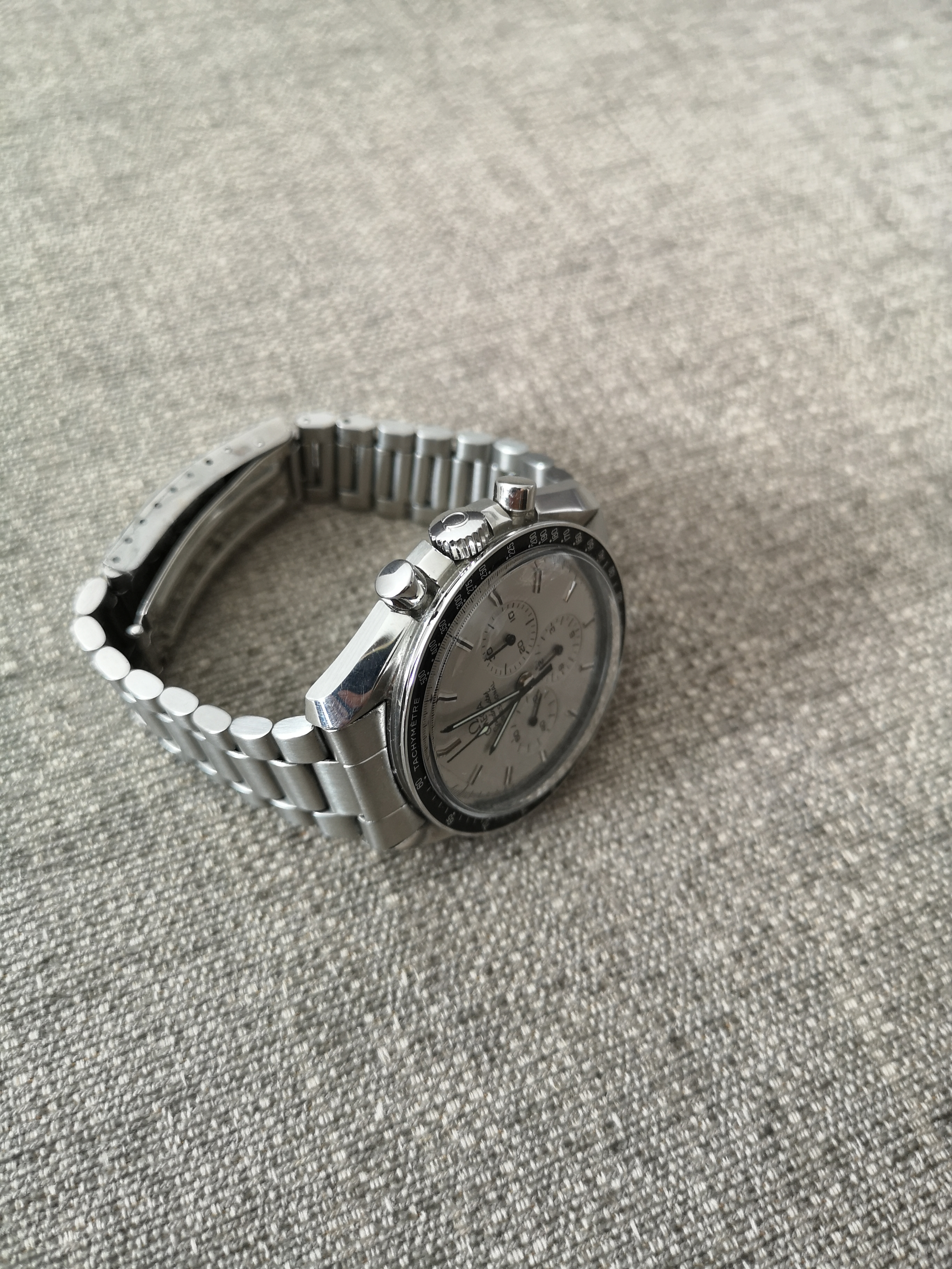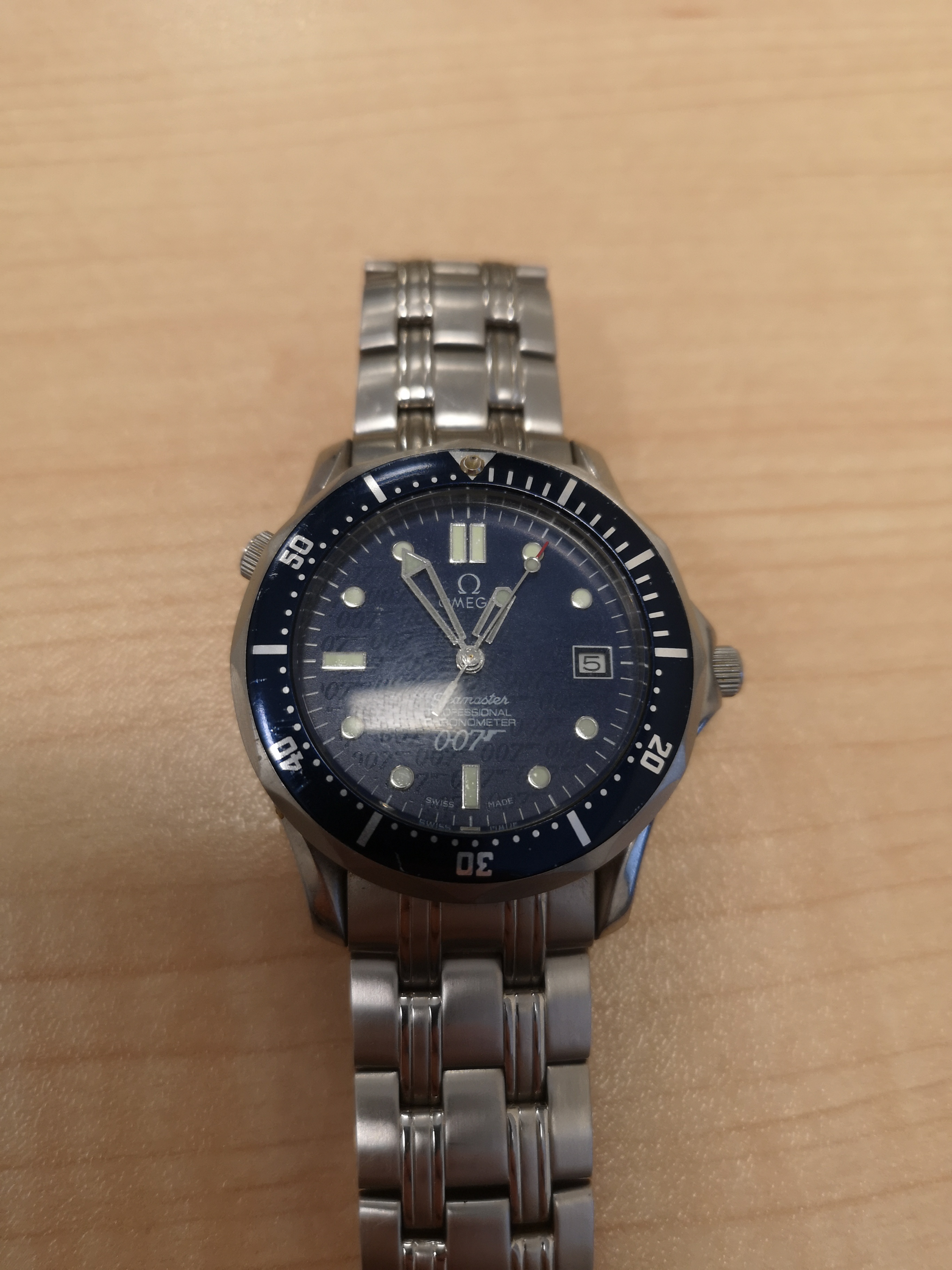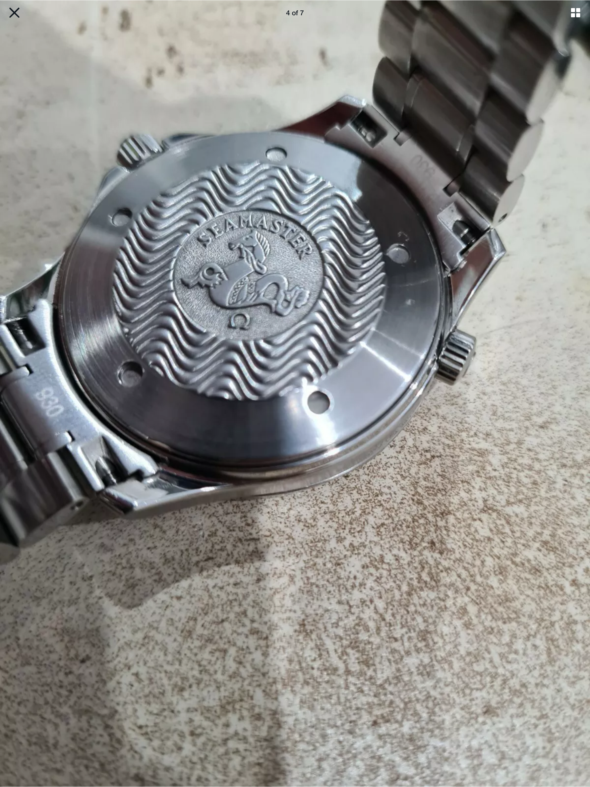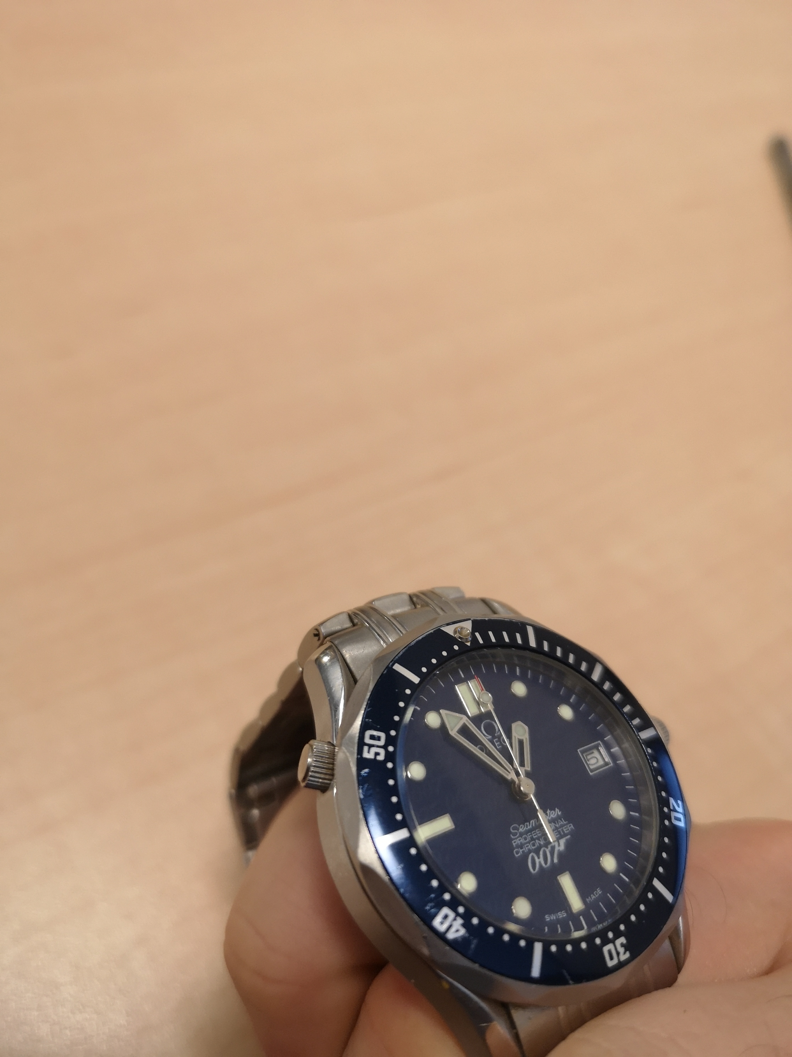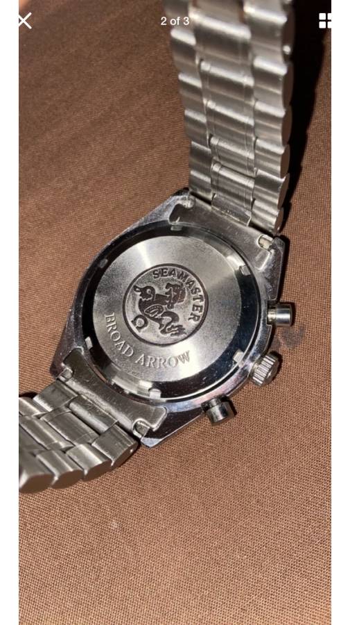 This nightmareish thing popped up in an ebay email alert earlier for a Buy It Now £200 + £5 postage. Even I know that this one is all over the place. It was listed as a 'broken omega watch'. Somebody snapped it up pretty quickly as it is now showing as sold. The caseback says Broad Arrow on it but the hands are baton hands. The bracelet clasp says Seamaster Professional on a Speedy. The numbers on the bezel change orientation half way round and the lume blob to the left of the 3 at the top of the dial is off centre. Seller also mentions that the battery may just need changing! Nasty...