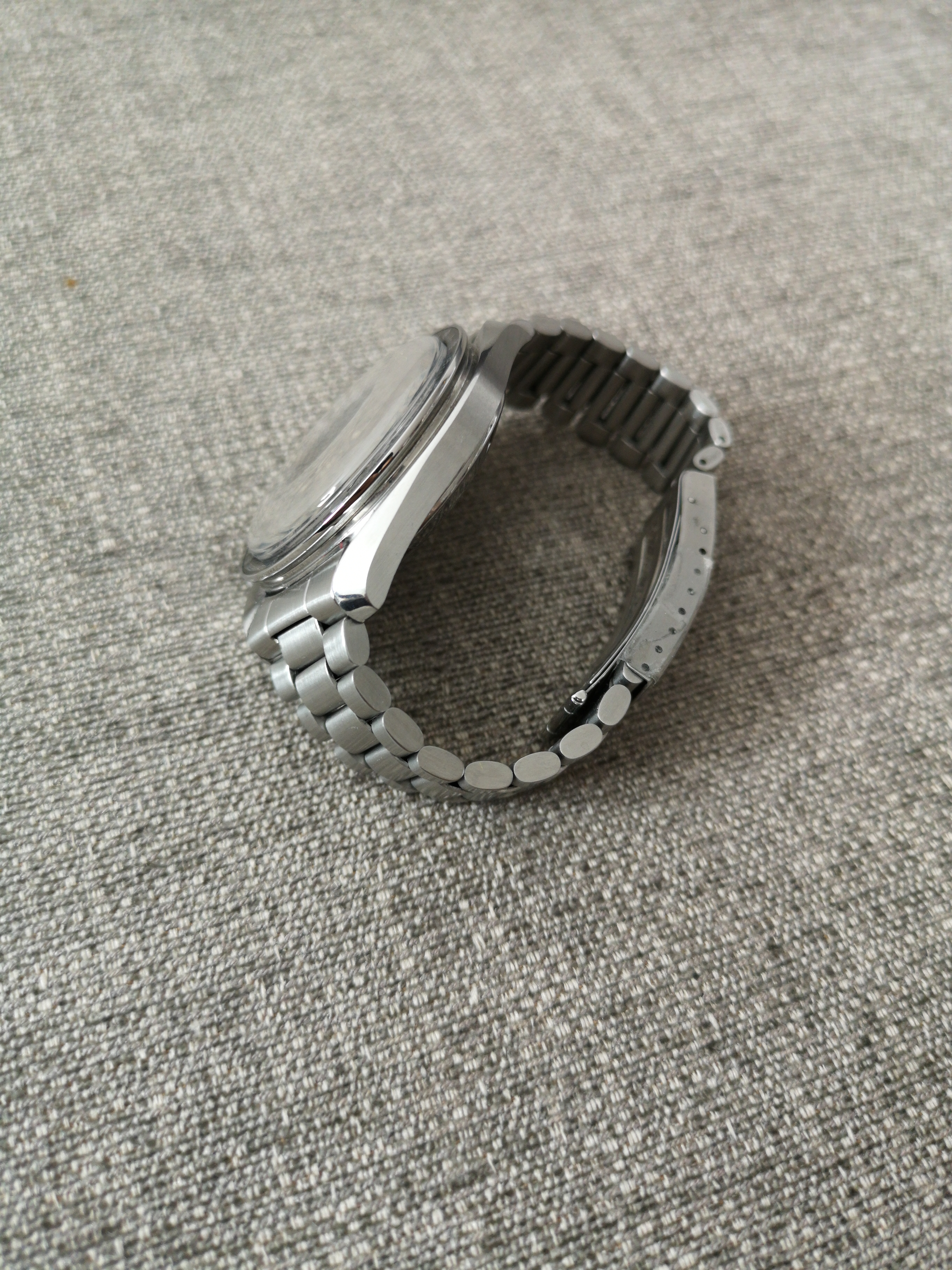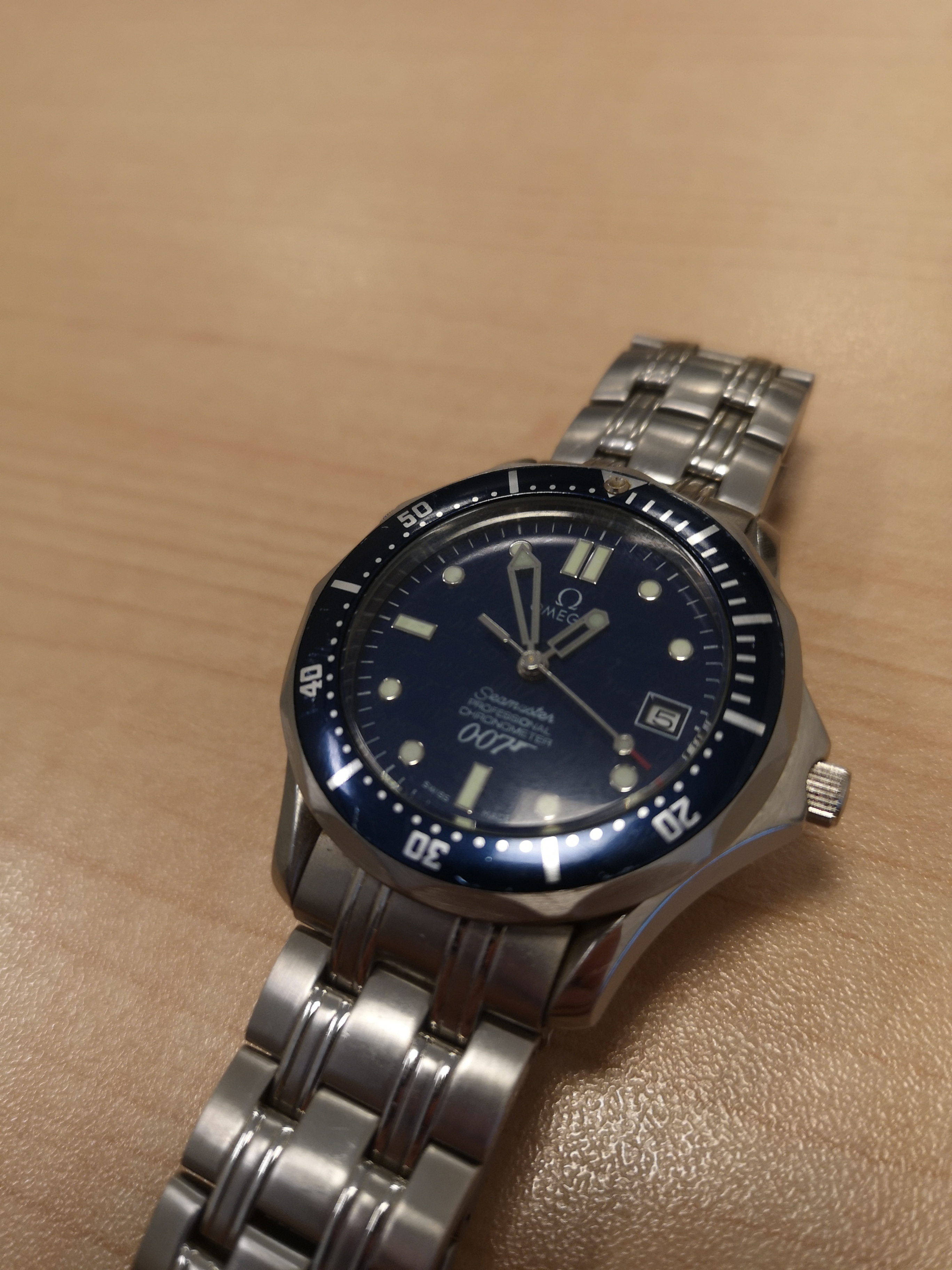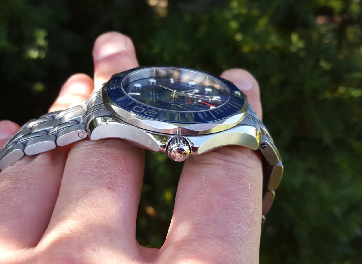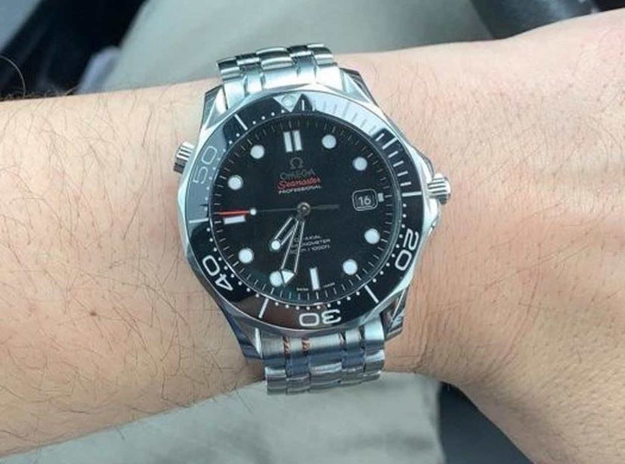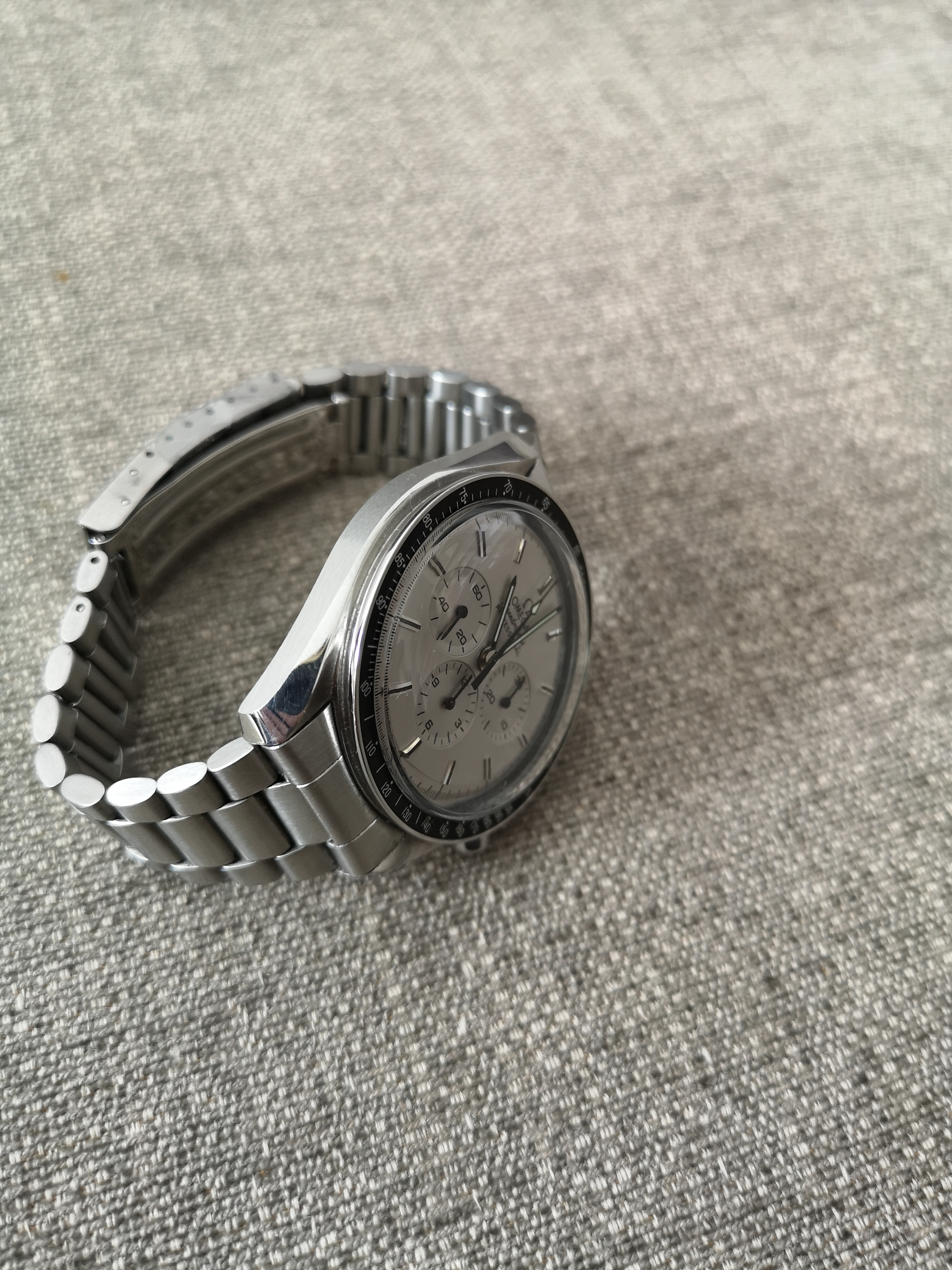 This nightmareish thing popped up in an ebay email alert earlier for a Buy It Now £200 + £5 postage. Even I know that this one is all over the place. It was listed as a 'broken omega watch'. Somebody snapped it up pretty quickly as it is now showing as sold. The caseback says Broad Arrow on it but the hands are baton hands. The bracelet clasp says Seamaster Professional on a Speedy. The numbers on the bezel change orientation half way round and the lume blob to the left of the 3 at the top of the dial is off centre. Seller also mentions that the battery may just need changing! Nasty...