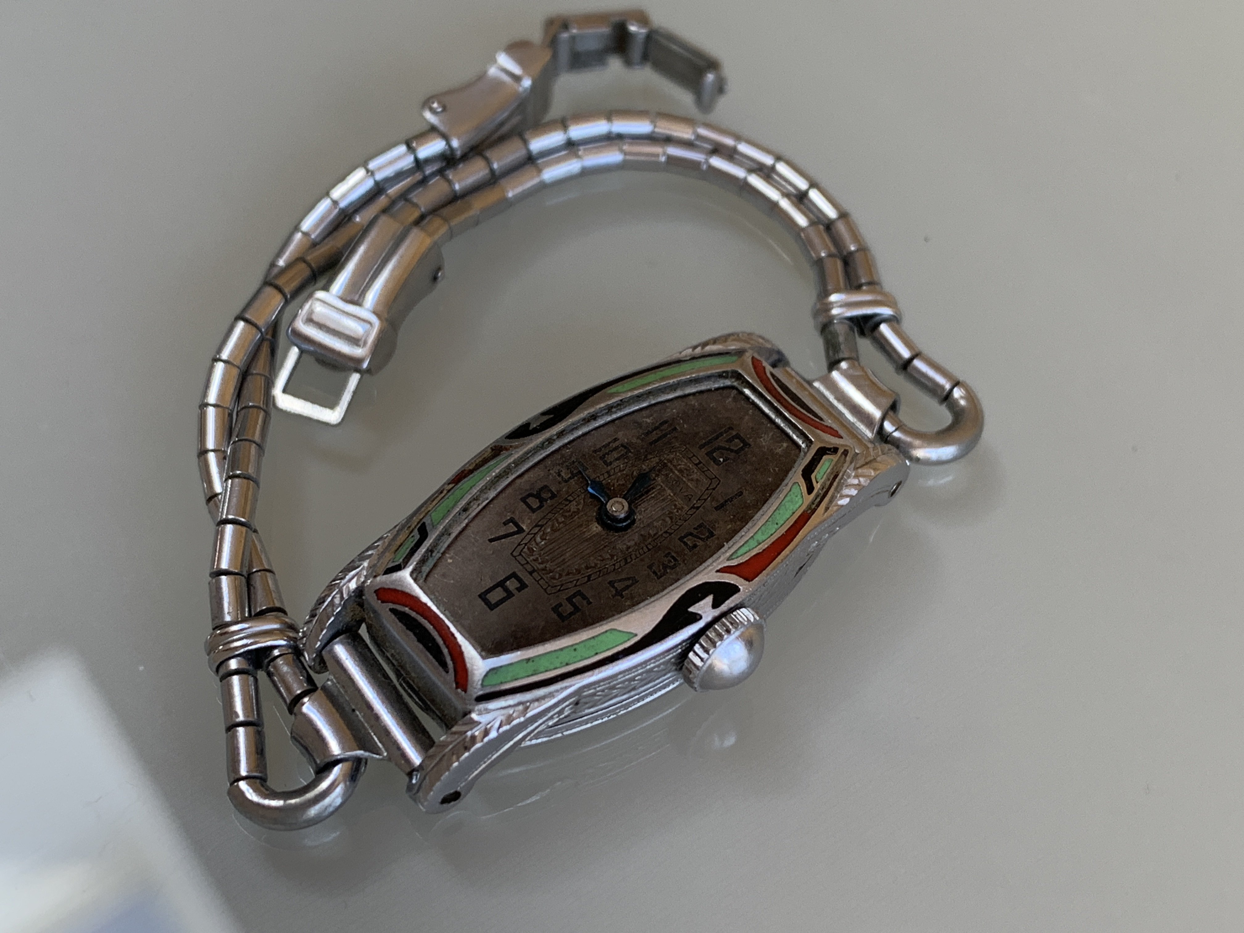 A mid-1920's Bulova Deauville/Lady Lindy. It's a ladies watch for which the case has vitrified enamel inlay in several colours.