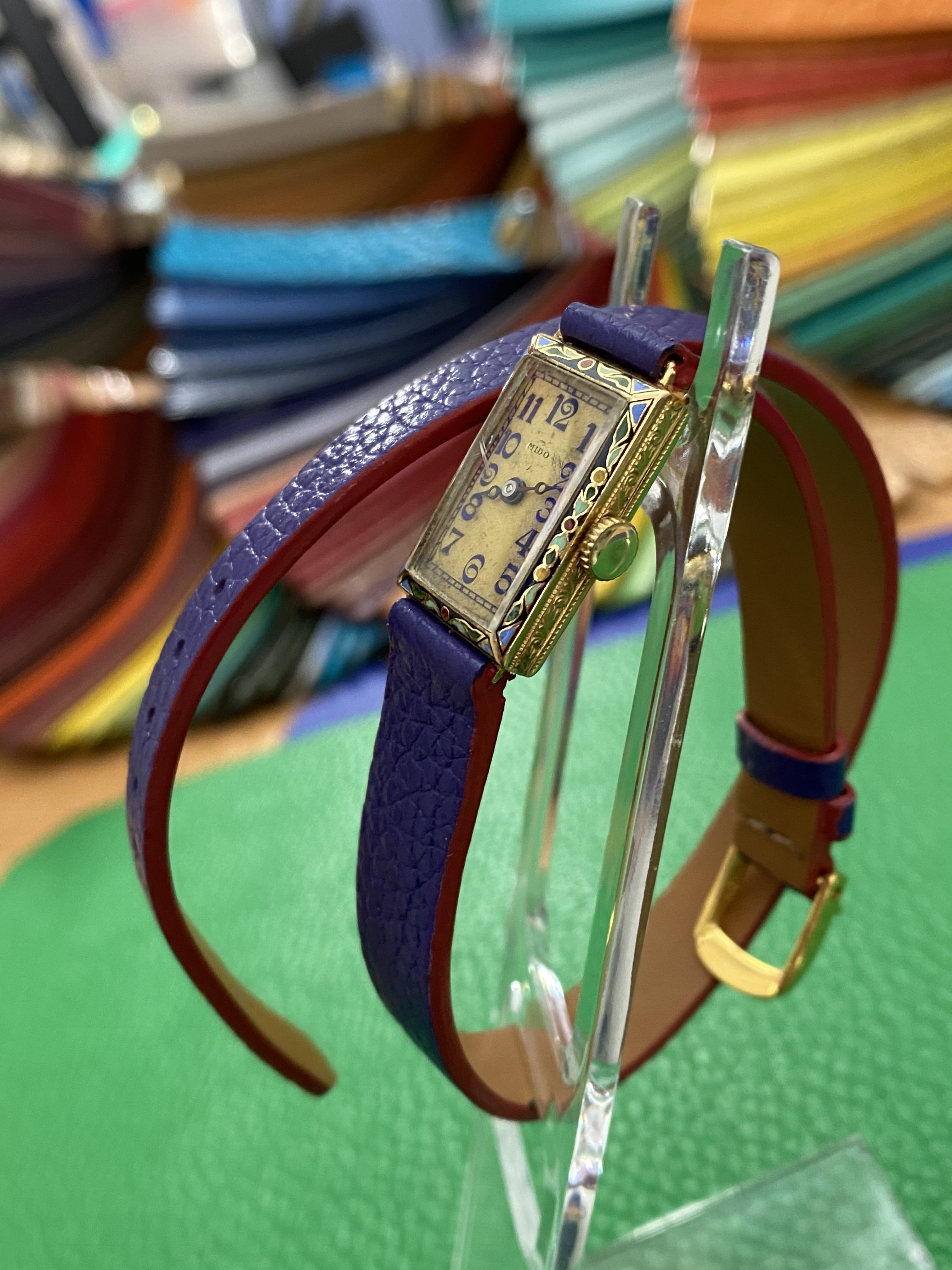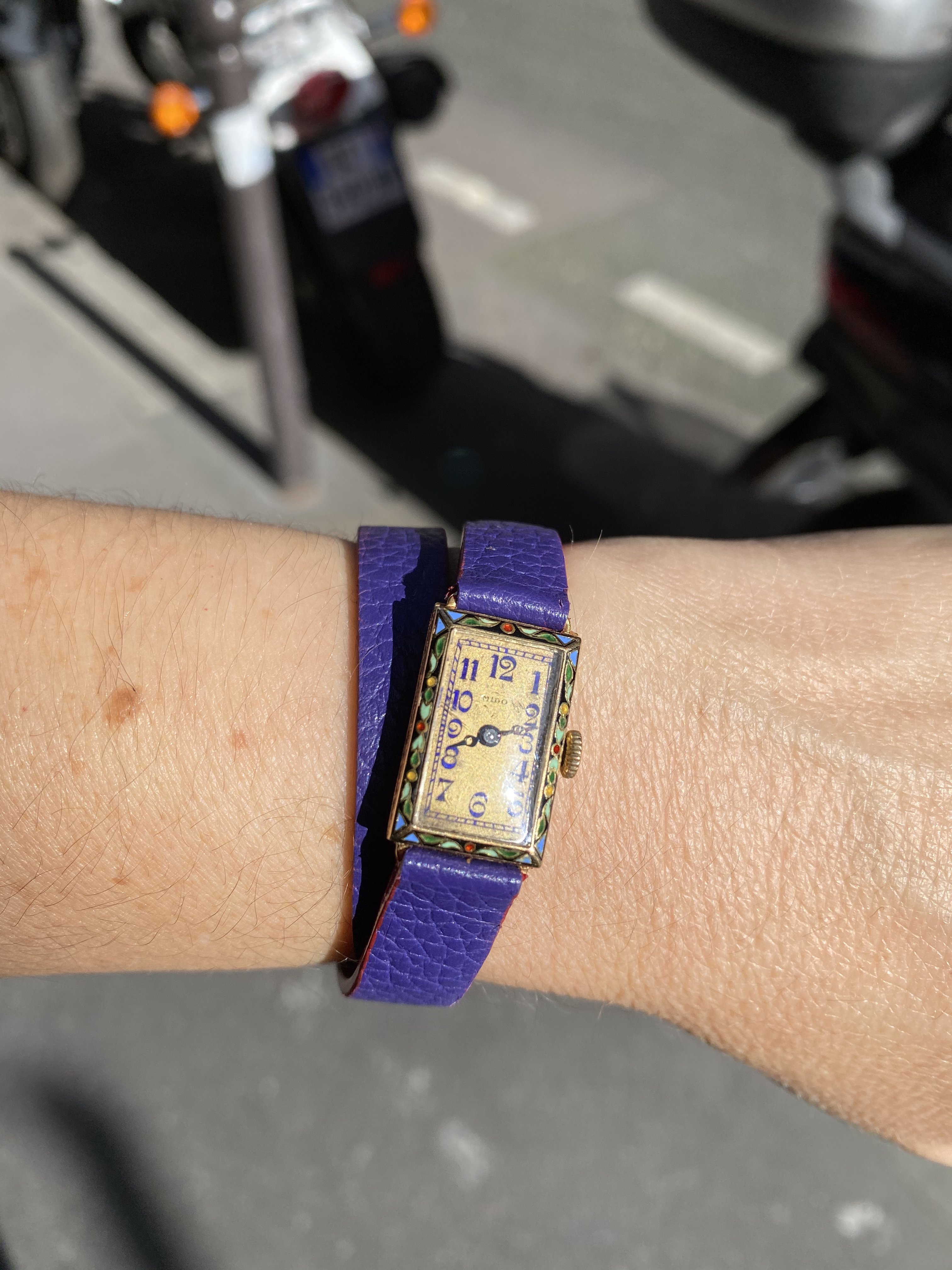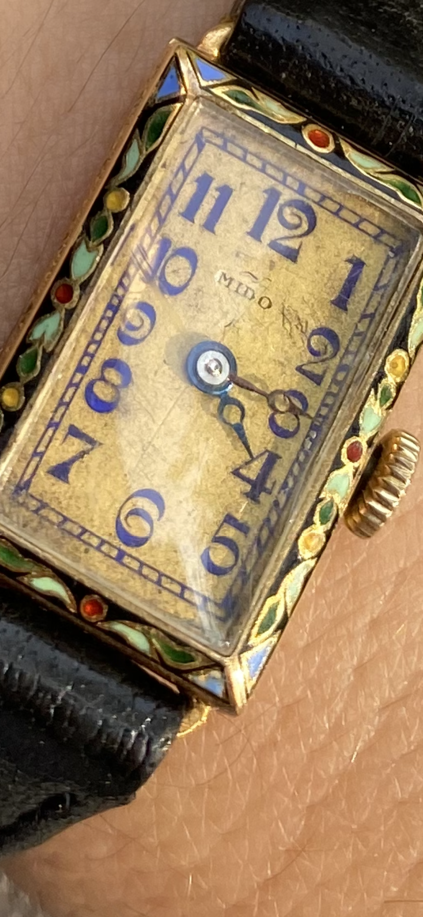 This lovely Mido now has a new hour hand. As it turns out the handset was purple. I insisted on retaining the original purple minute hand. My watchmaker really talked me out of “repurpling” the replacement hour hand, even though it’s doable, because it would be about an hour of labor, and it still won’t be the original hand. Plus they’re so tiny the difference in hue is not really noticeable to the naked eye.