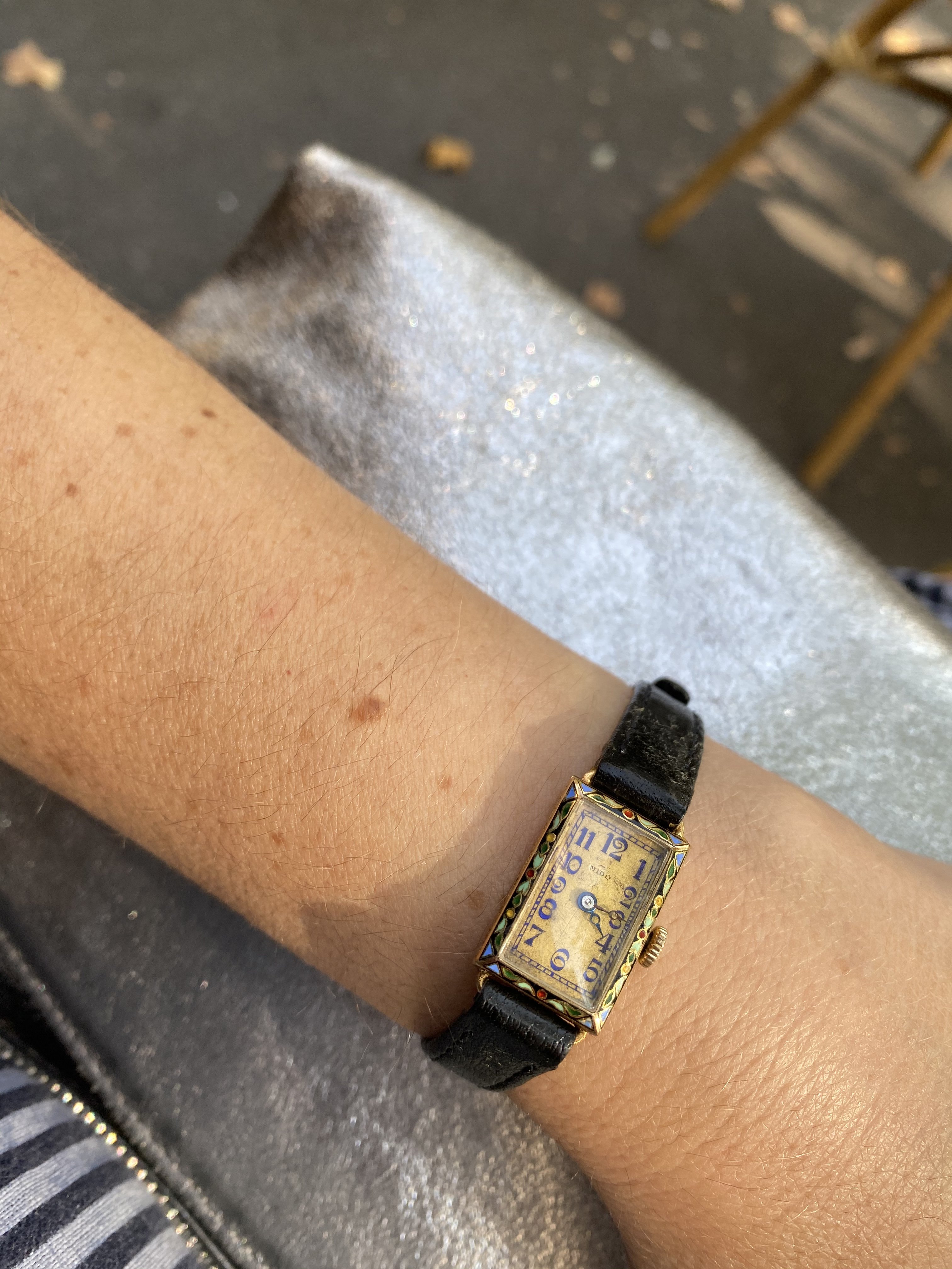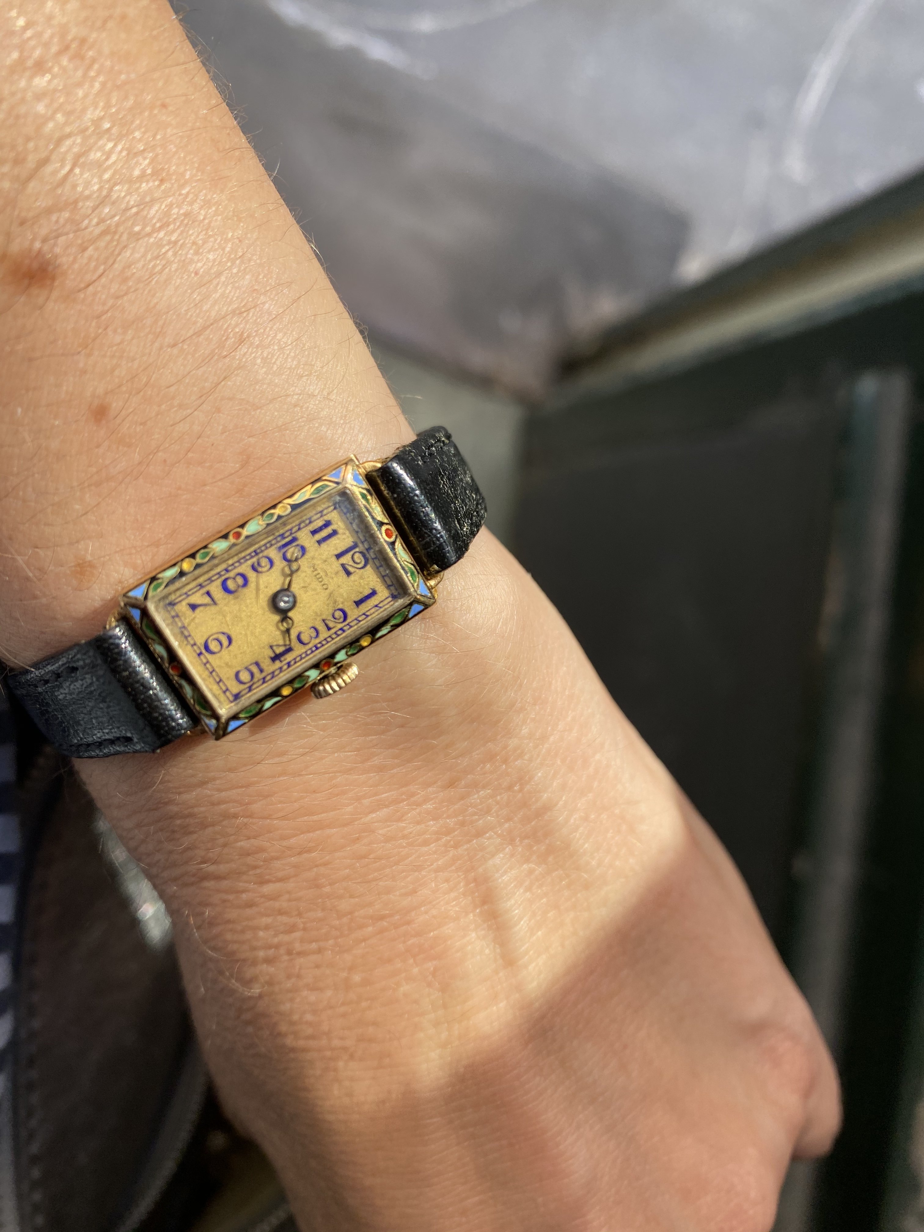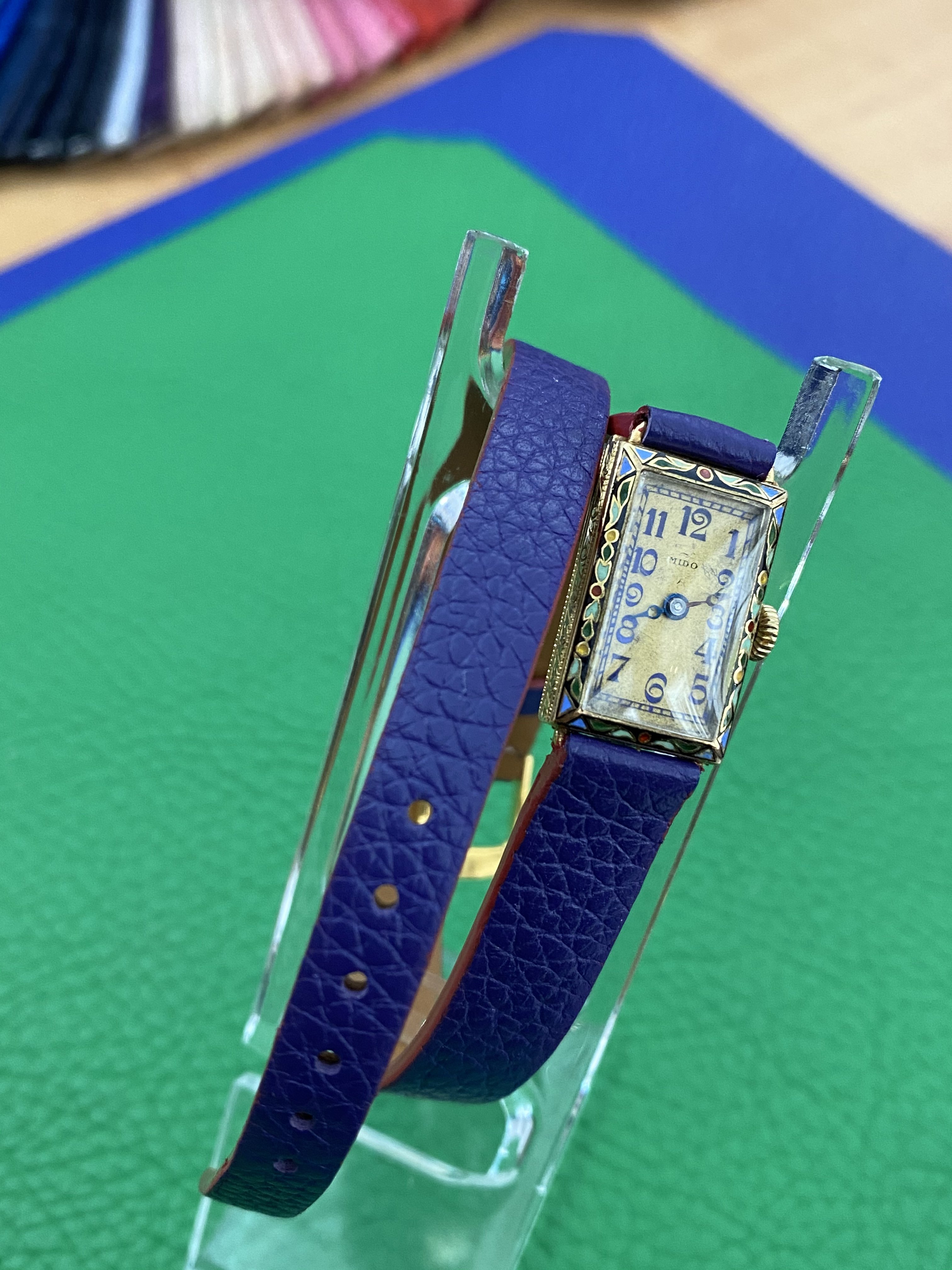 This lovely Mido now has a new hour hand. As it turns out the handset was purple. I insisted on retaining the original purple minute hand. My watchmaker really talked me out of “repurpling” the replacement hour hand, even though it’s doable, because it would be about an hour of labor, and it still won’t be the original hand. Plus they’re so tiny the difference in hue is not really noticeable to the naked eye.
