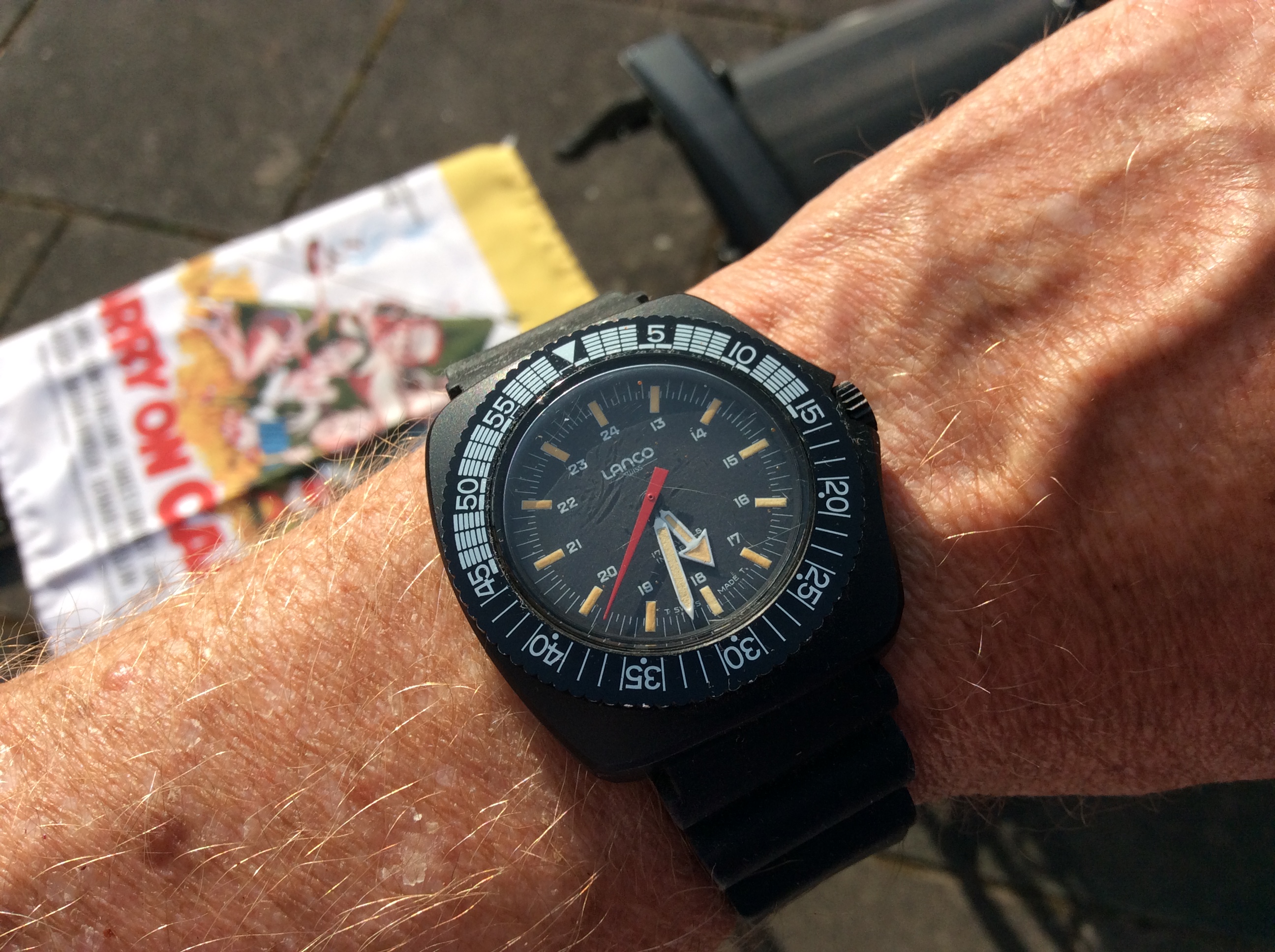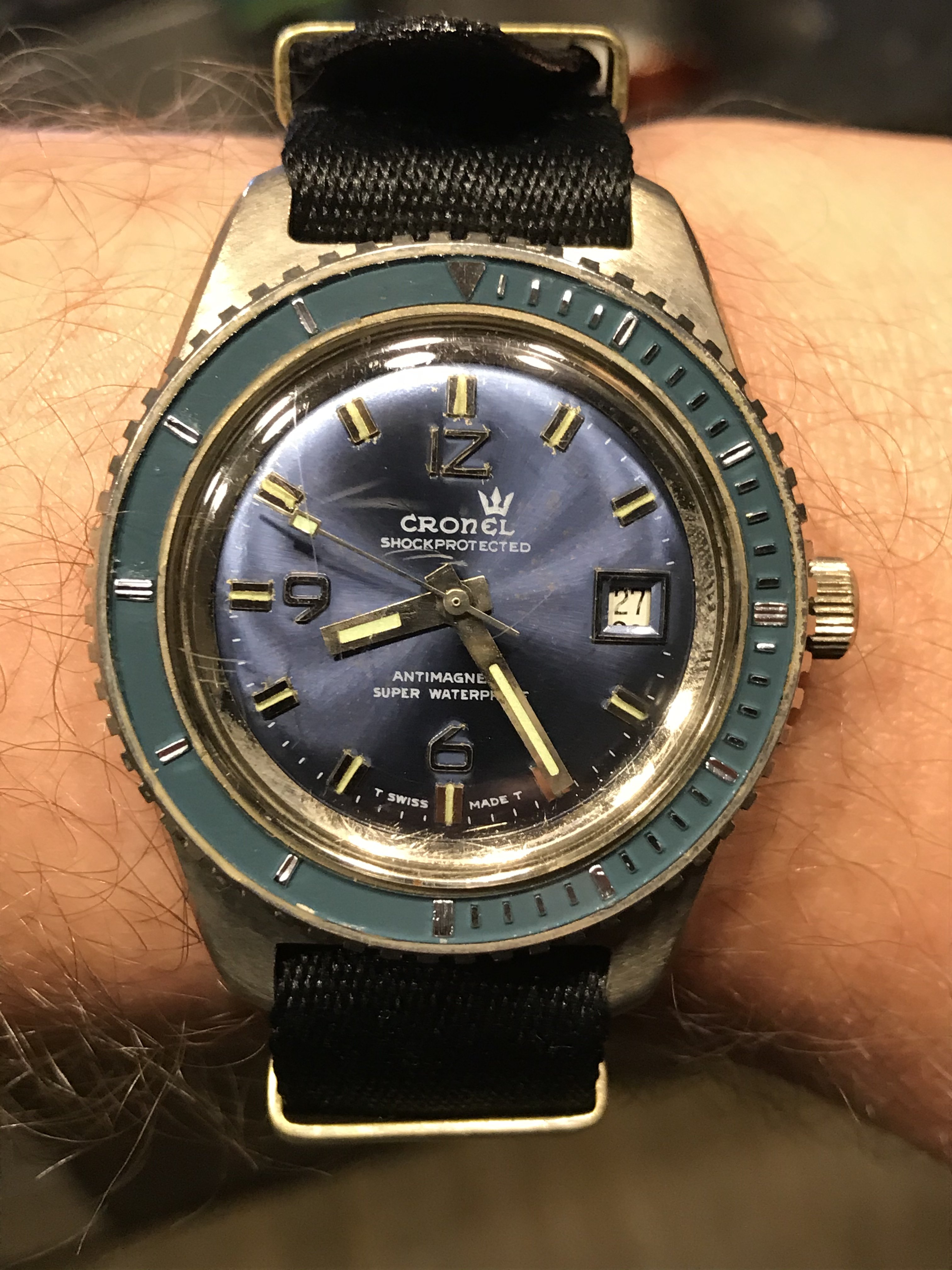 Vintage beater: Beater watches are great, but I also like to have a slightly less valuable vintage watch to wear in situations that might not necessarily be very rough, but where I want something a bit nicer than a beater even though there could be exposure to sand/dust or water /sweat etc. I picked up this Cronel skindiver for cheap off eBay and it fits the bill wonderfully!