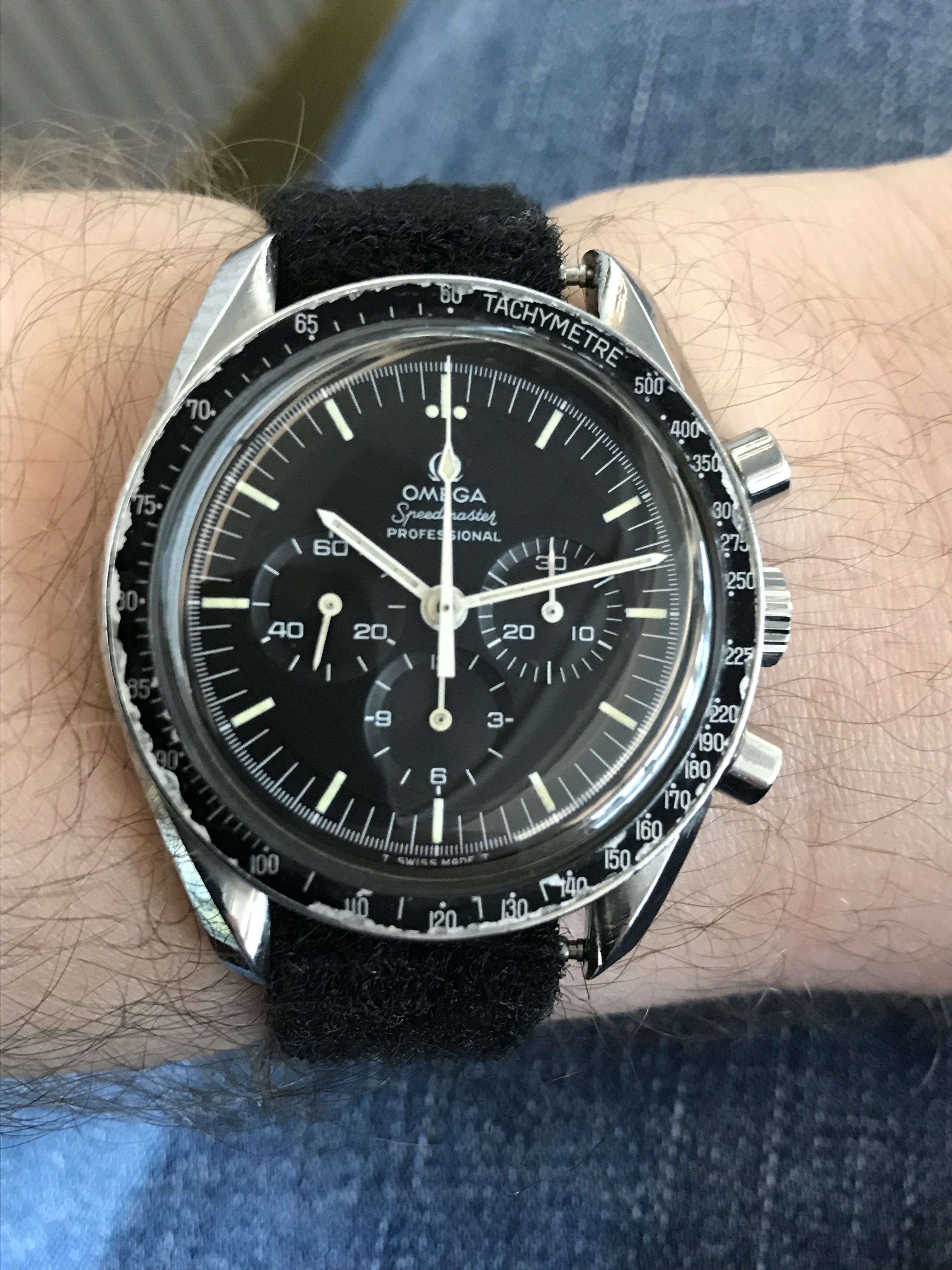 My old beater was this 220 that I bought in only slightly less chewed condition, it wasn't that cheap but it came on a nice 1039. Loved this thing, combined the Speedmaster experience with the don't-care beater experience. Sadly stolen along with all my other watches last October.