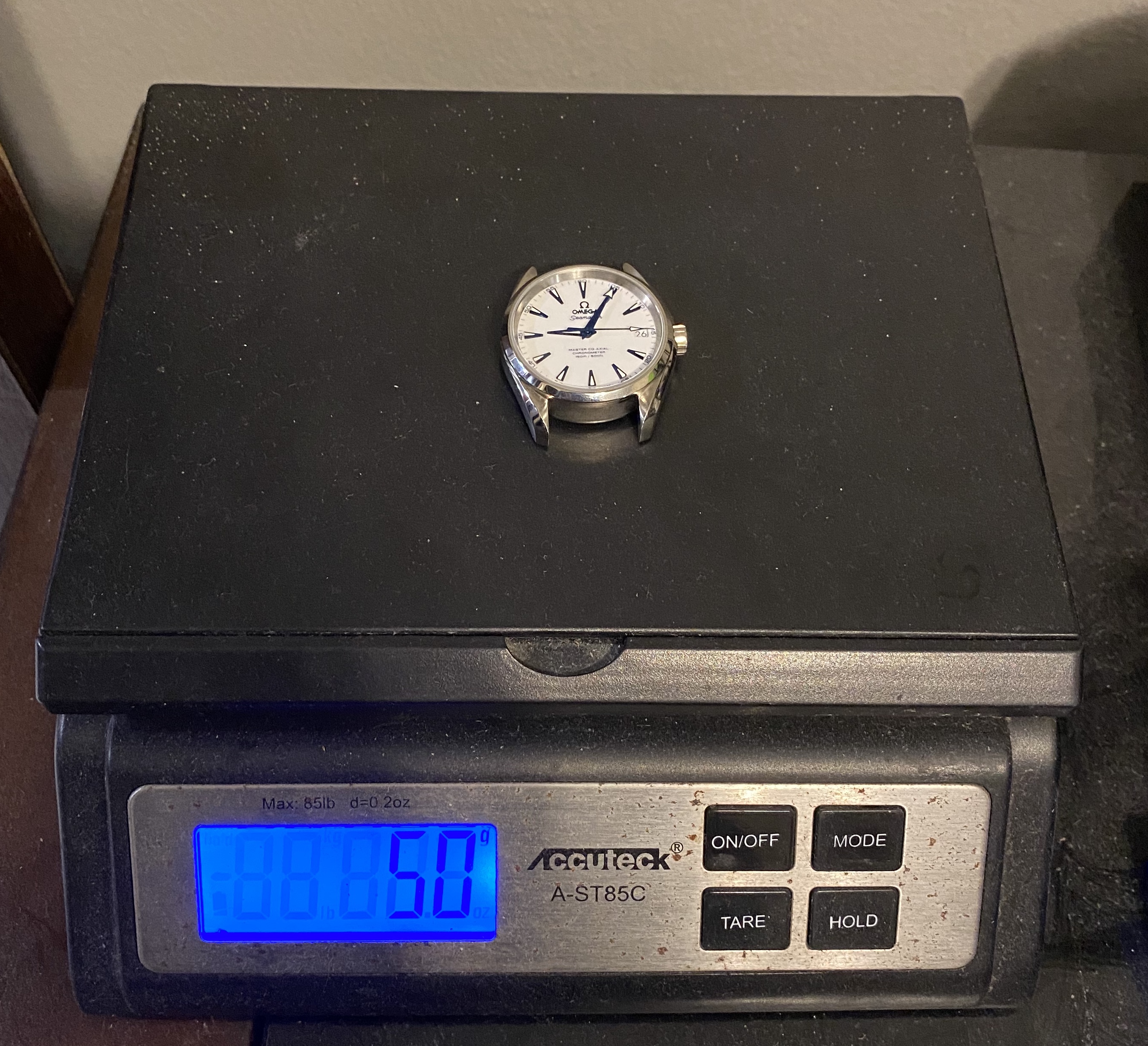 I weighted the watch today: On bracelet (full band minus 2 half links) is 94 grams; weighing them separately the head weight is 50 grams and the band is 44 grams.