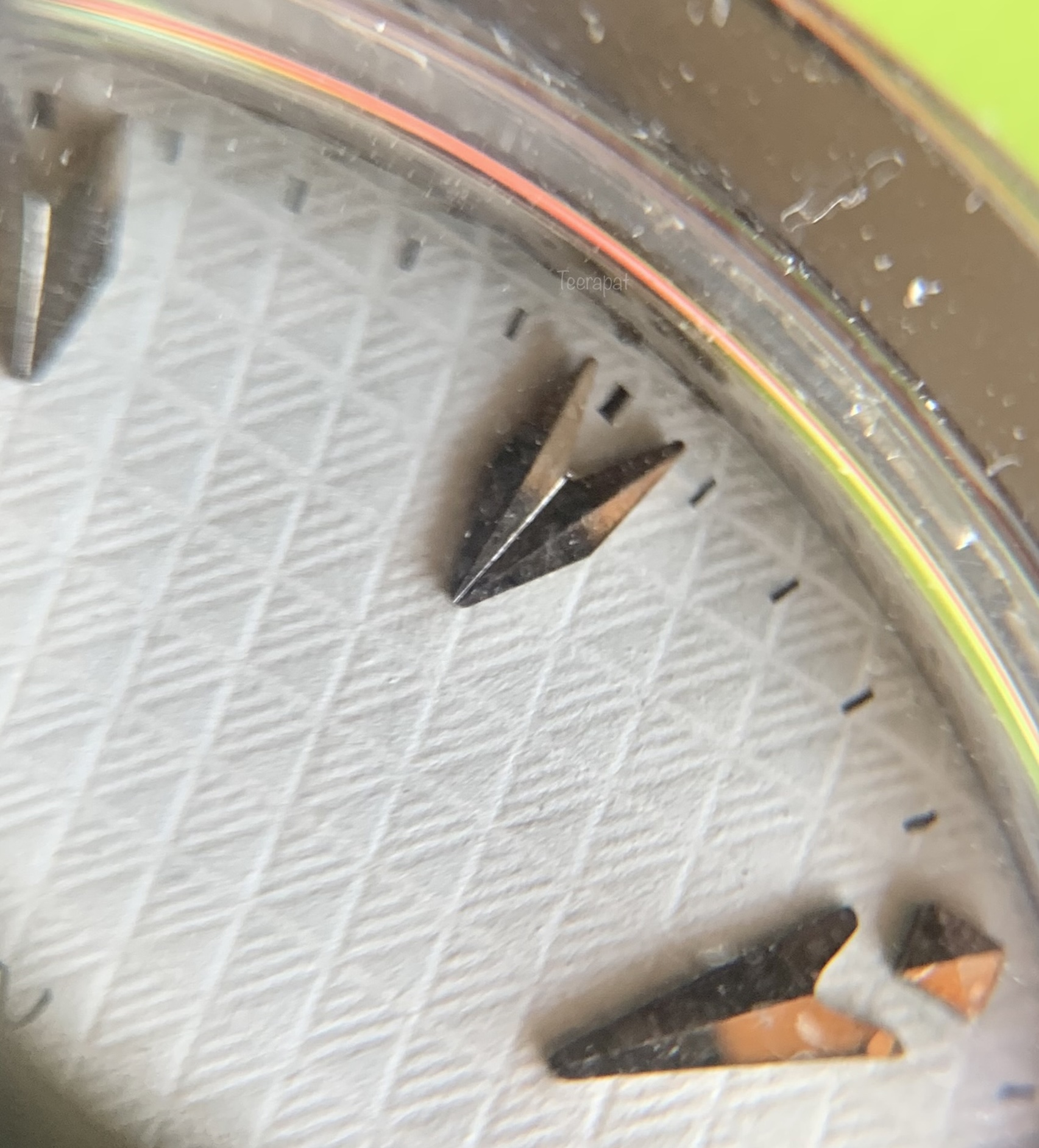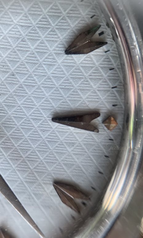 From my research, I’ve never seen combination of these dial pattern and hour-markers together. Also, the first one of ref.2576 using this “rhombus dial”. Moreover, most of ref.2576 will come with luminous hands and markers. I noticed that the horizontal parallel straight lines in each rhombus are very difficult to capture, especially in the white dial.