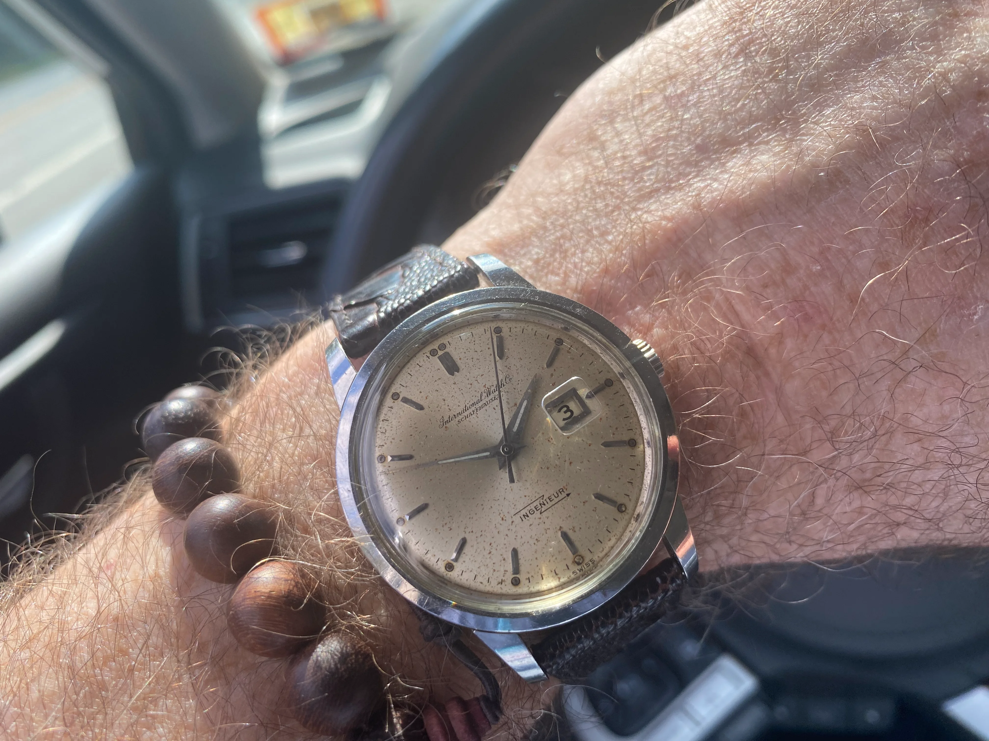 Dial: Very pleasing "iron freckle" patination. Lume plots partially intact and oxidized. Oxidation seen under loupe and not with naked eye.