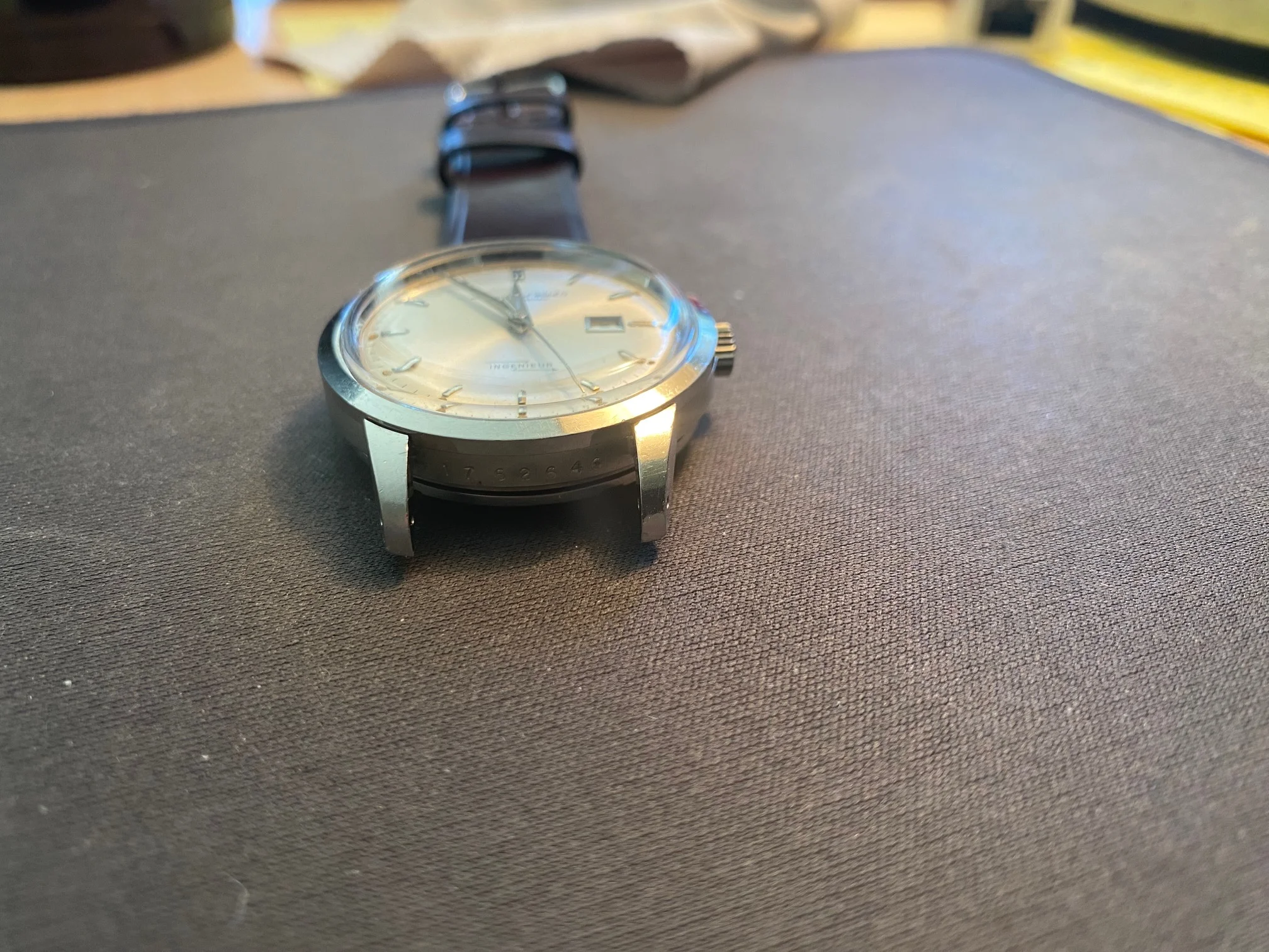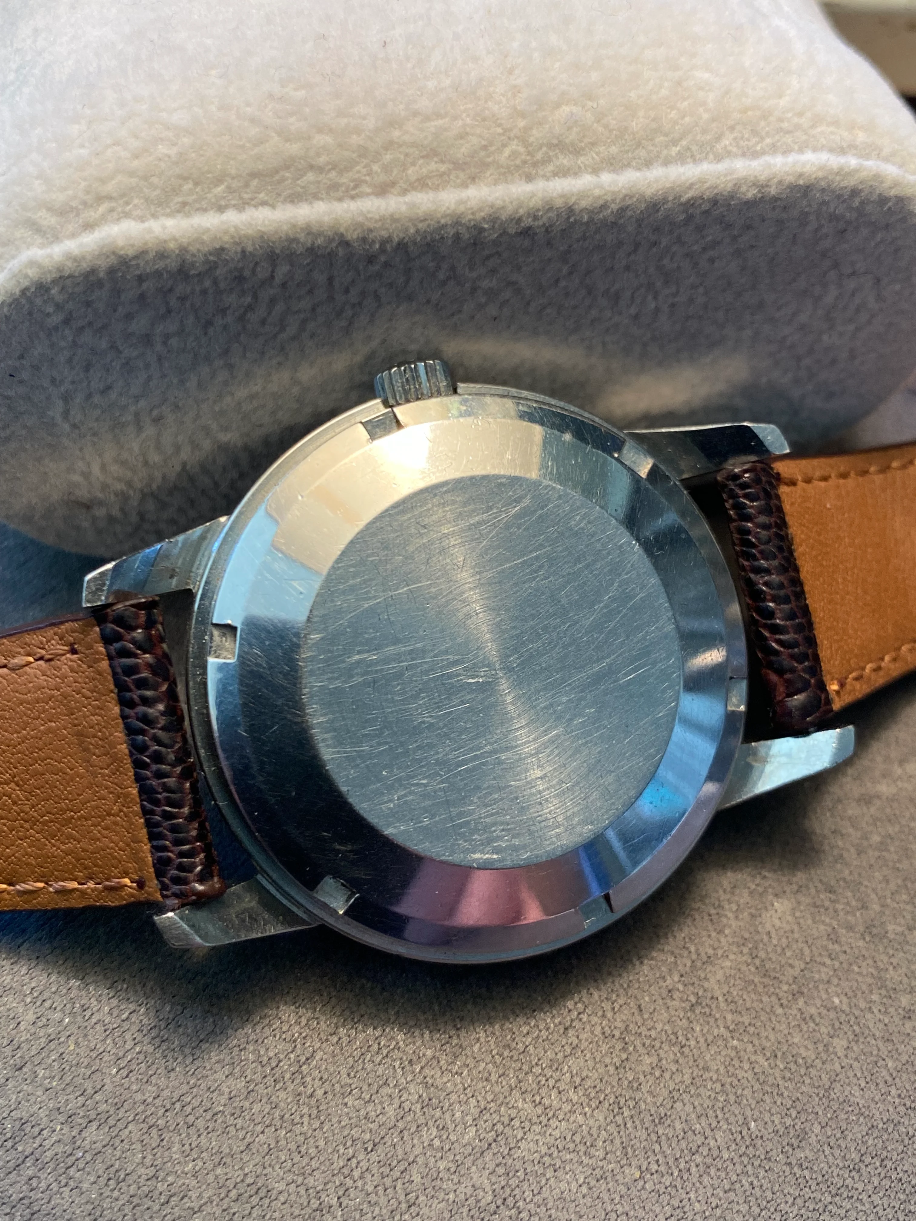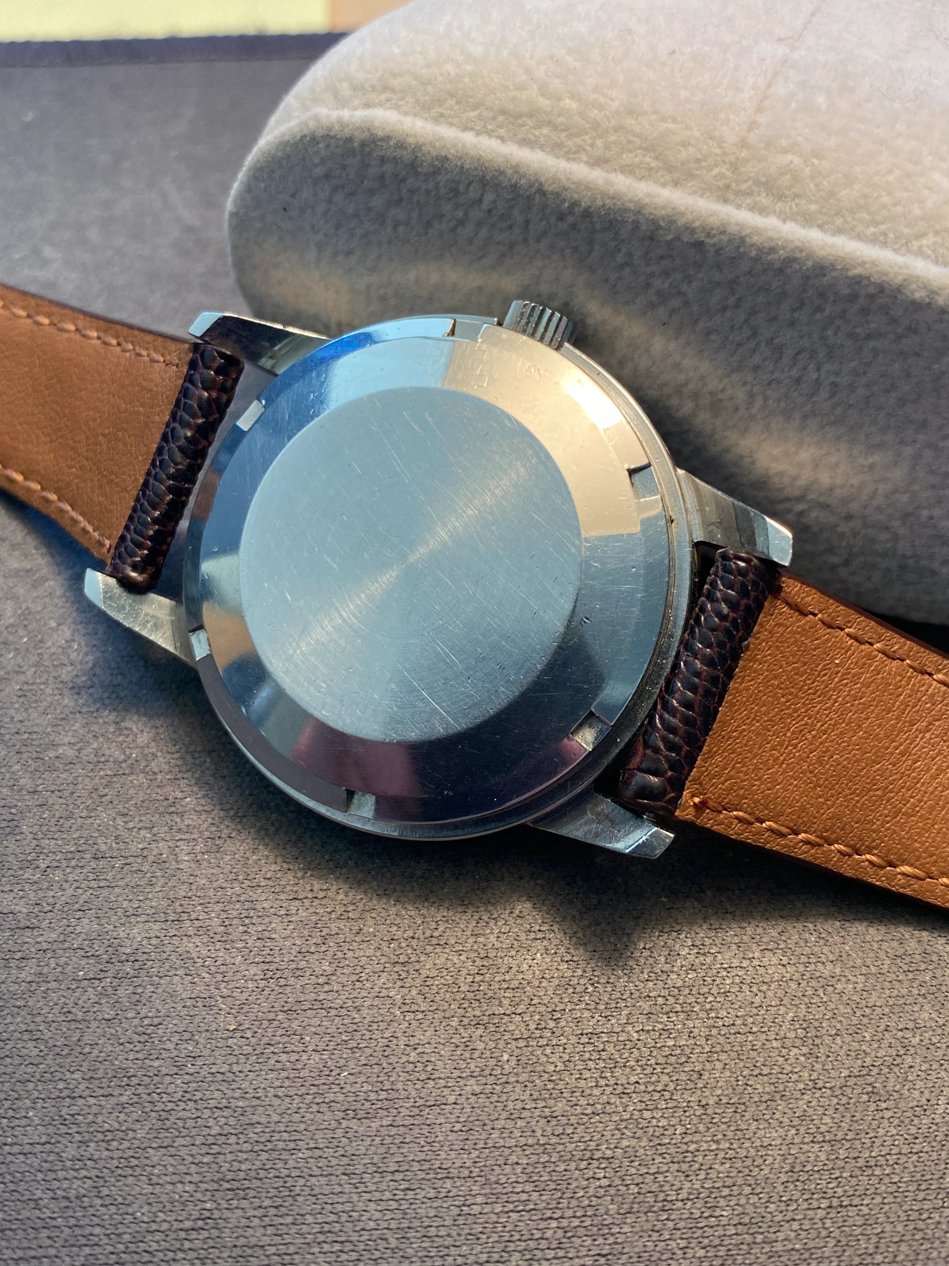Movement: very clean looking 8531, keeping reasonably good time, though I have not timed it for accuracy. Date snaps over smartly at 12:00. Would definitely have it serviced for regular wear. Soft iron cover snaps easily onto movement ring and remains snug.