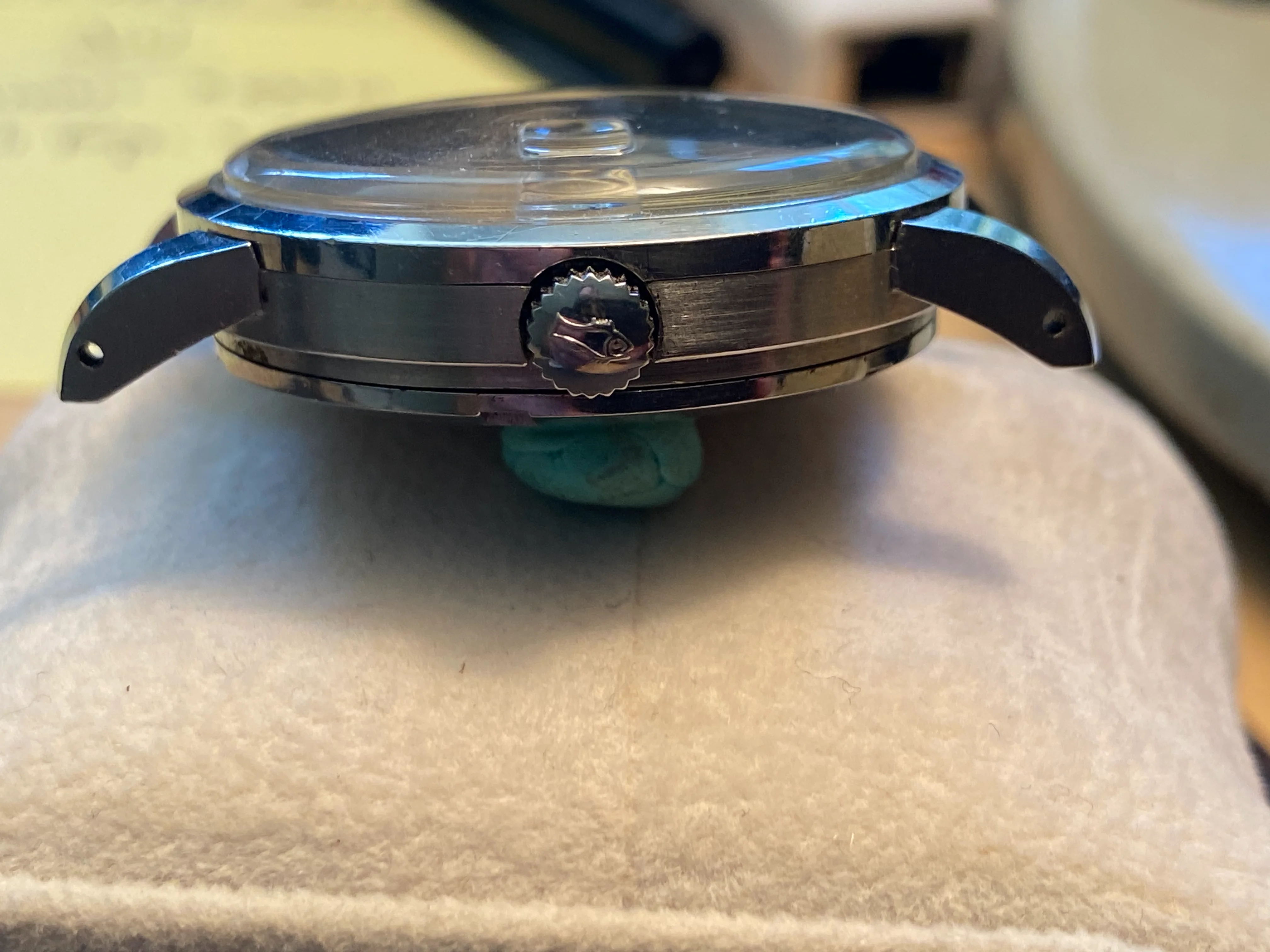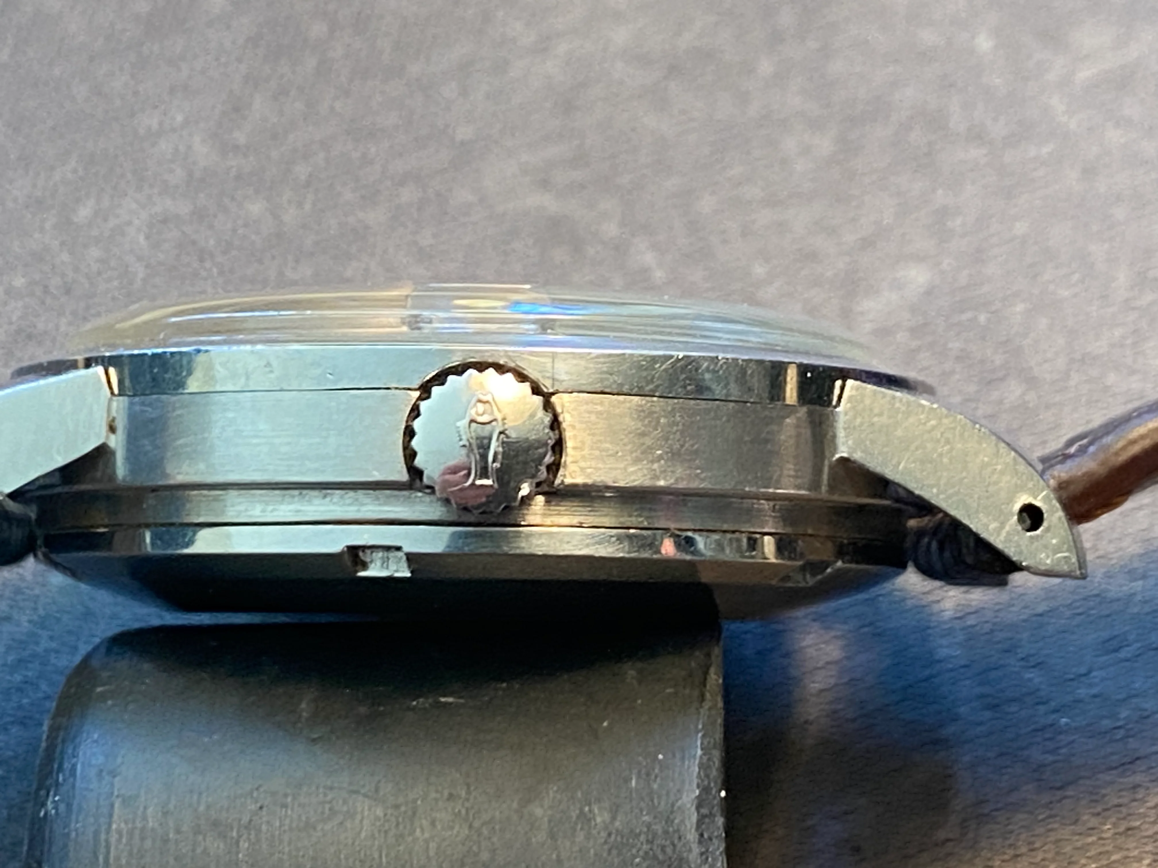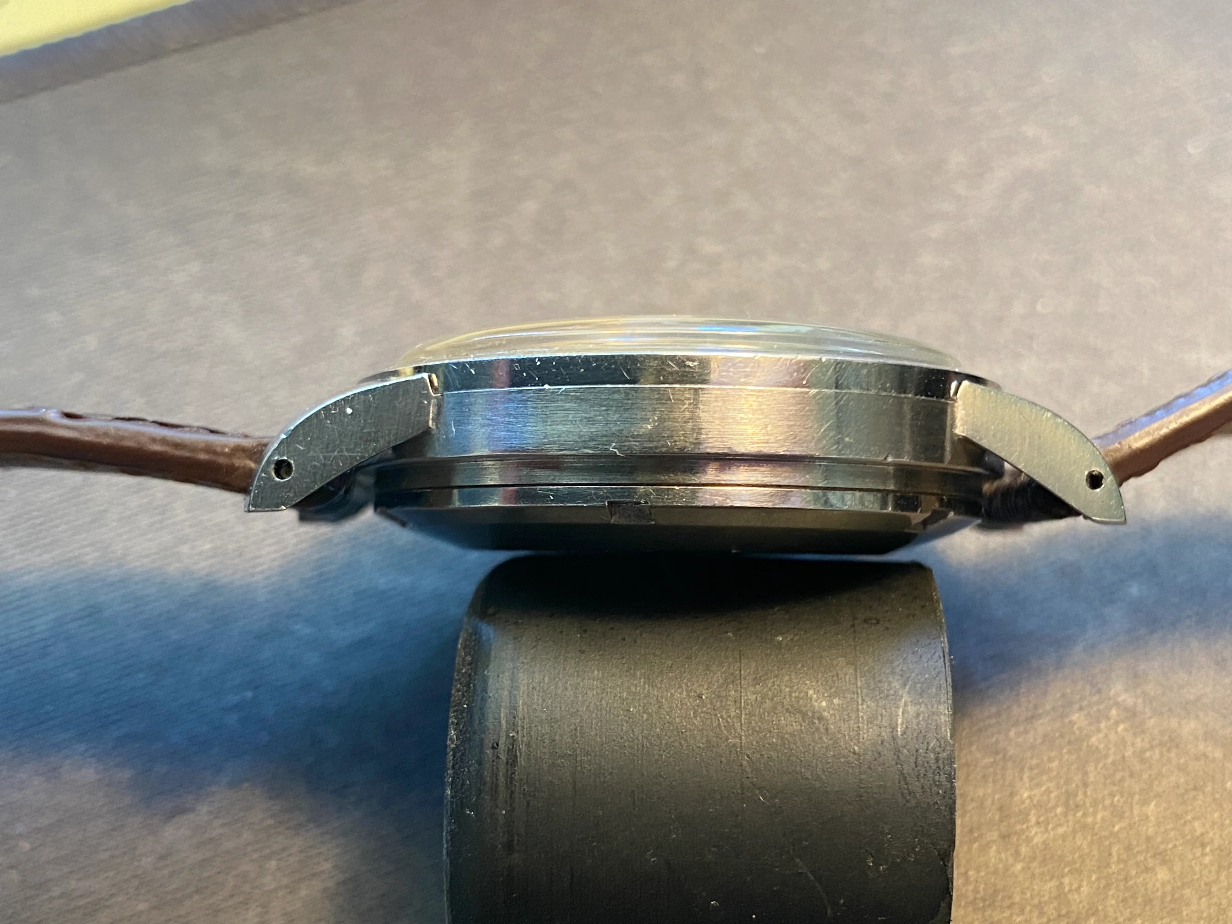 Case: I think it's been re-brushed, perhaps very lightly polished. But I really cannot see any difference in lug thickness or contour when compared to an unpolished example I used for comparison. Lugs are fat, sharp and look good. Mid-case has probably been rebrushed, but I see no evidence of it being polished as the contours are also very full and sharp. Bezel and case back appear untouched. On the case back, the oblique angle just above the wrench slots is sharp; and this is an angle which is almost always obliterated when polished.