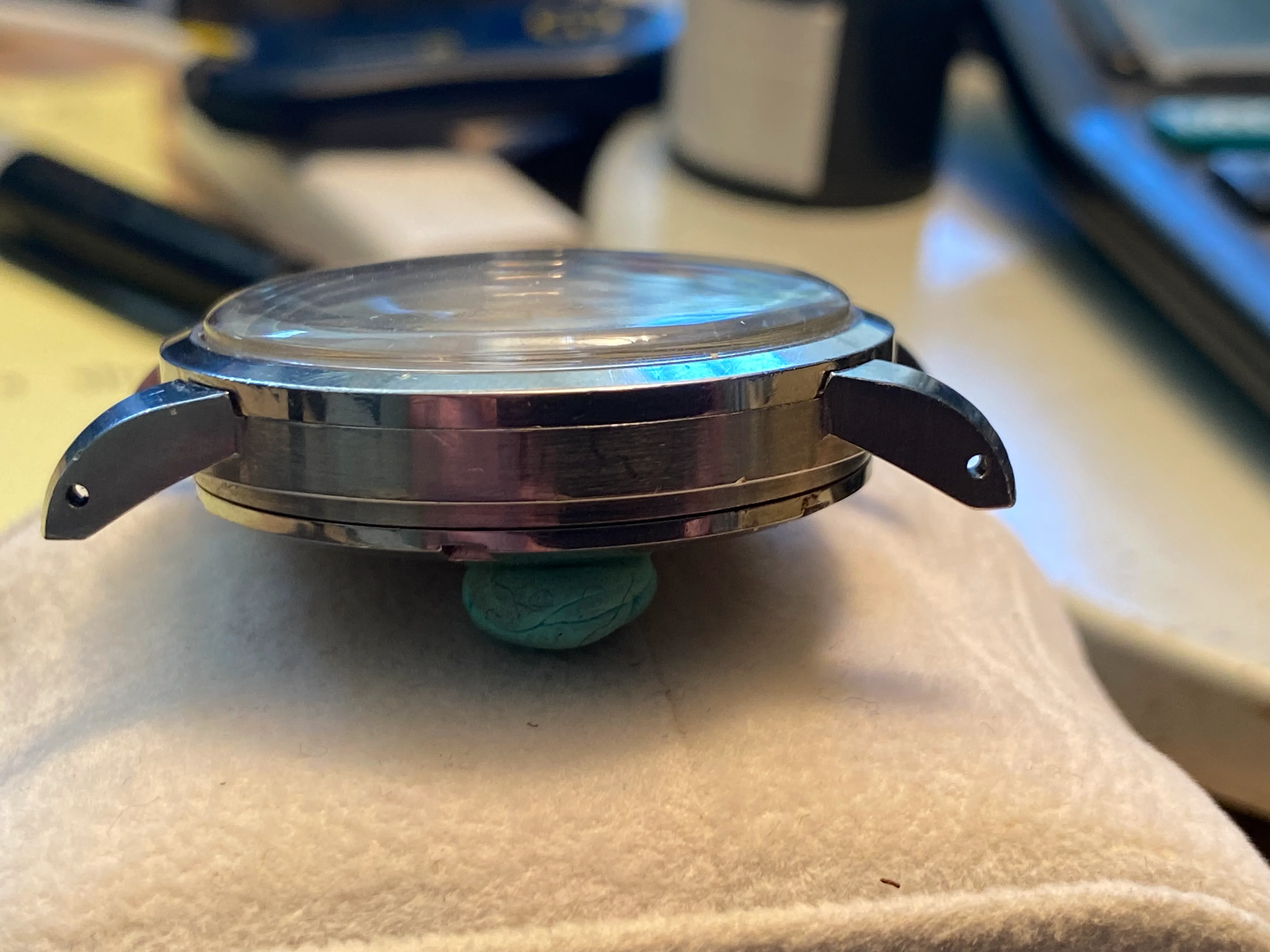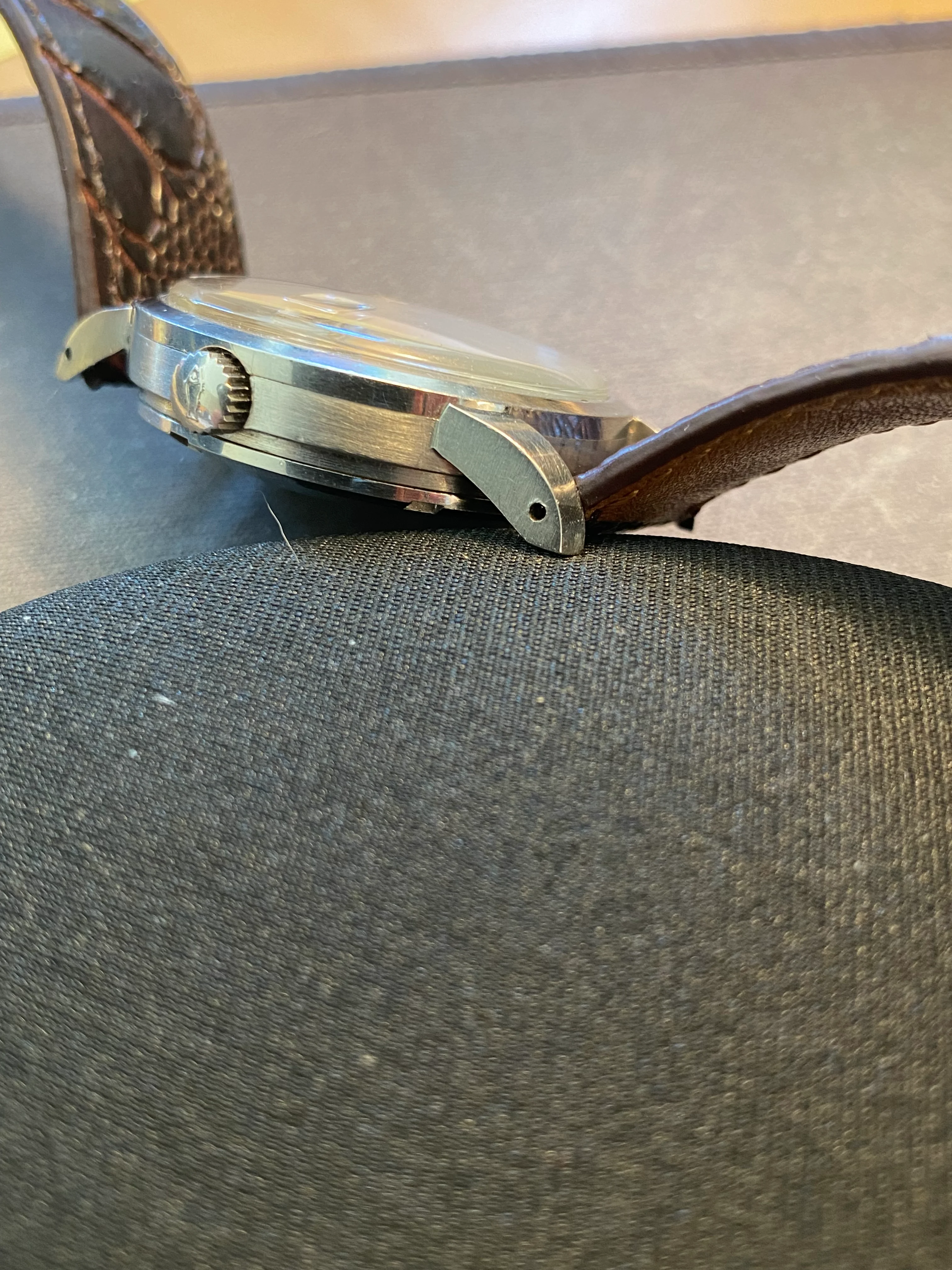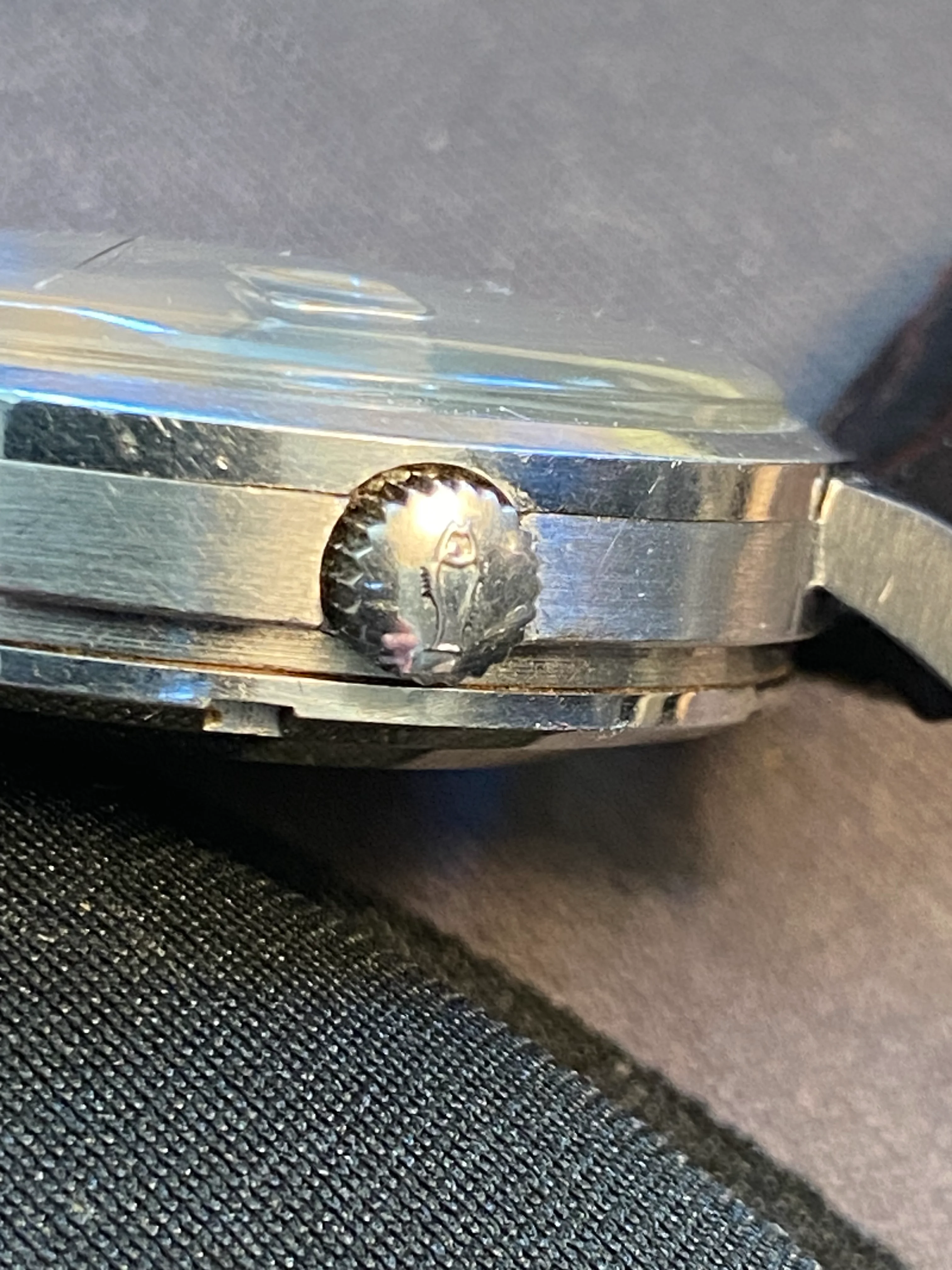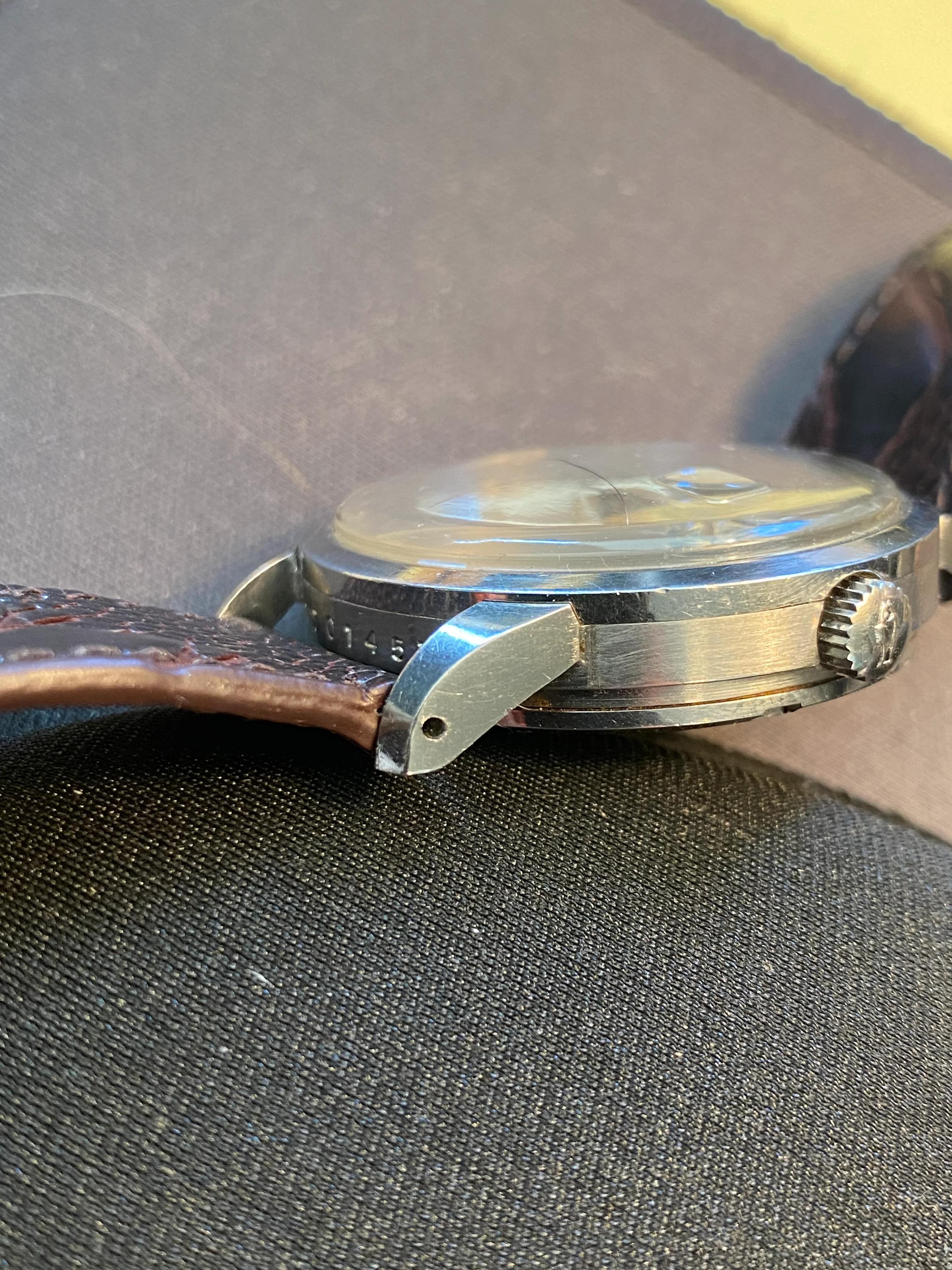 Case: I think it's been re-brushed, perhaps very lightly polished. But I really cannot see any difference in lug thickness or contour when compared to an unpolished example I used for comparison. Lugs are fat, sharp and look good. Mid-case has probably been rebrushed, but I see no evidence of it being polished as the contours are also very full and sharp. Bezel and case back appear untouched. On the case back, the oblique angle just above the wrench slots is sharp; and this is an angle which is almost always obliterated when polished.