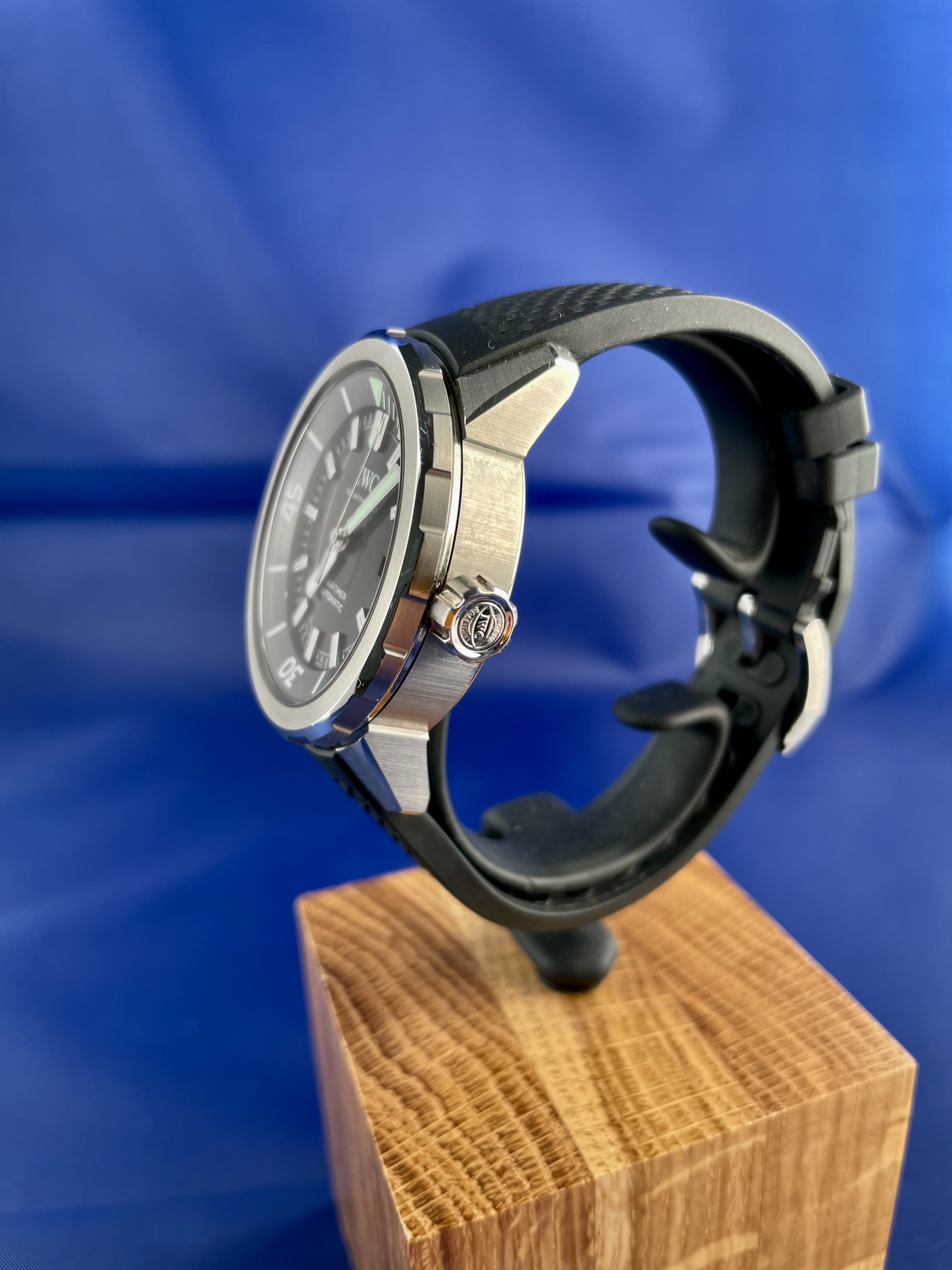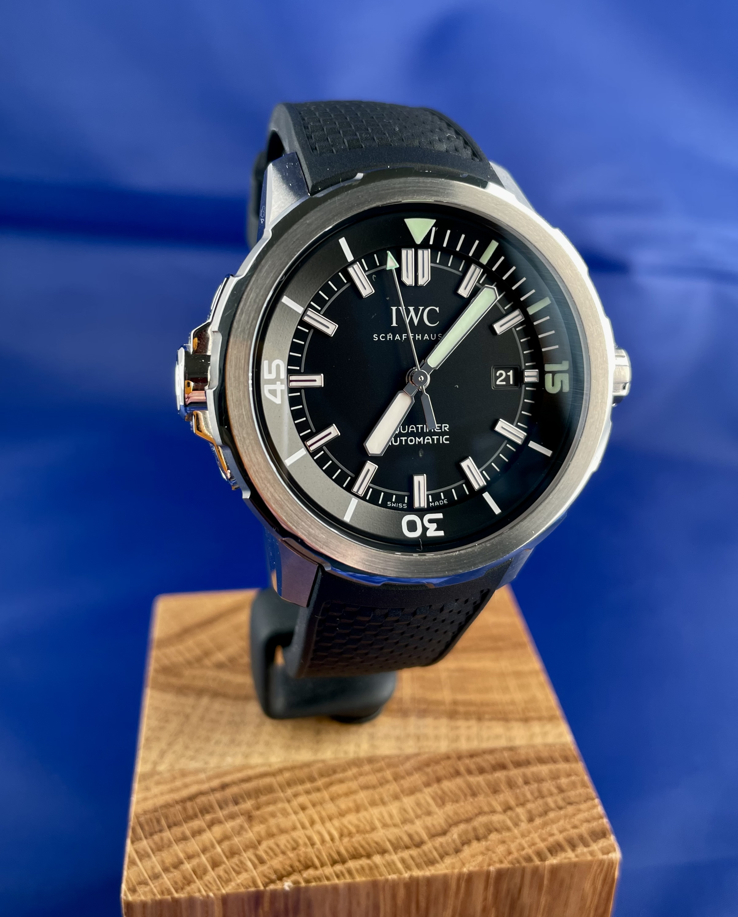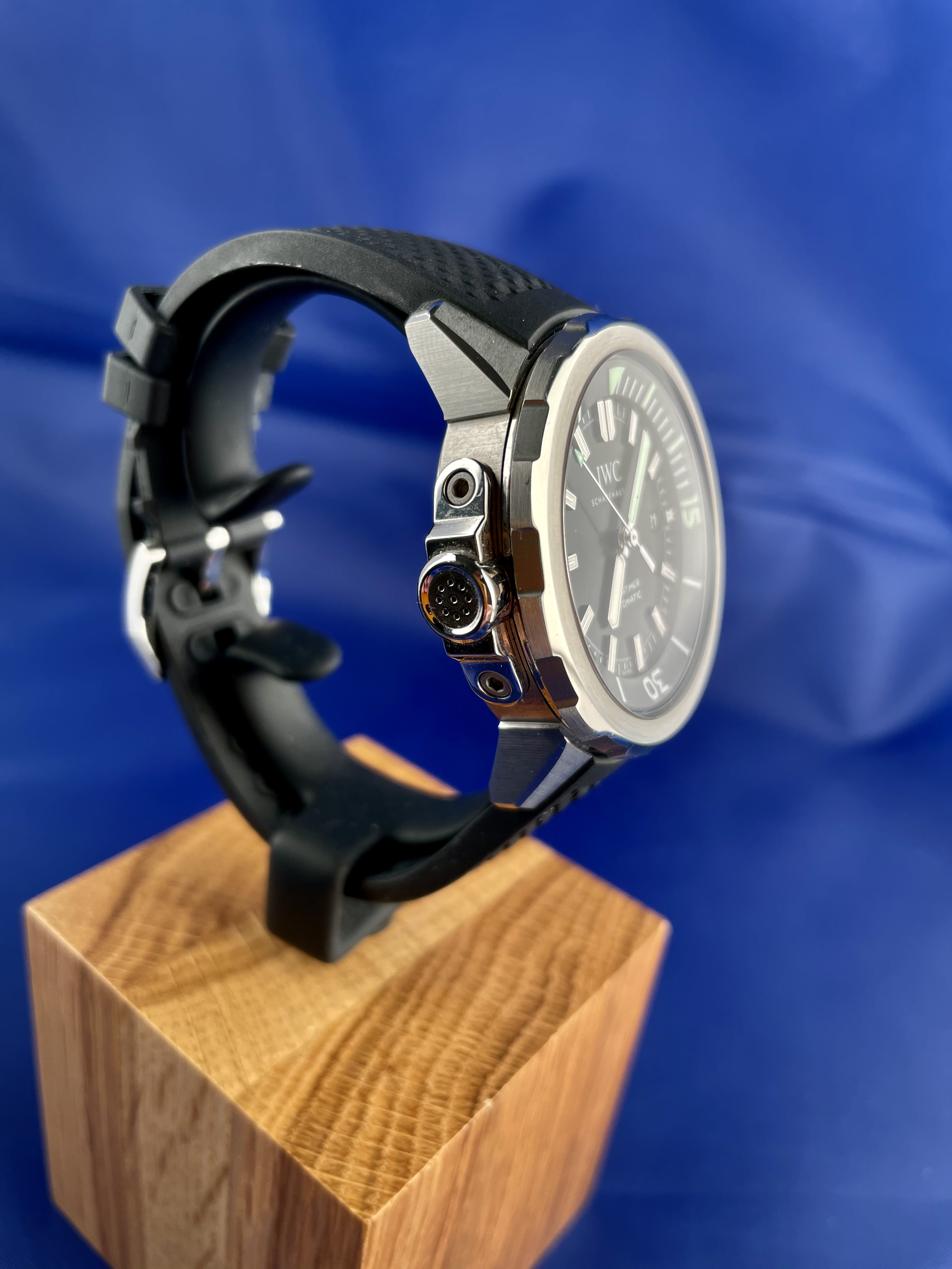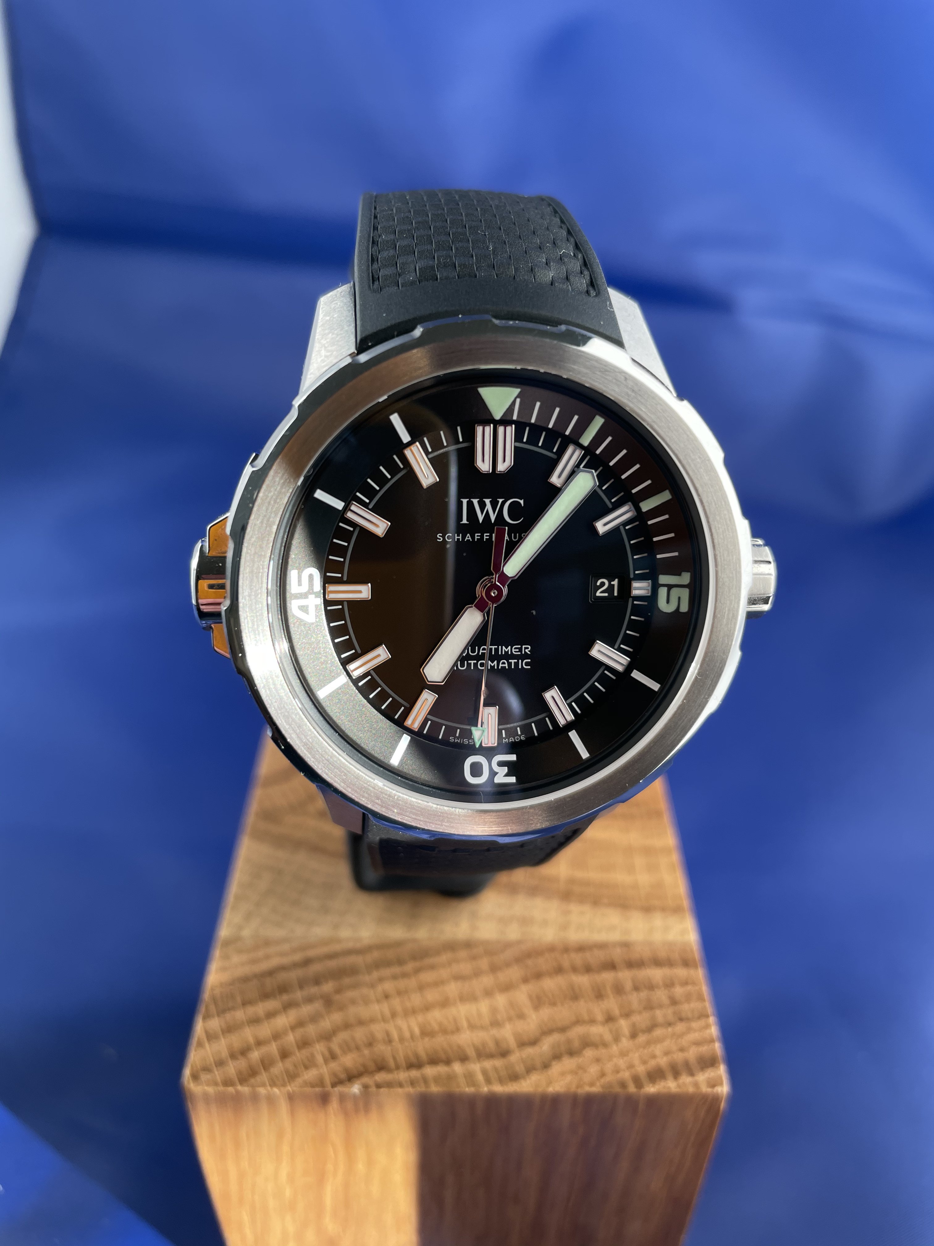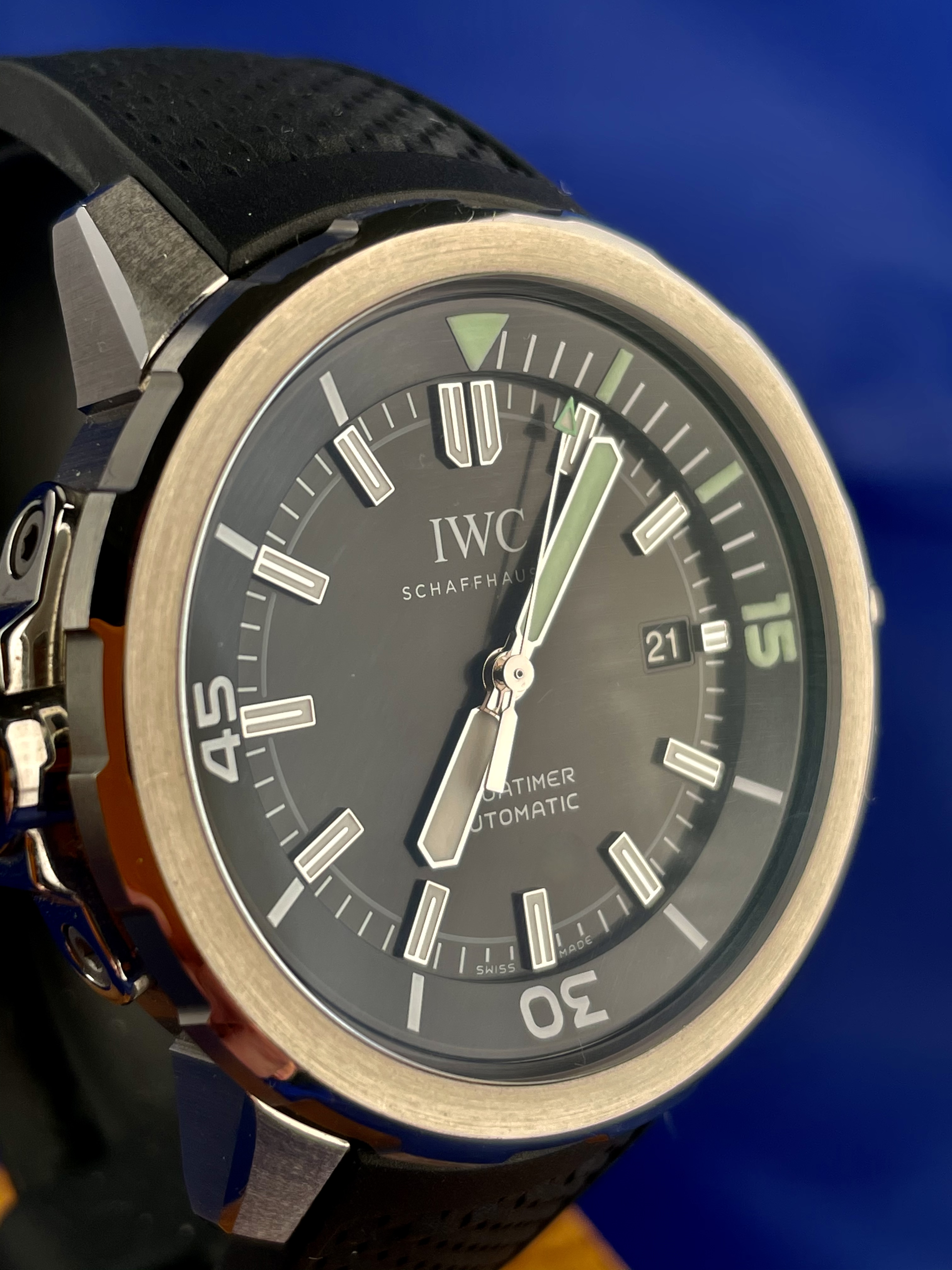With its simple dial design and the quarter-hour scale on the internal rotating bezel, the smallest model in the diver’s watch family references the first Aquatimer released in 1967. The slim, chamfered shape of the external bezel with its gently rounded and recessed grips, on the other hand, was inspired by the legendary Porsche design of the Ocean 2000 of 1982. The dive-related displays are coated with luminescent green Super-LumiNova®*. The external/internal rotating bezel with the IWC SafeDive system combines ease of use with safety. The rotation of the external bezel is transmitted via a sliding clutch system to the internal rotating bezel with a triangular index and dive time scale. Pressure-resistance to 30 bar makes the watch suitable for deep dives. With the new IWC bracelet quick-change system, swapping the stainless-steel bracelet for the rubber strap, and vice versa, is a snap. *IWC Schaffhausen is not the owner of the Super-LumiNova® trademark.