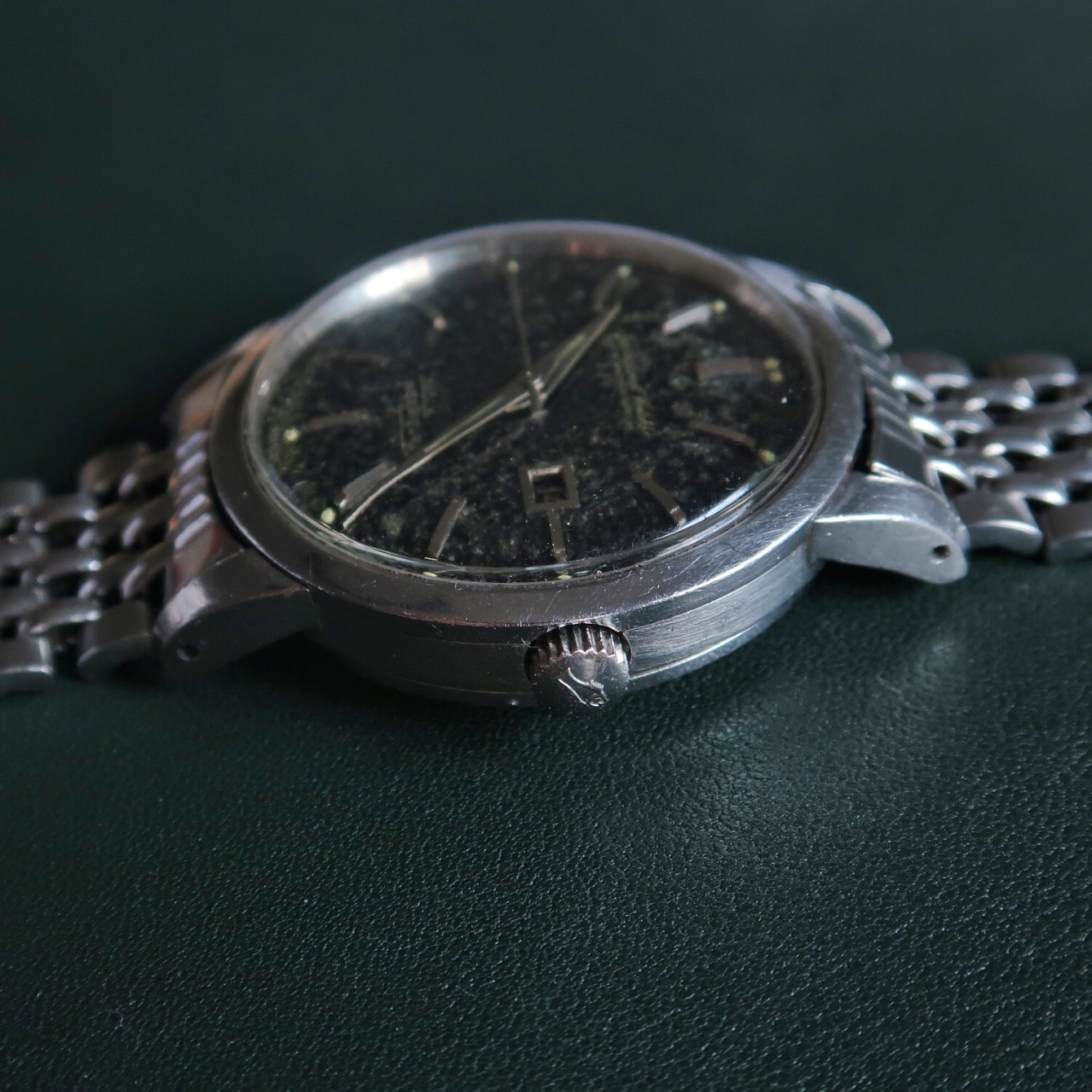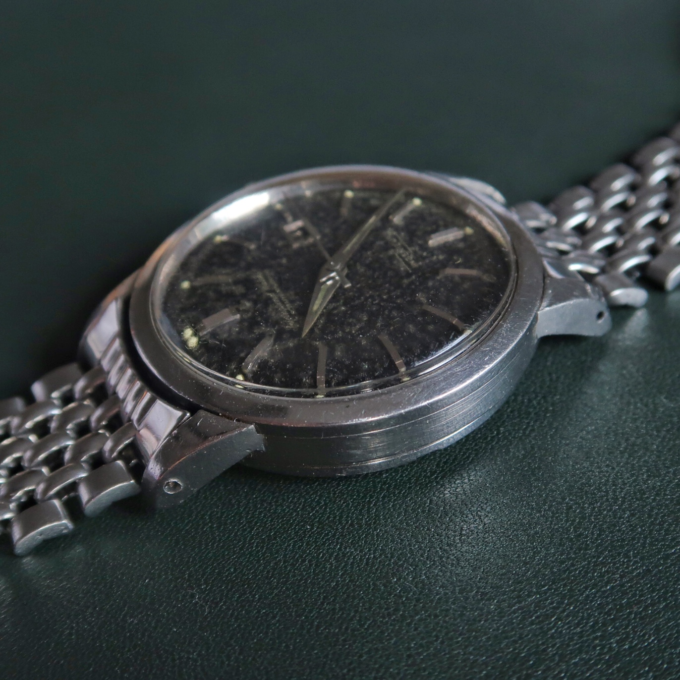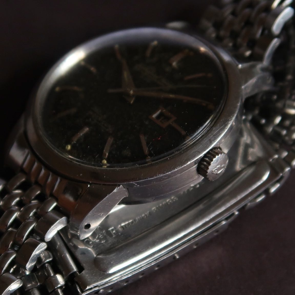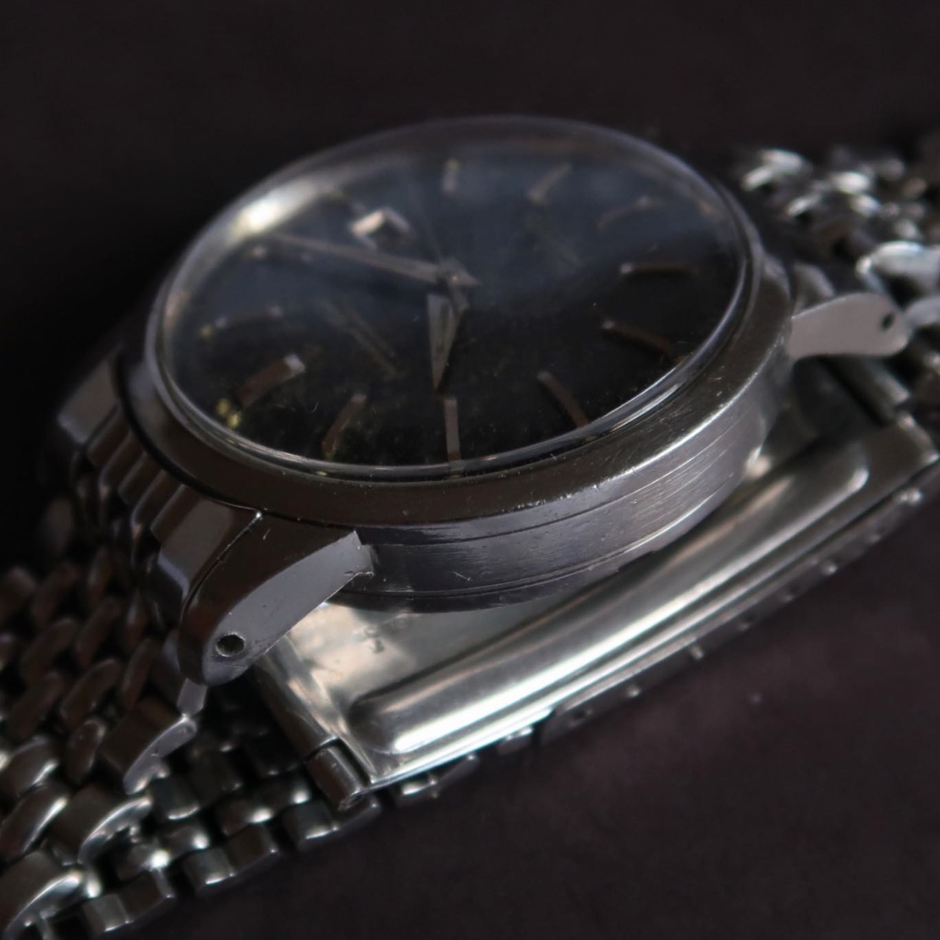 Dial/Hands: Original black gilt dial that is heavily oxidized on the lacquer level, gilt print is clear. Missing tritium lume plot at 7 o’clock. Hands are original with some oxidation.