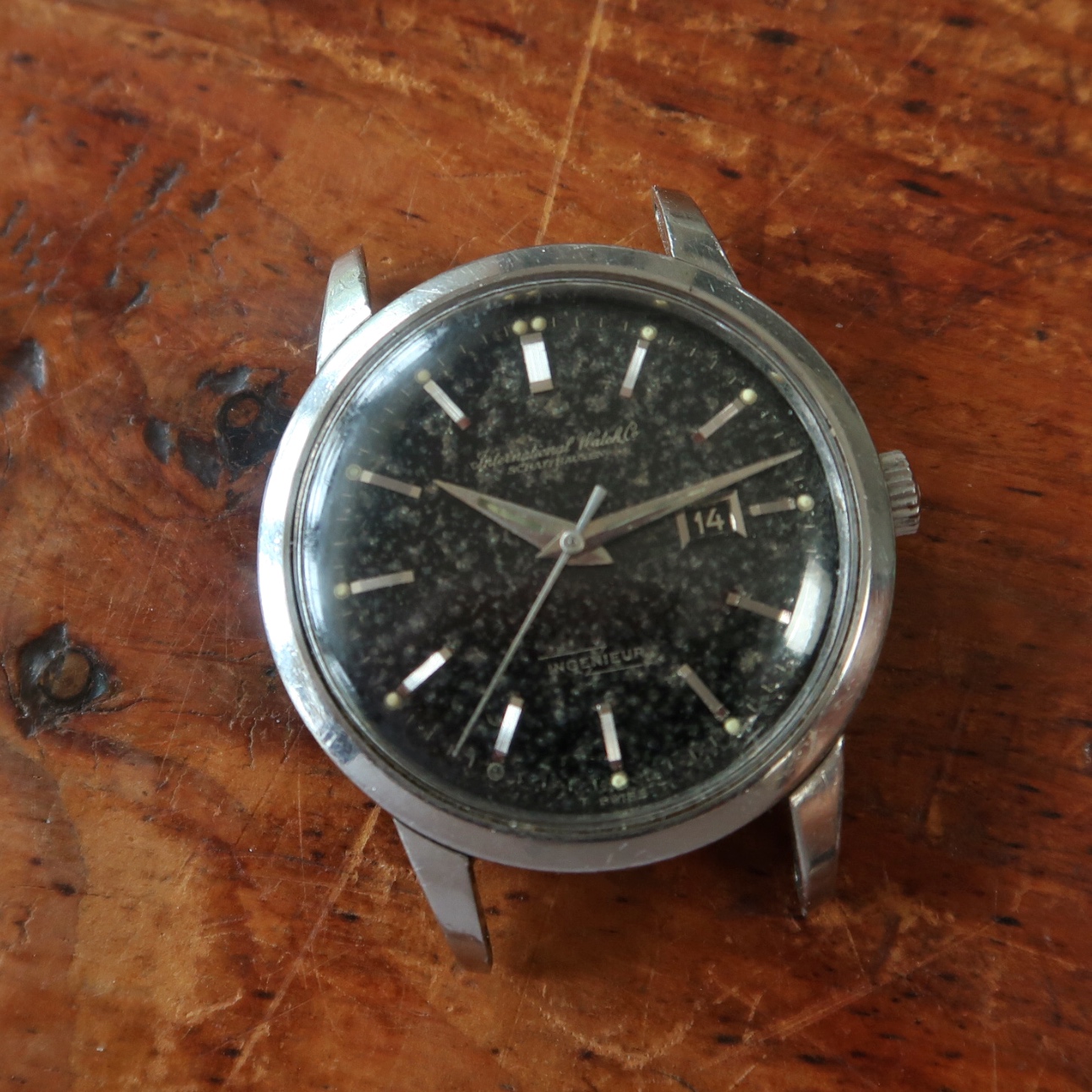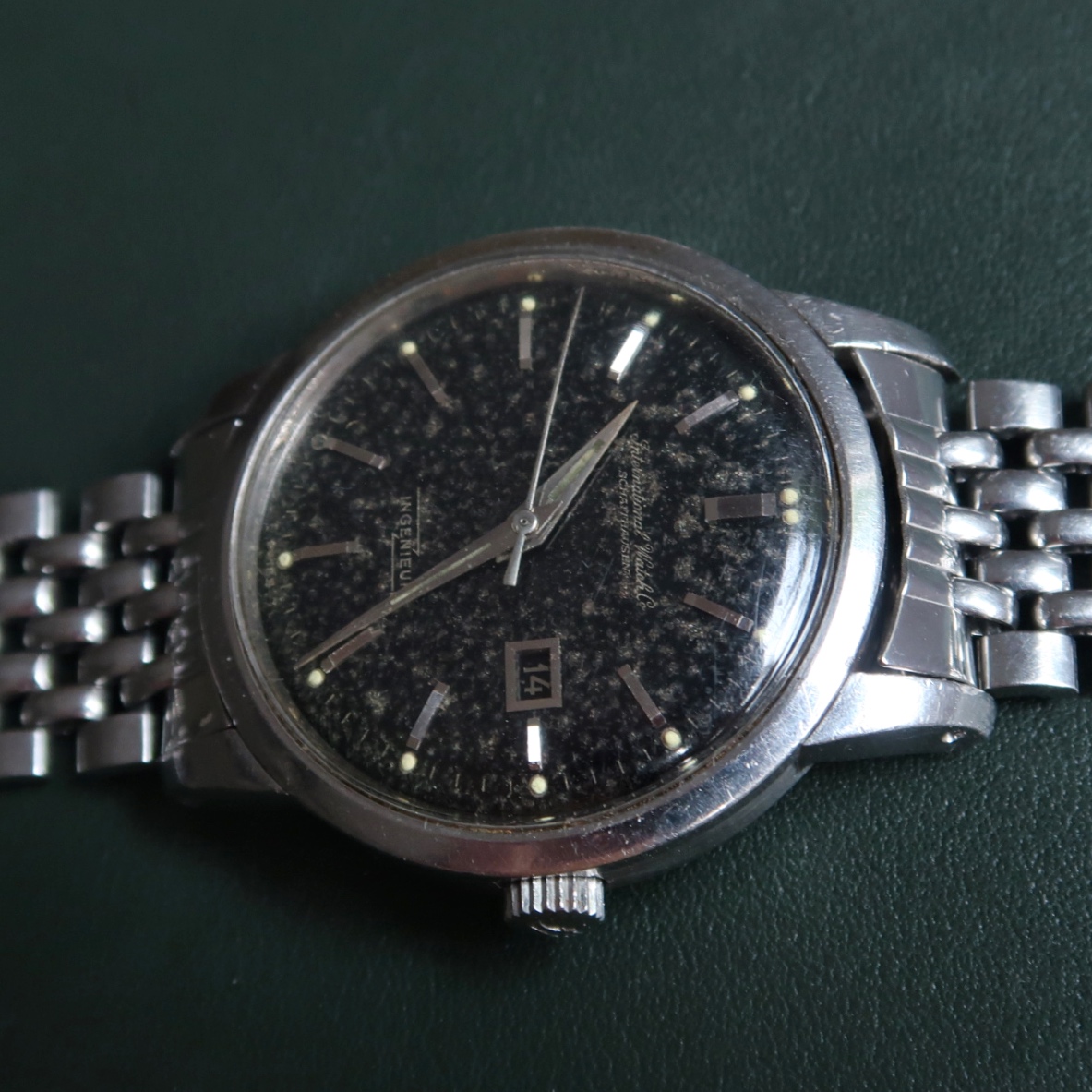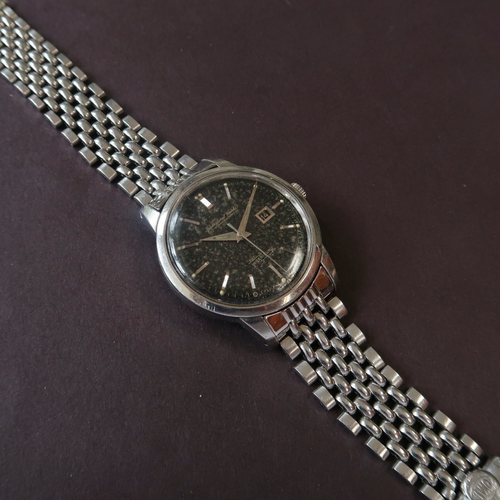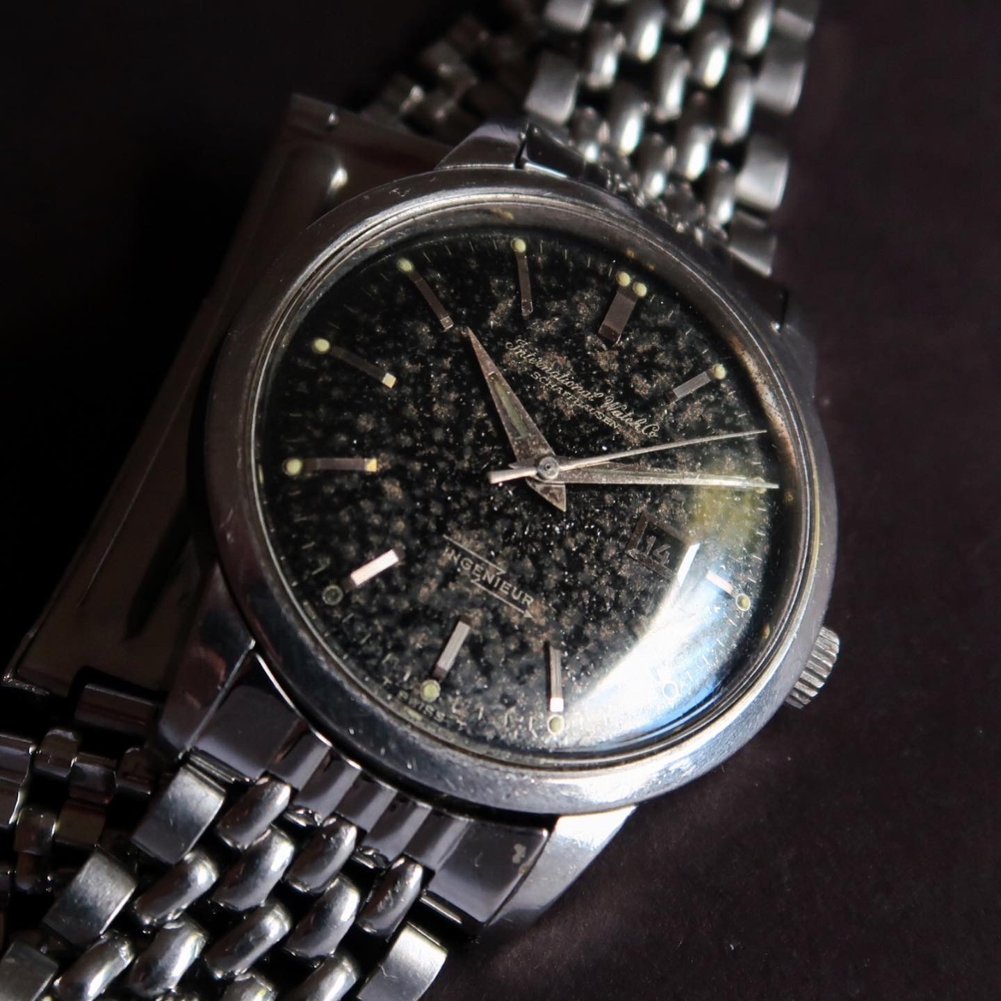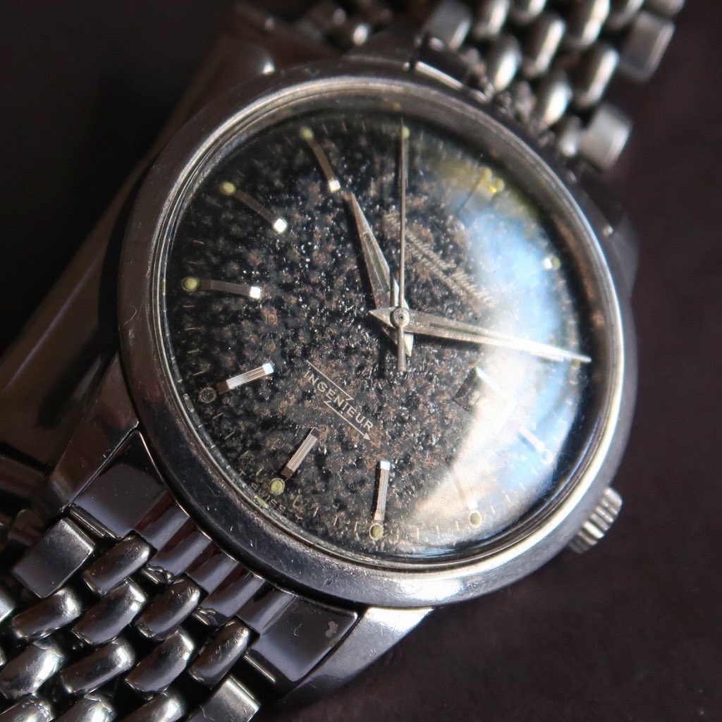 ·Another uncommon piece up for grabs. IWC Ingenieur 666AD from around 1963 with the black gilt dial that’s oxidized heavily to resemble granite, sharp case, and original Gay Freres beads of rice bracelet.