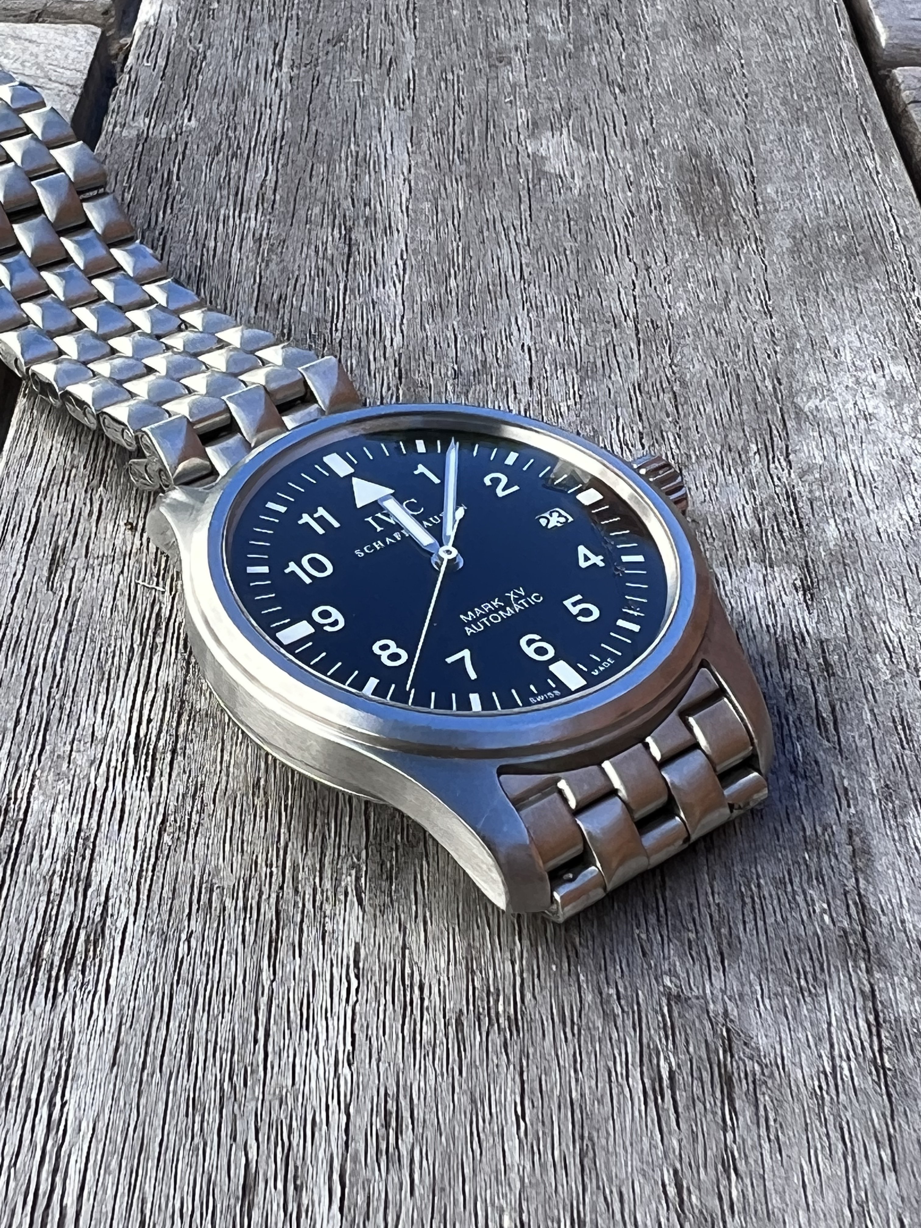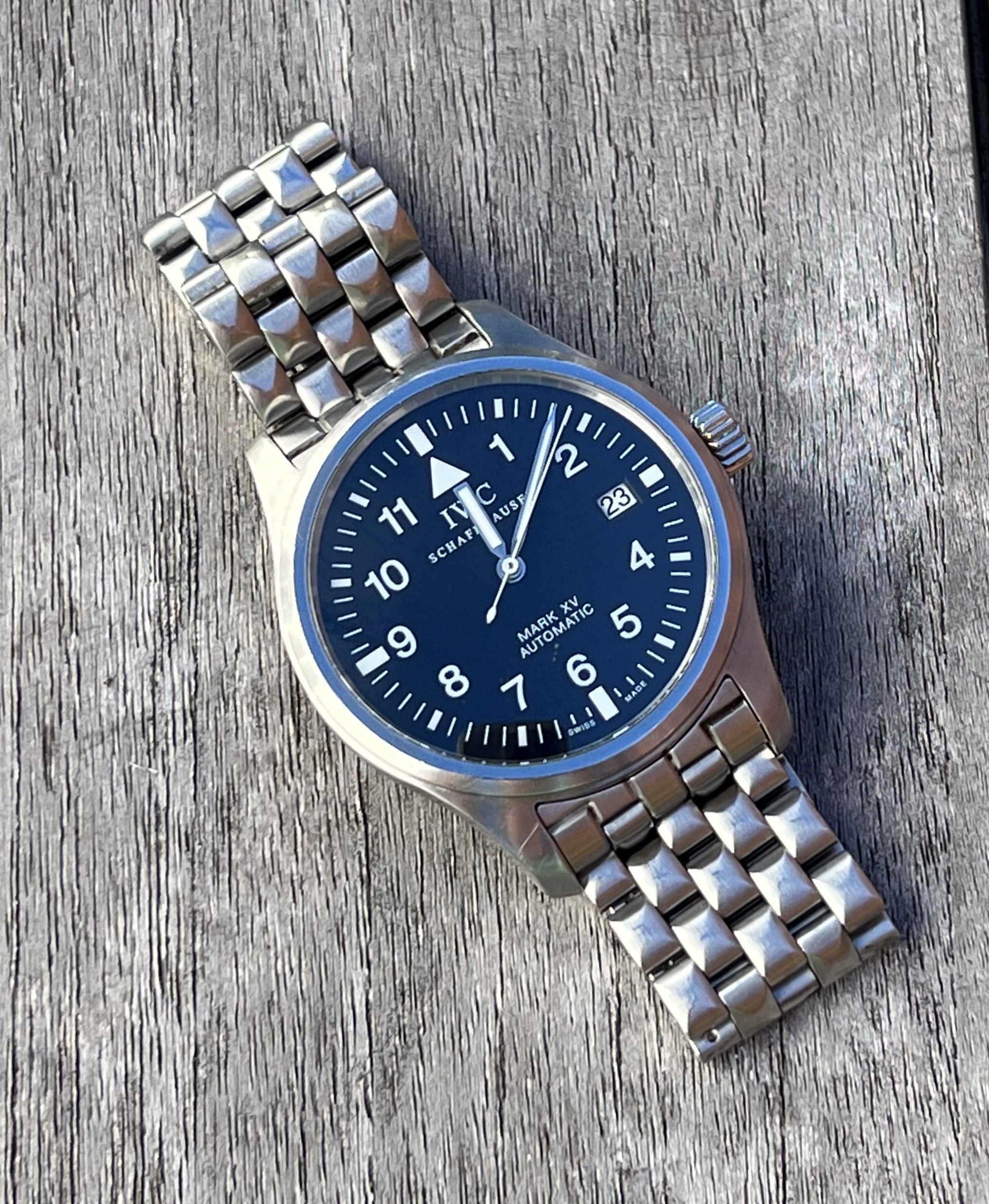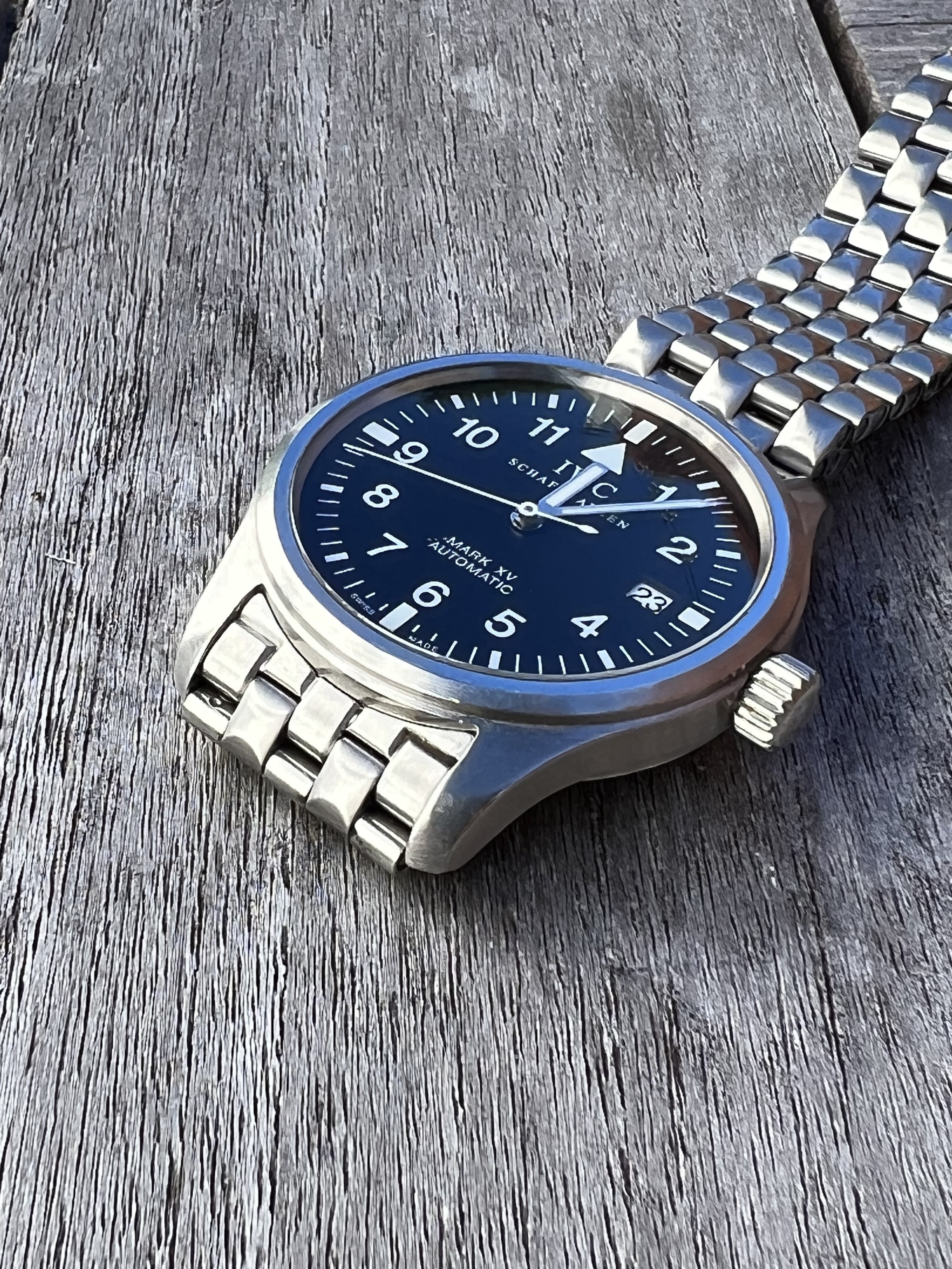 ·IWC Mark XV with bracelet, extra links, inner/outer boxes, booklets, card in previously enjoyed condition.
