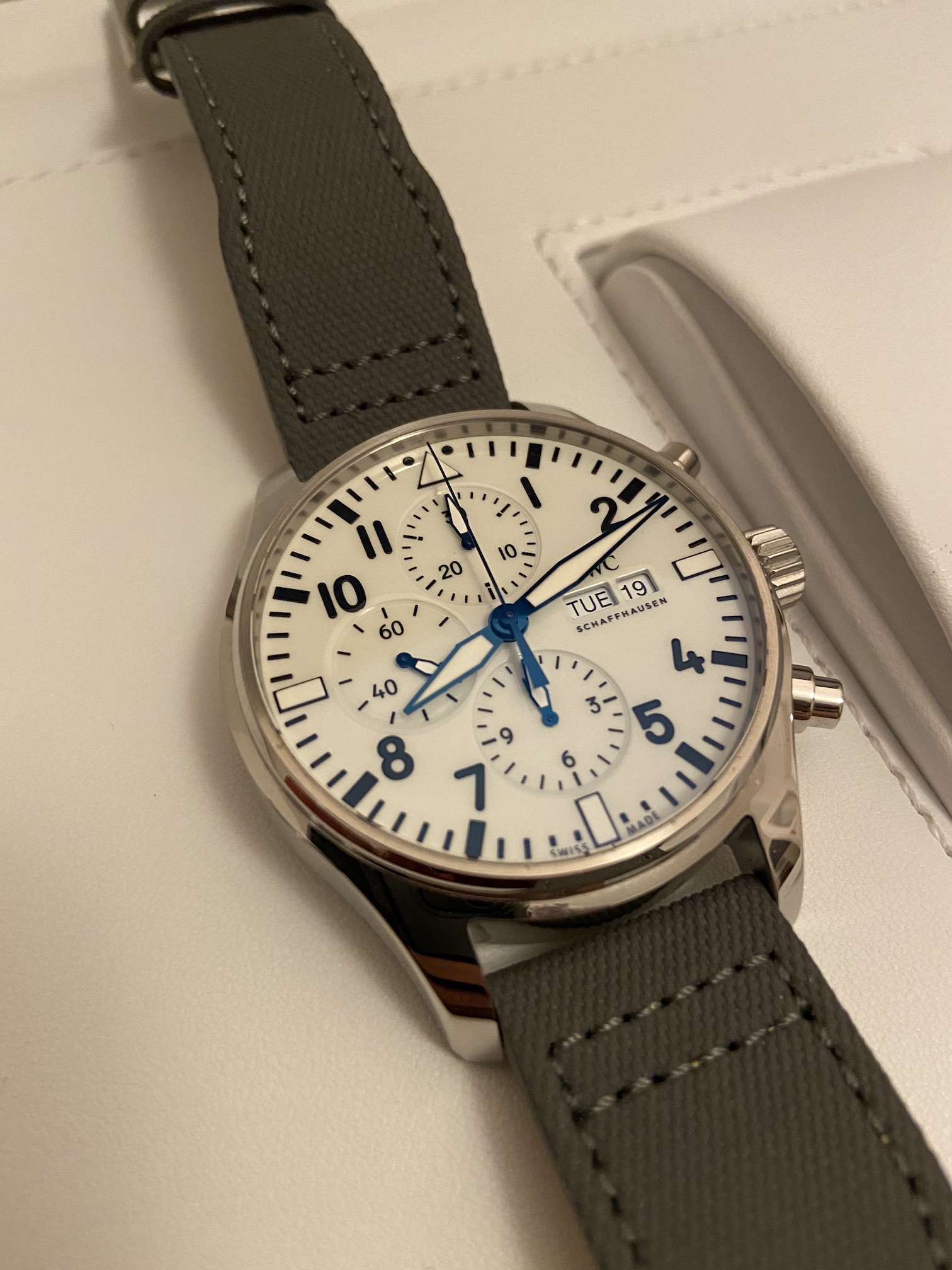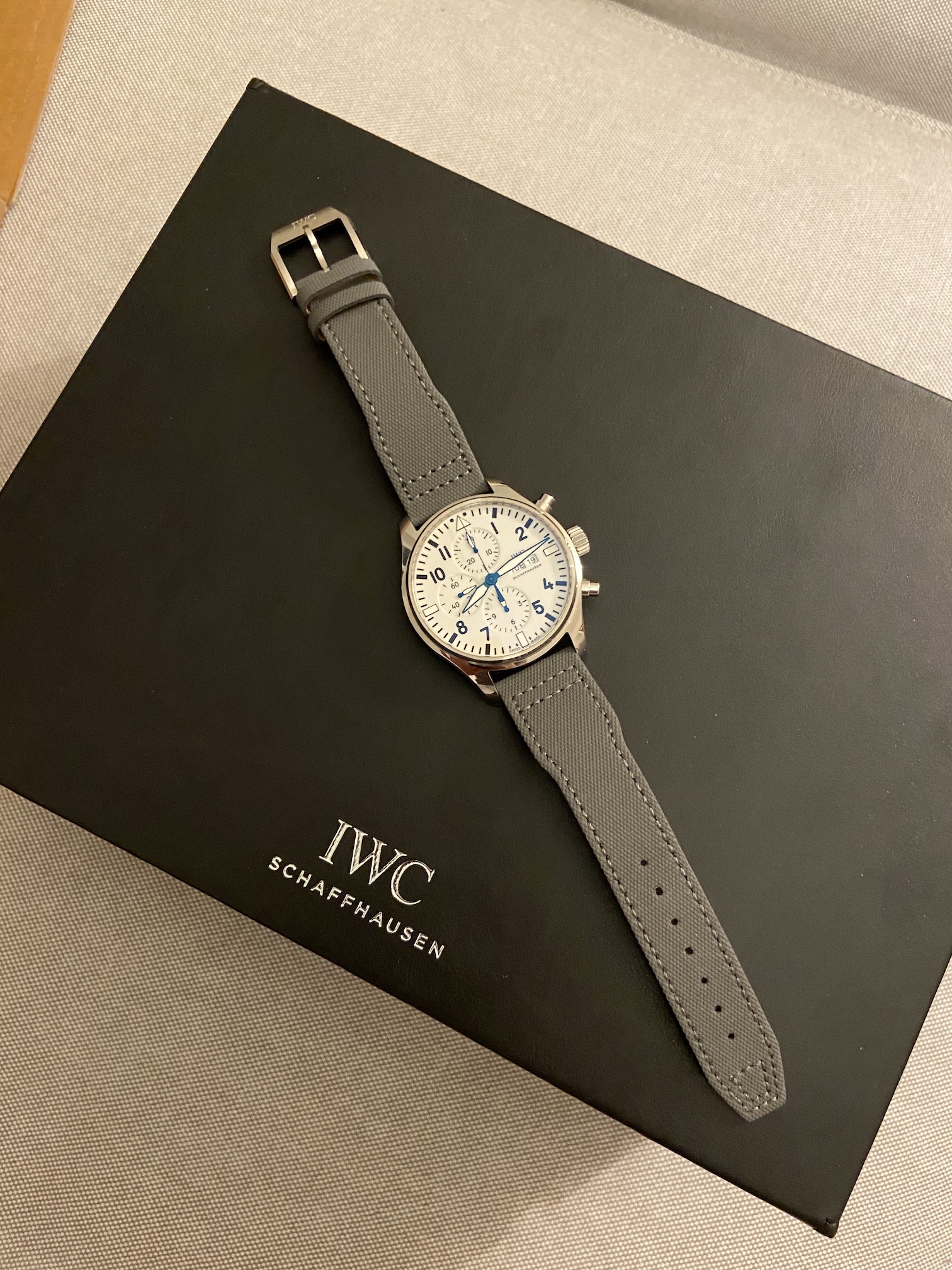 The watch is currently installed with a grey cordura pilot's watch strap from B&R bands.