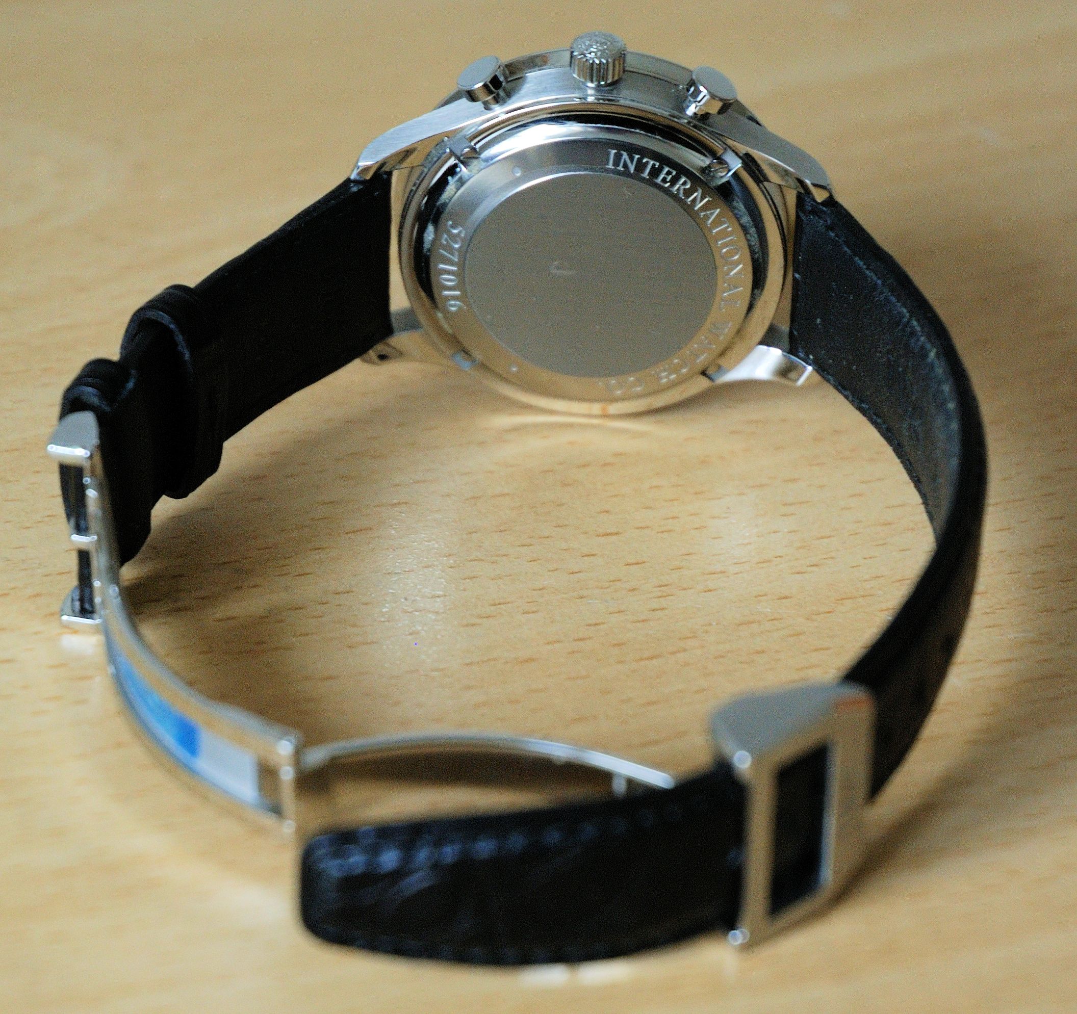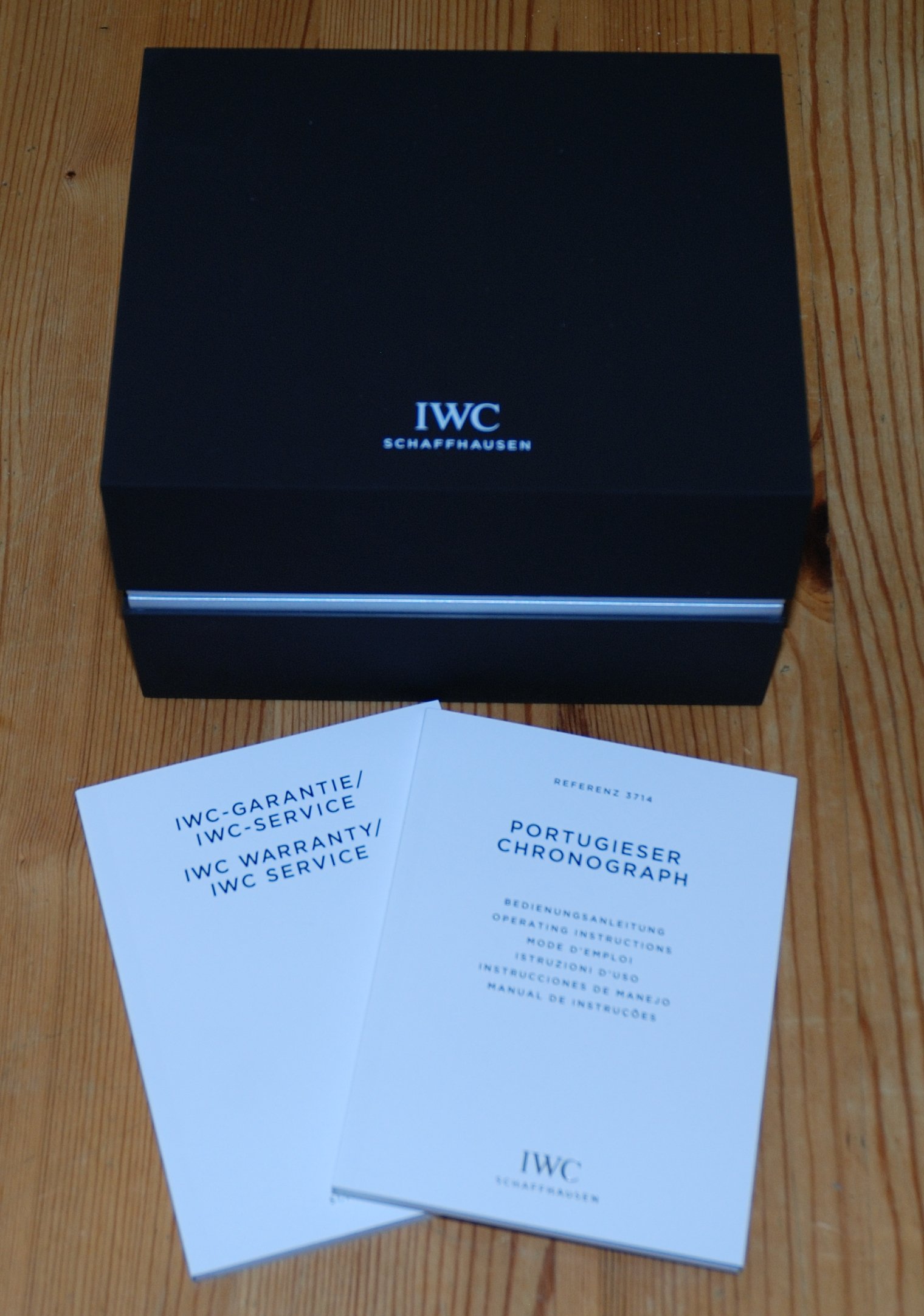 ·IWC Portuguese Chronograph, model #IWI371447, black dial, in excellent + condition, with all original papers and packaging. Watch is on original black strap. Bought new by me in 2015 and worn only very occasionally.