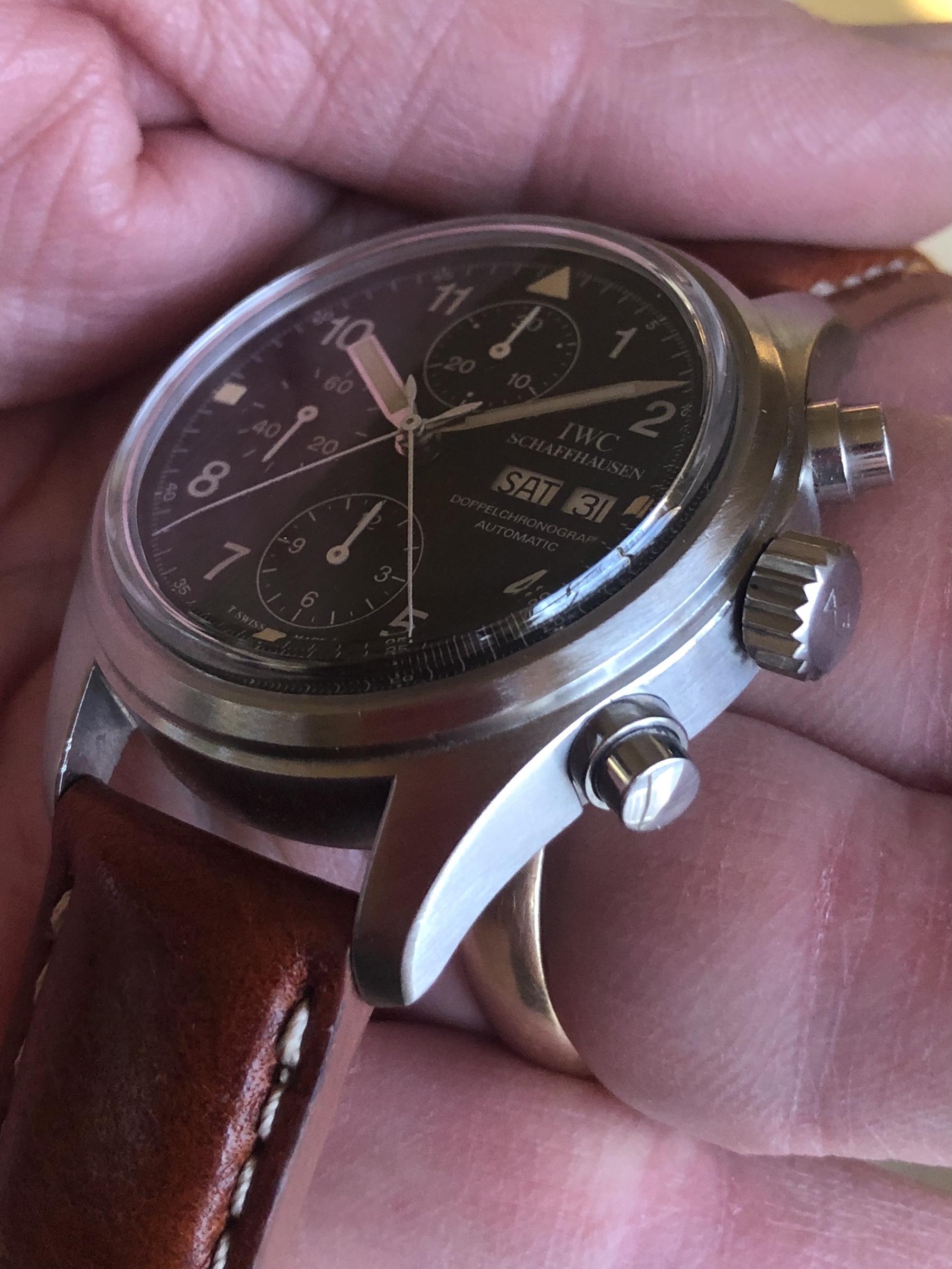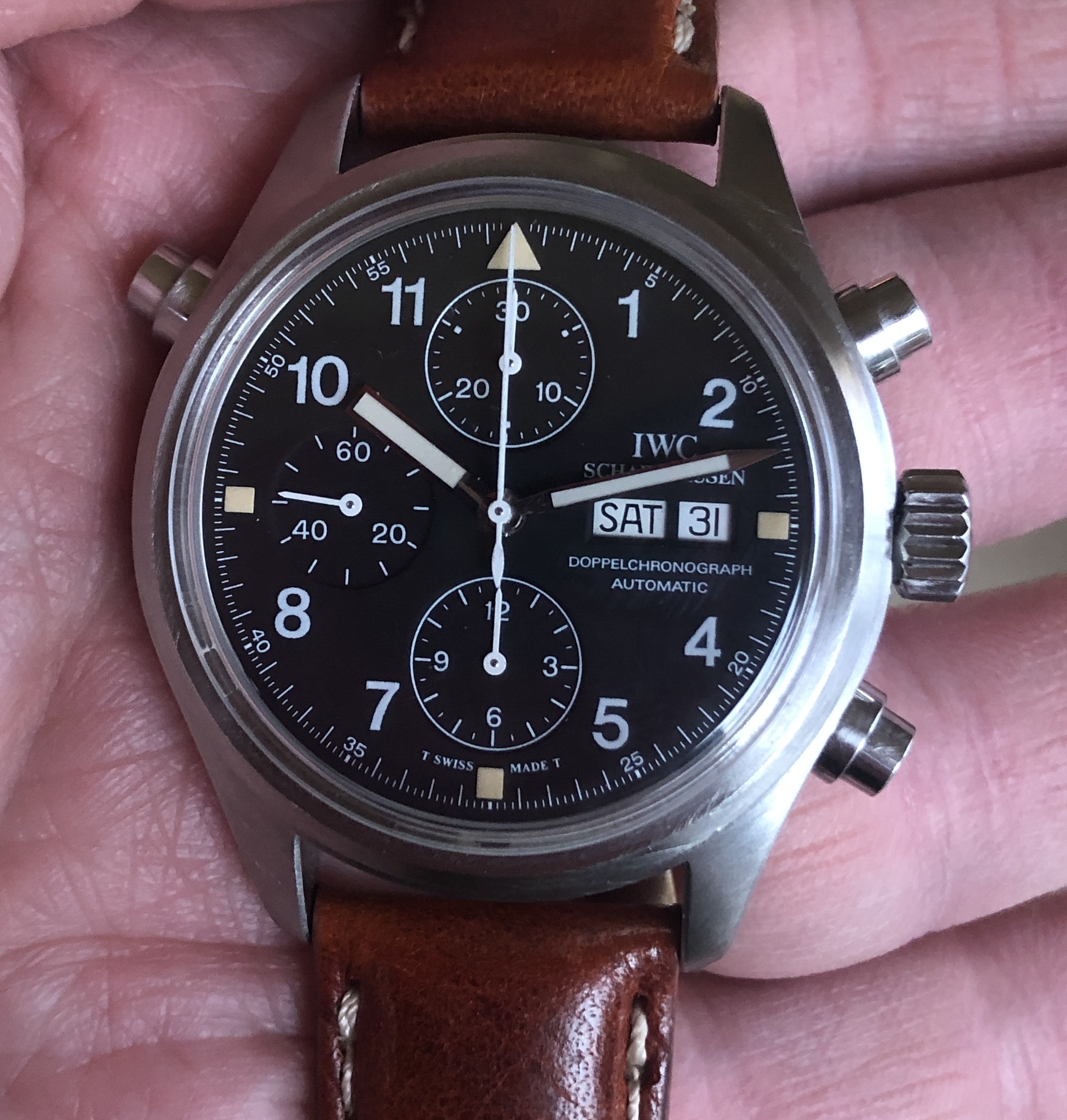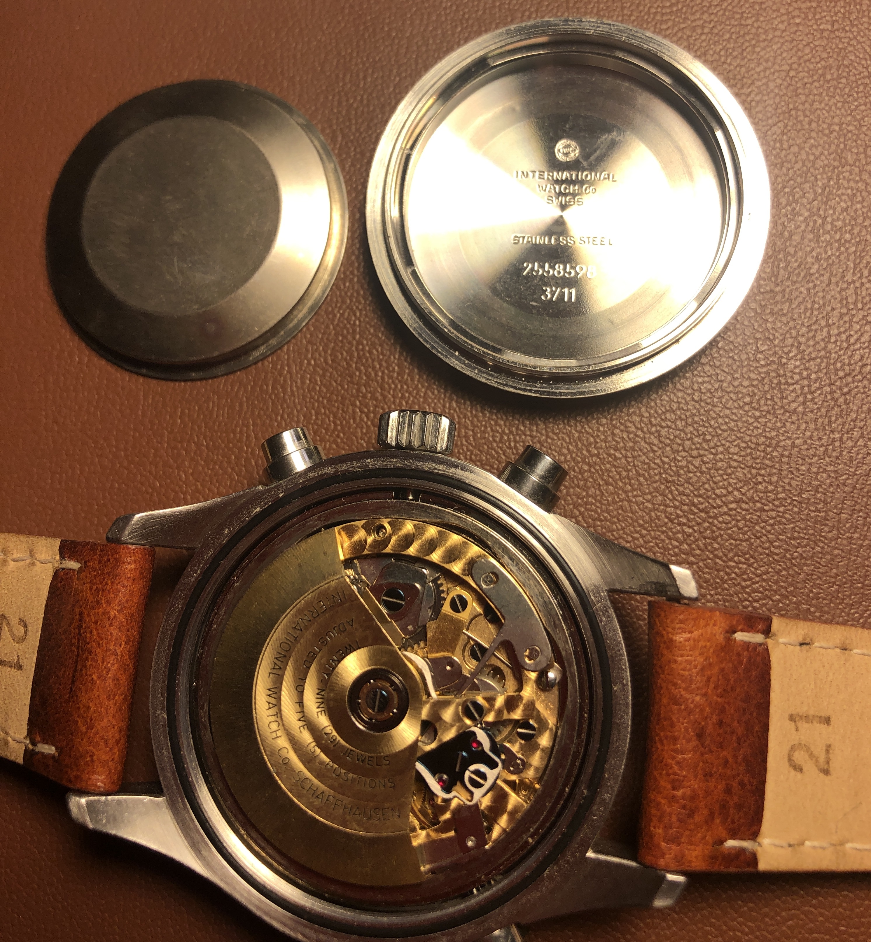 The domed sapphire crystal is unique to the 3711, and is in excellent shape with no chips or scratches. Fitted with a padded chestnut colored aftermarket strap and buckle with minor wear as shown. Original IWC branded black alligator strap and IWC buckle showing some wear is also included.
